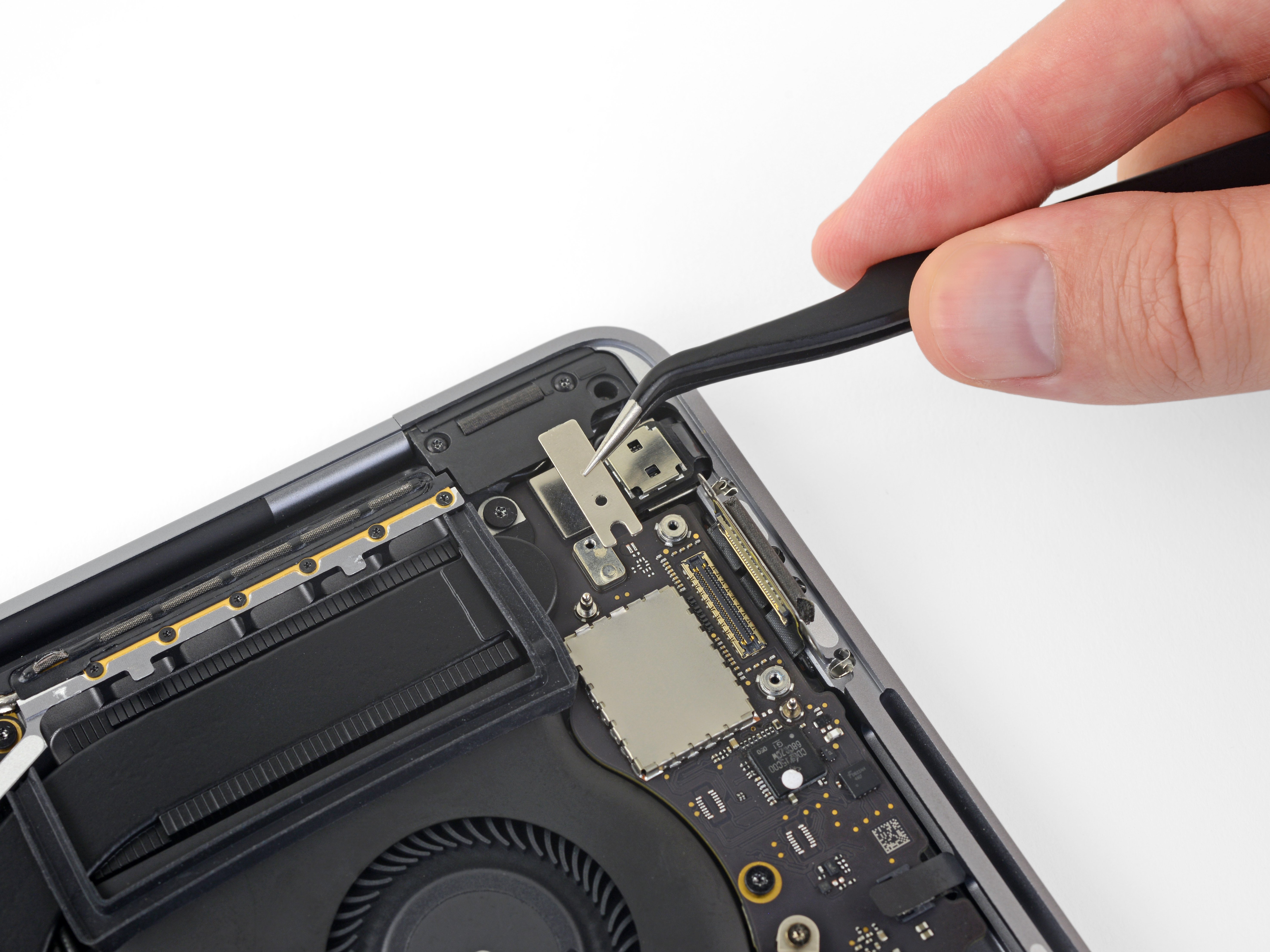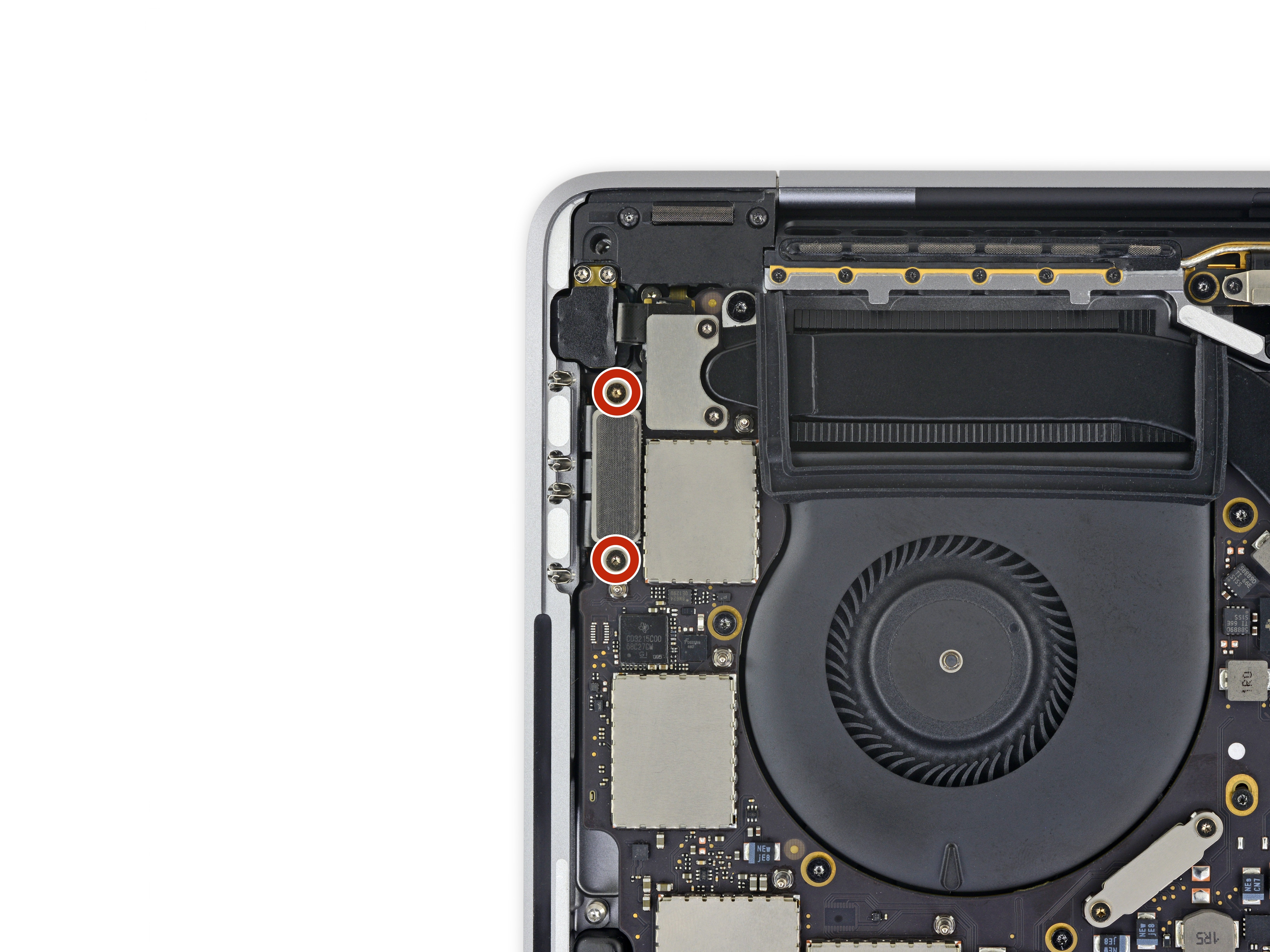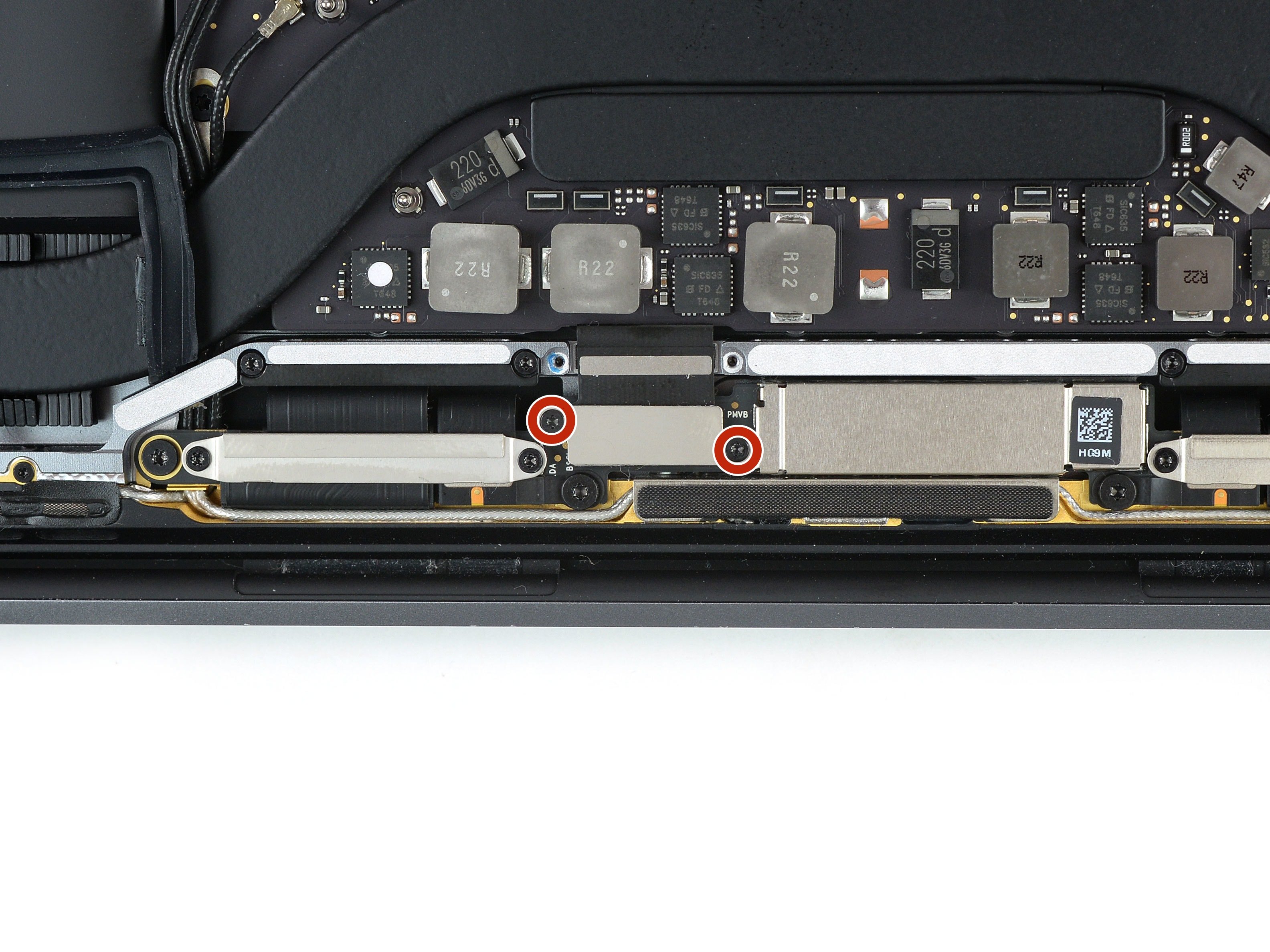 - Remove two 1.4 mm screws from the Thunderbolt port connector bracket on the left.