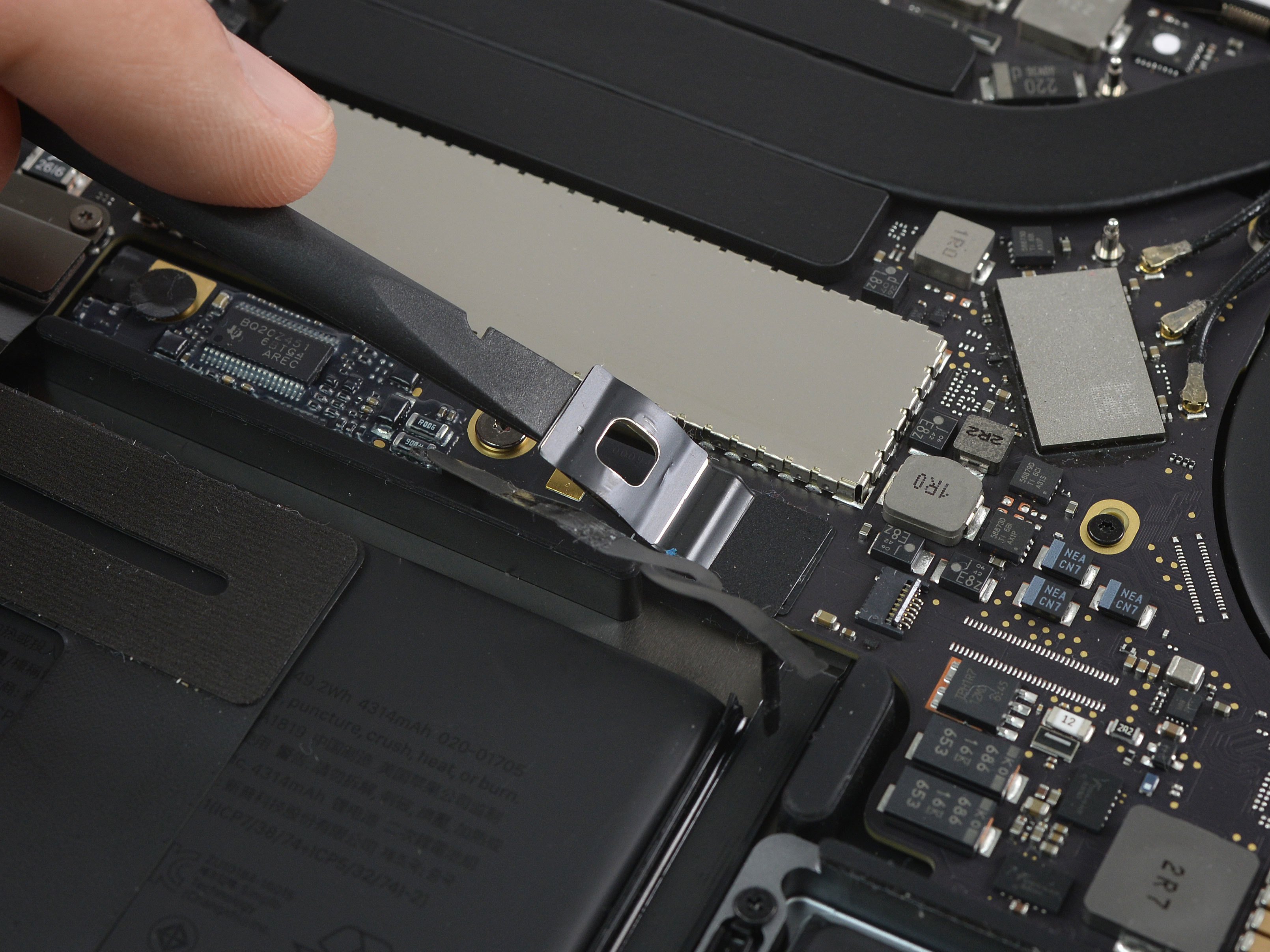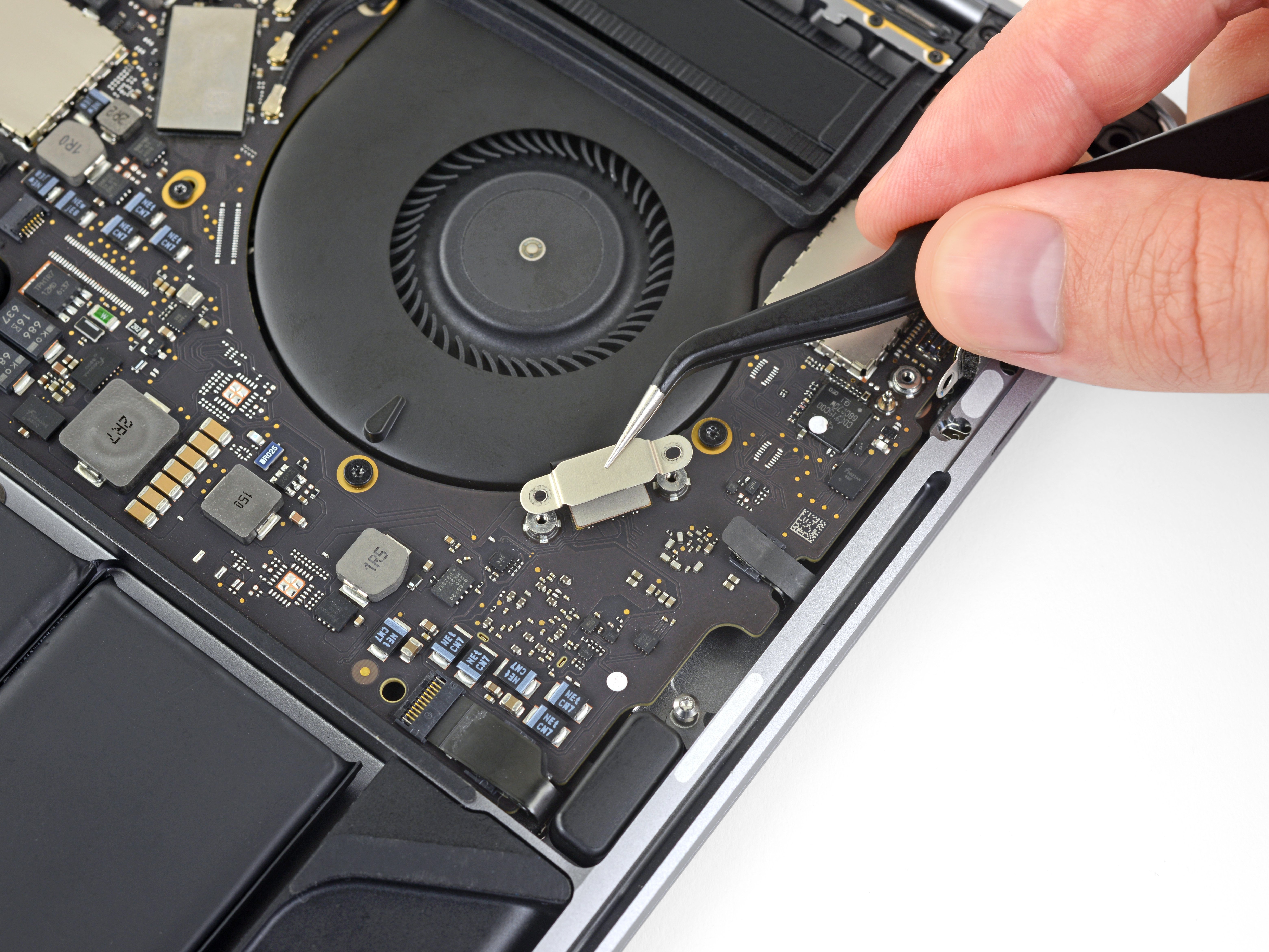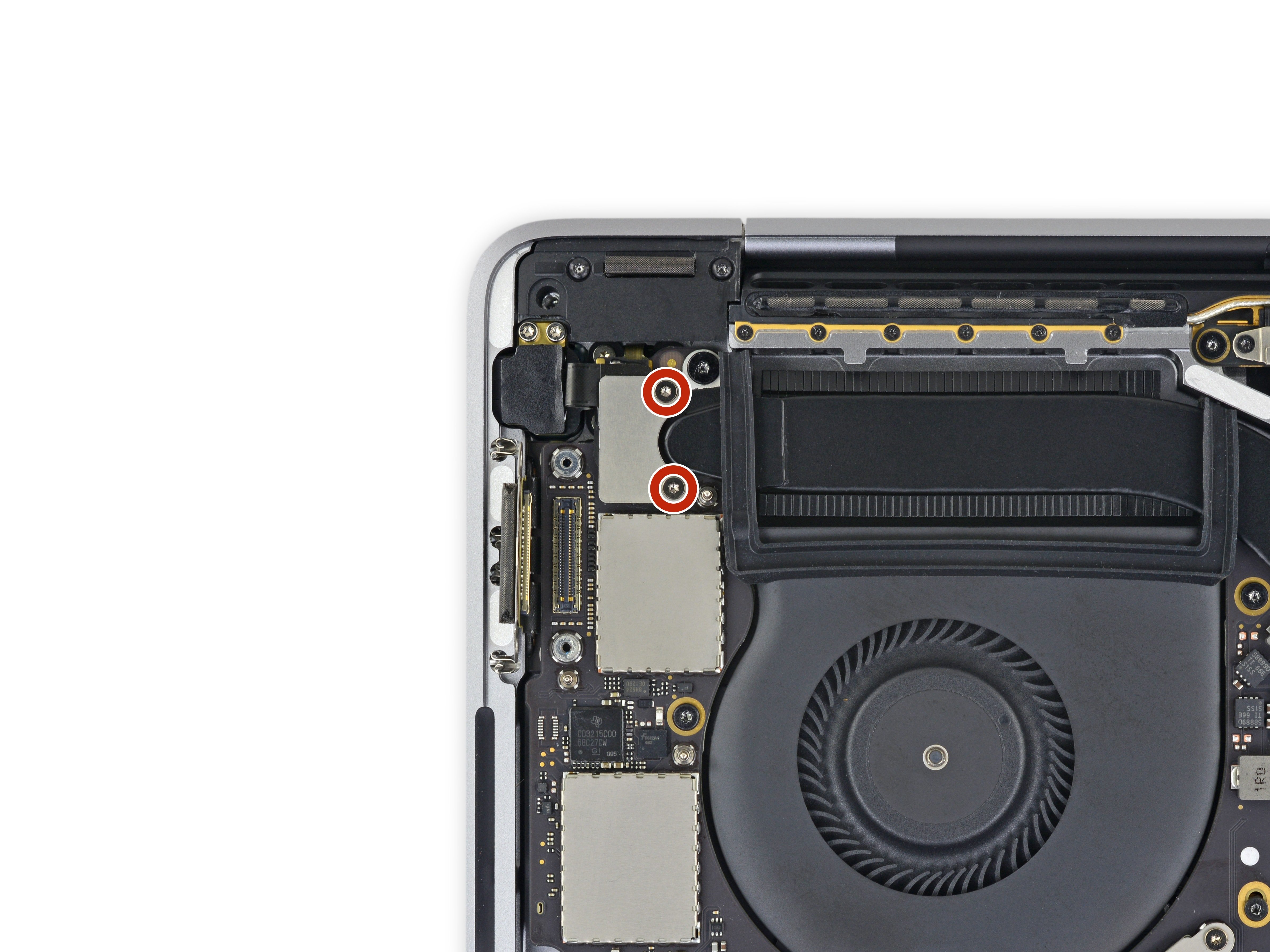 - Remove two 1.4 mm screws from the Thunderbolt port connector bracket on the left.