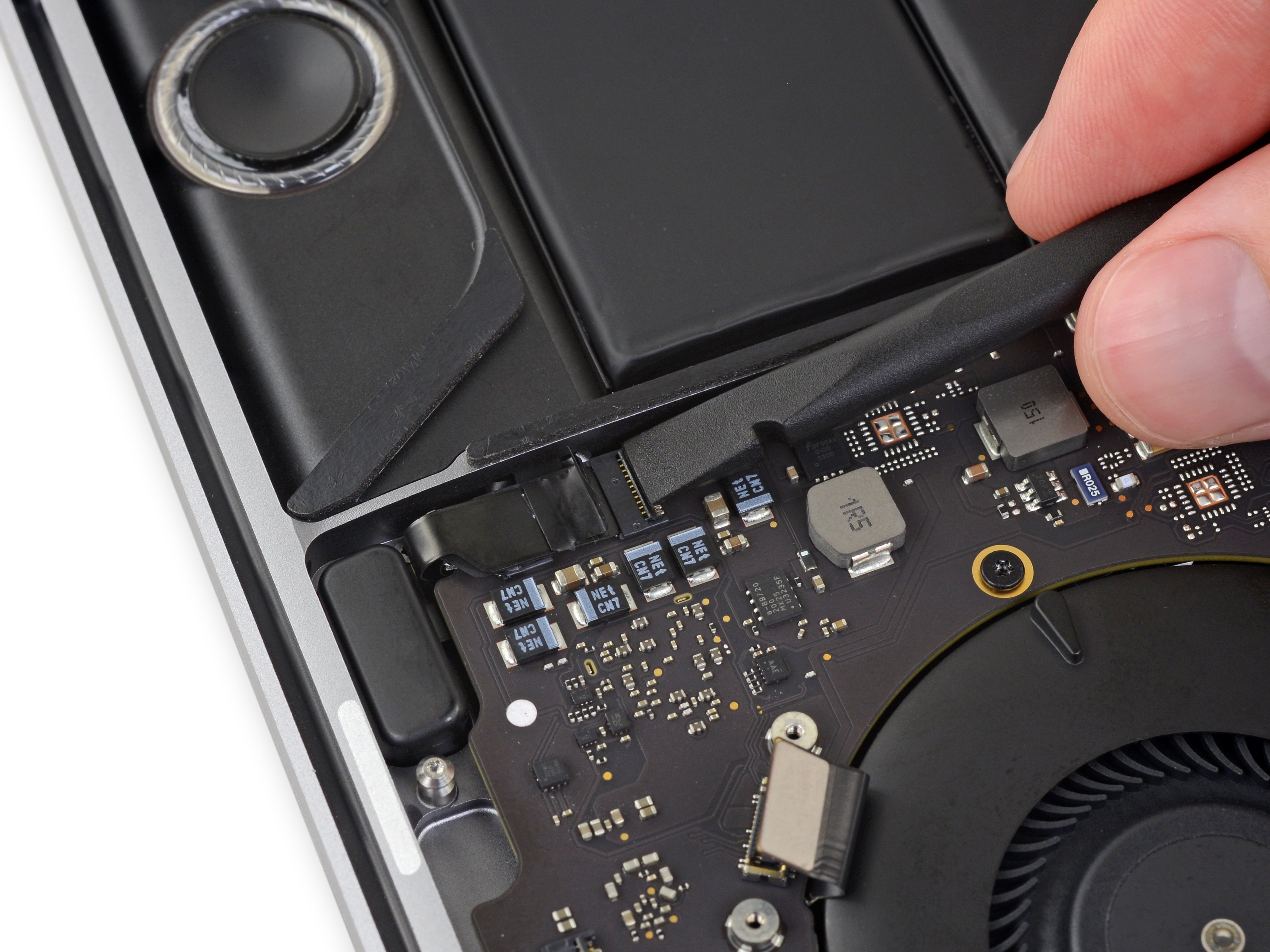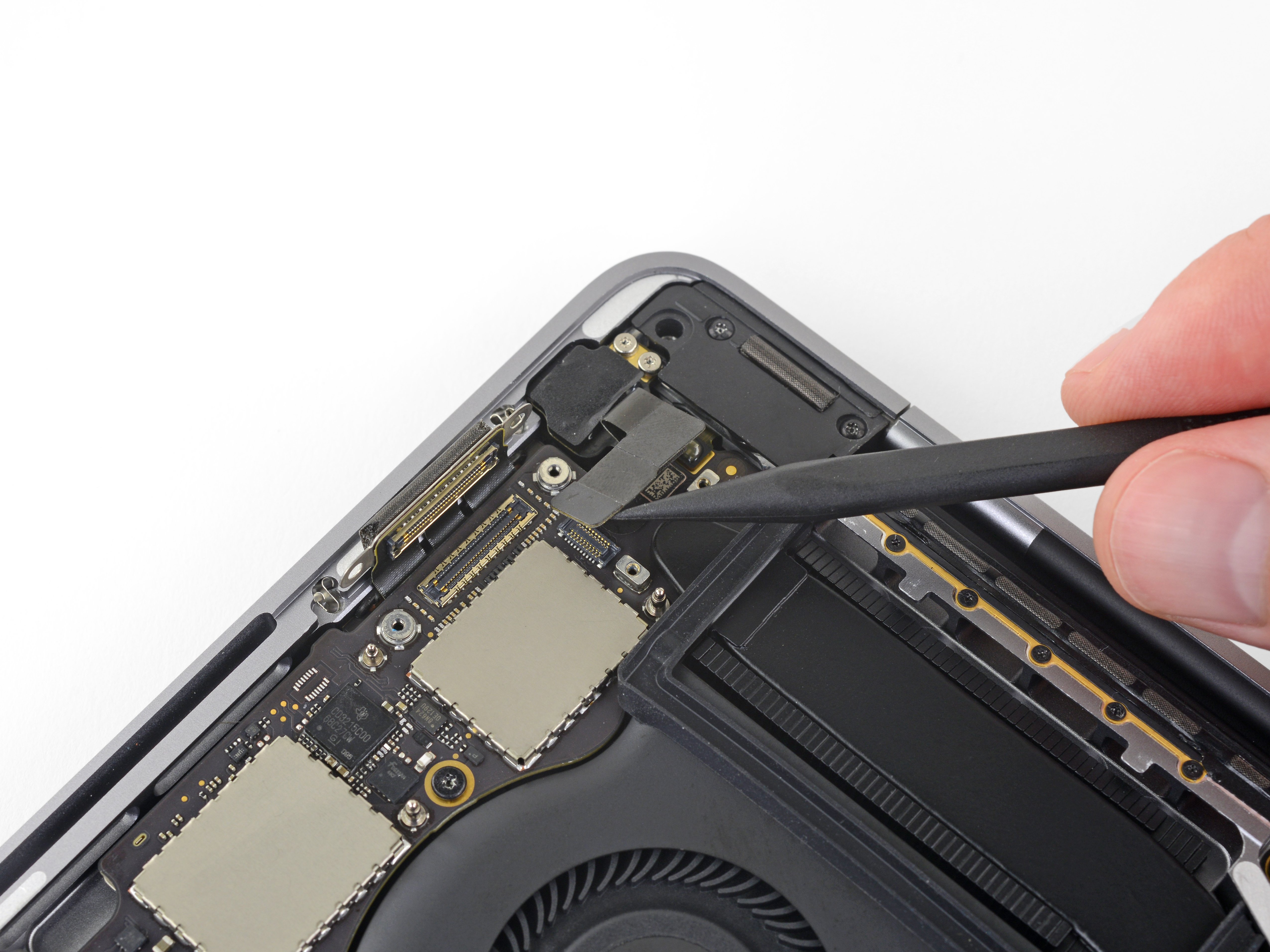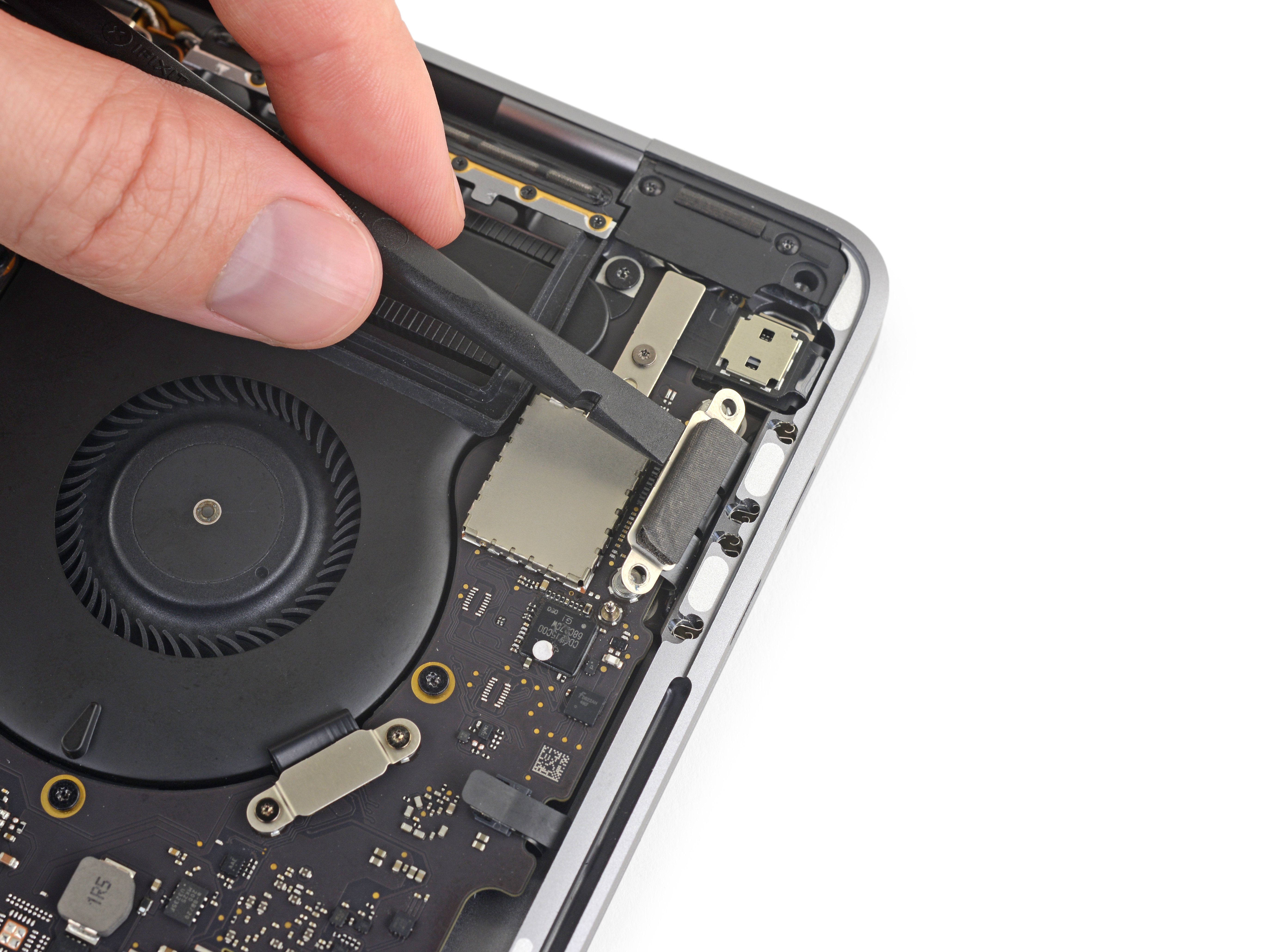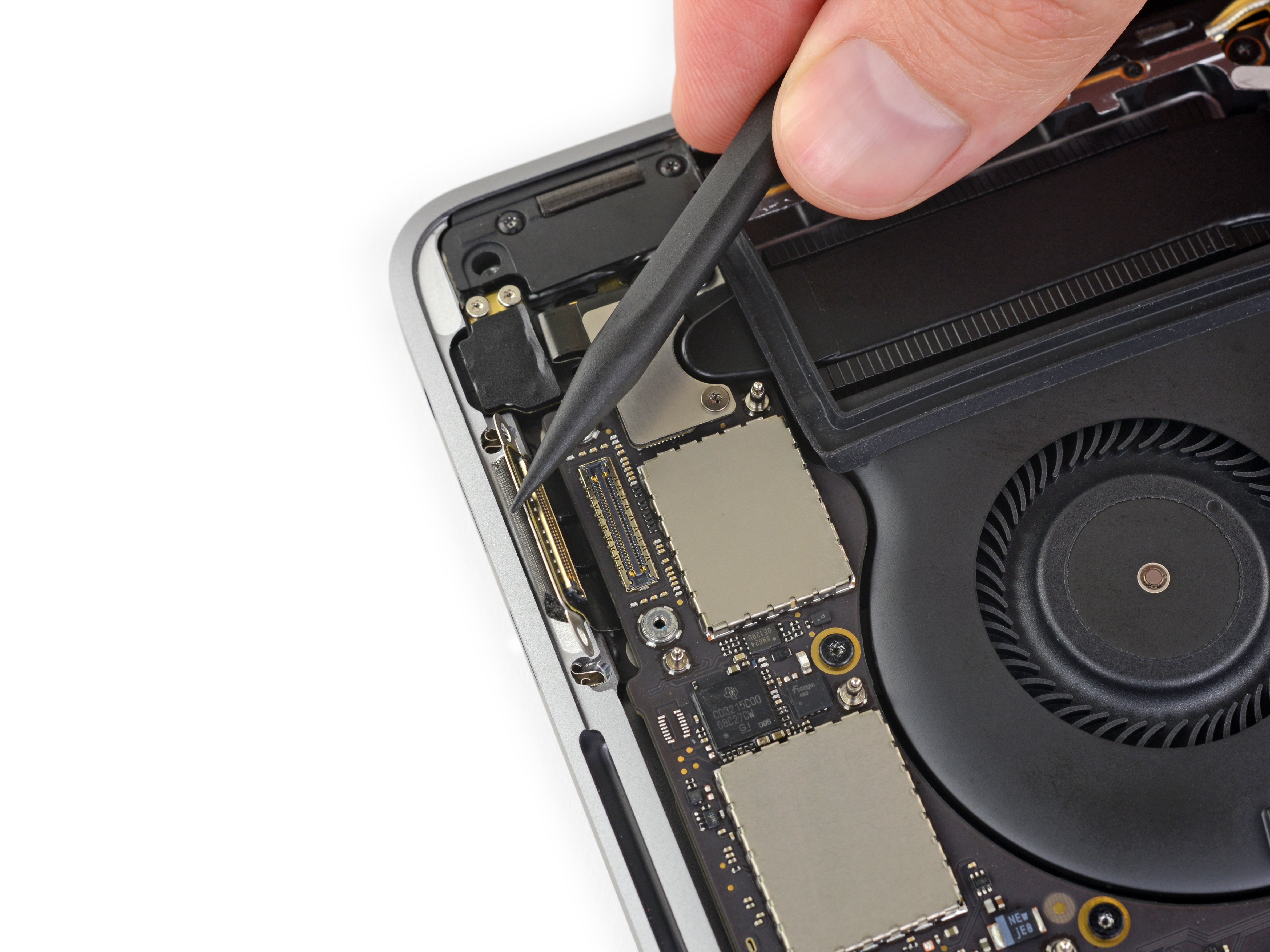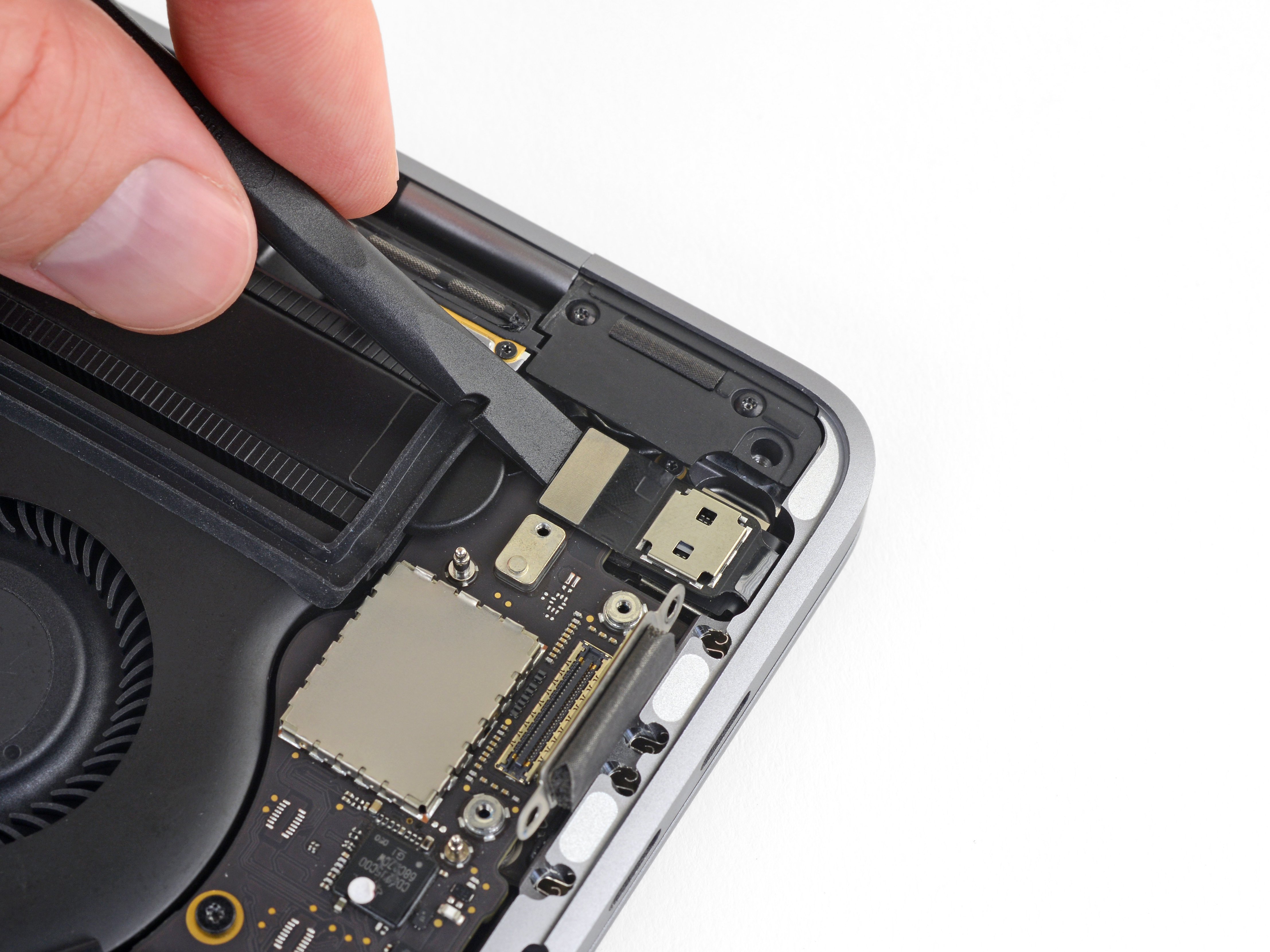 - Use a spudger to disconnect the left-side Thunderbolt port connector by prying it straight up from the logic board.