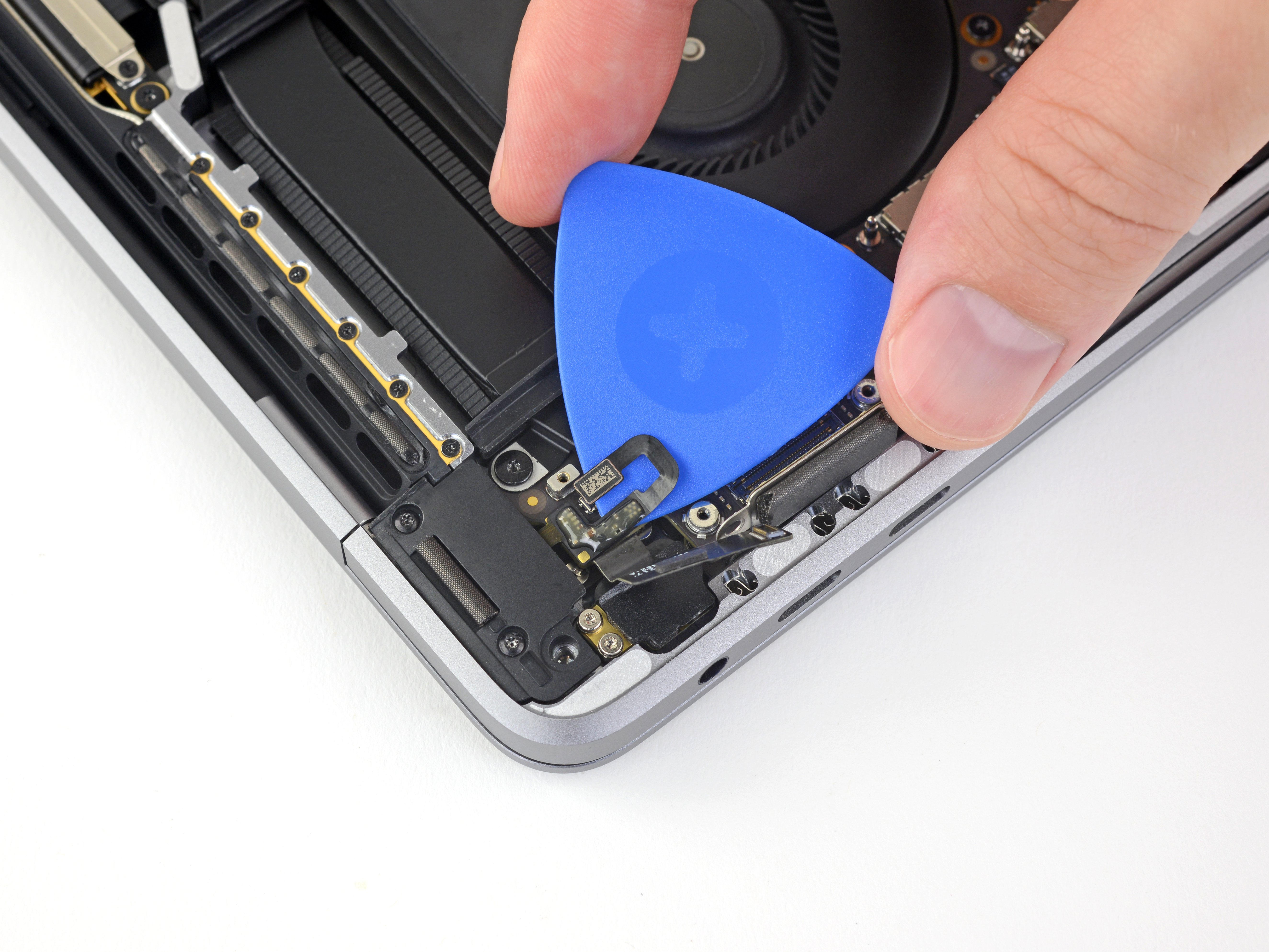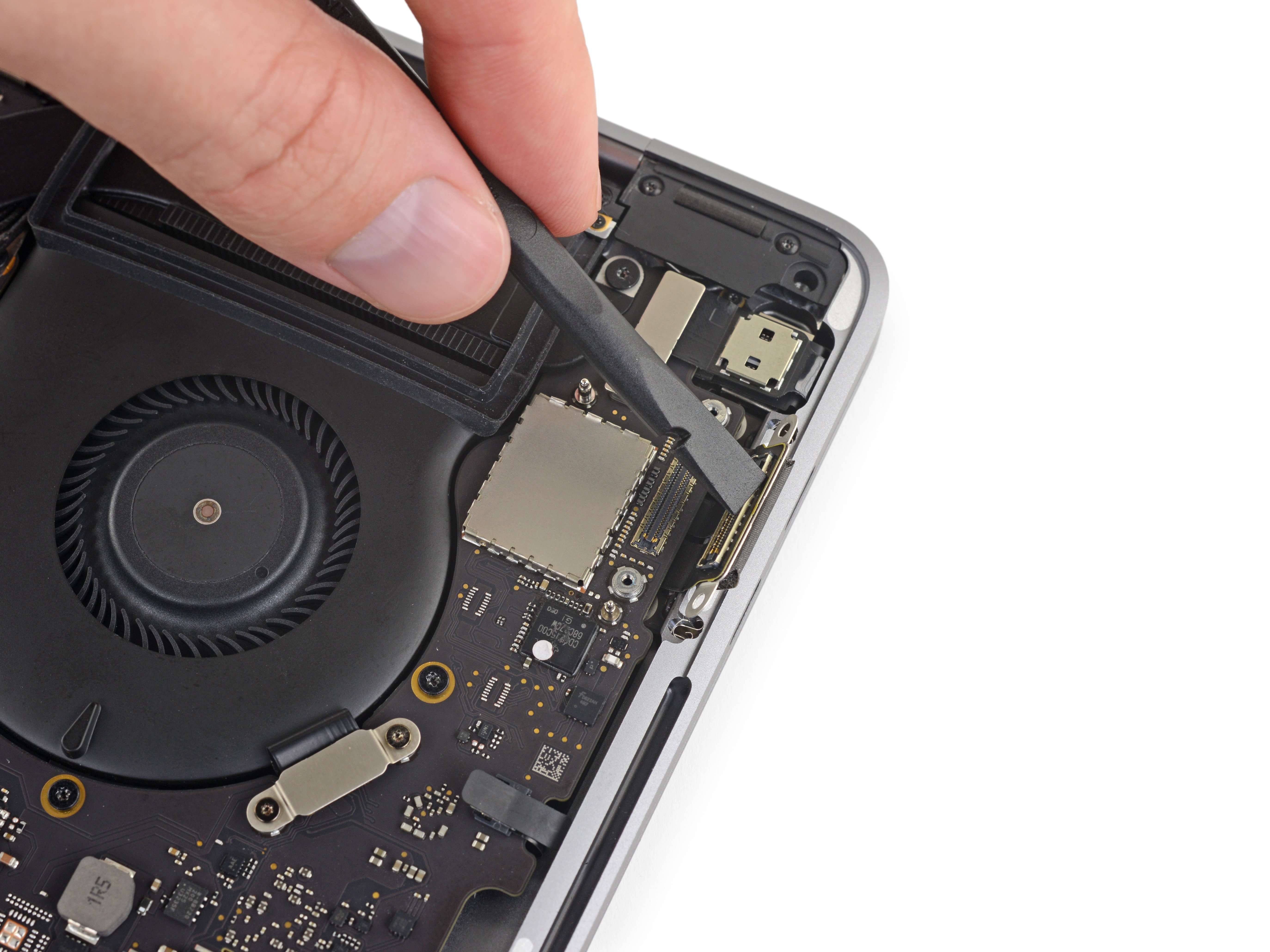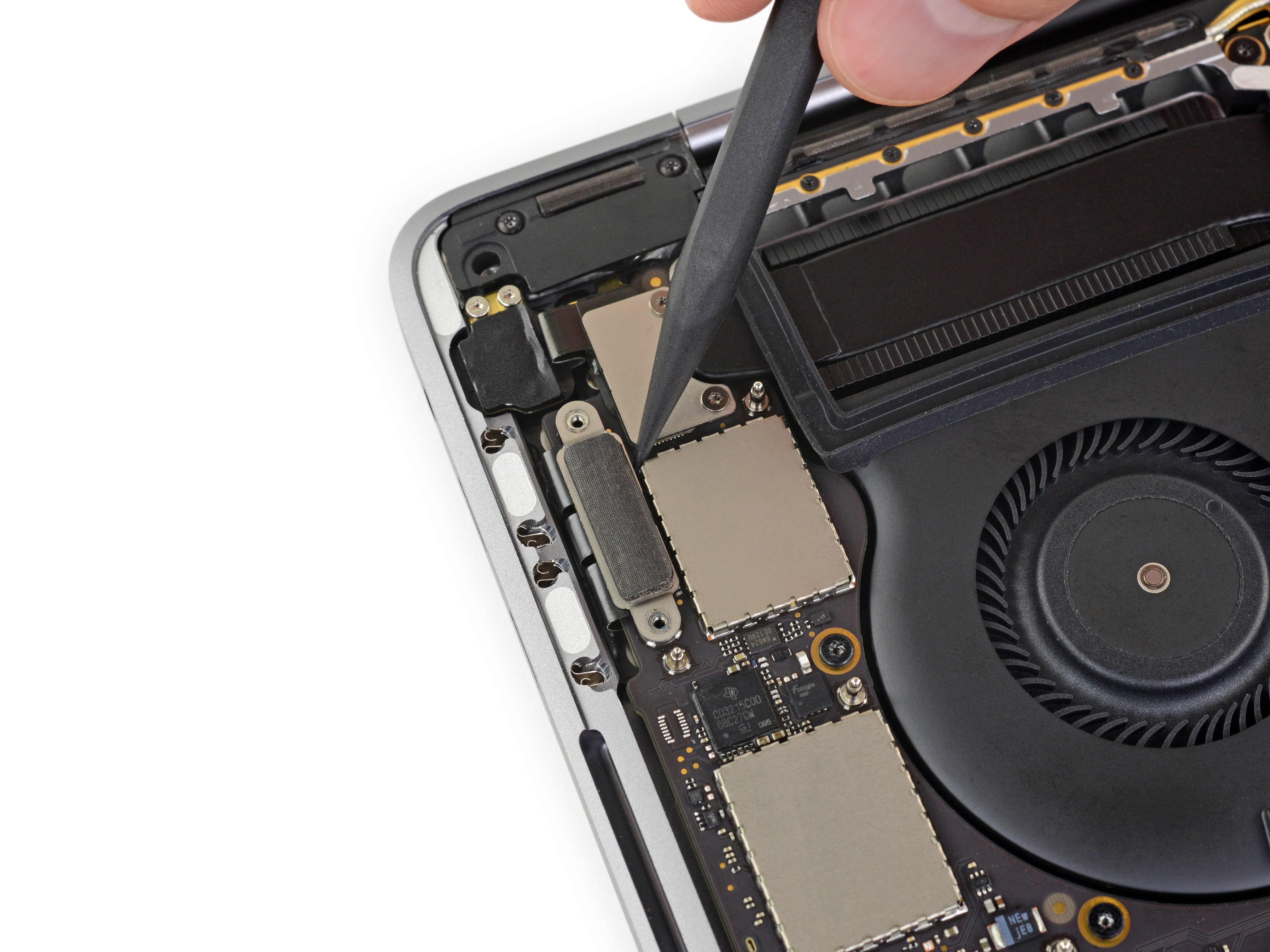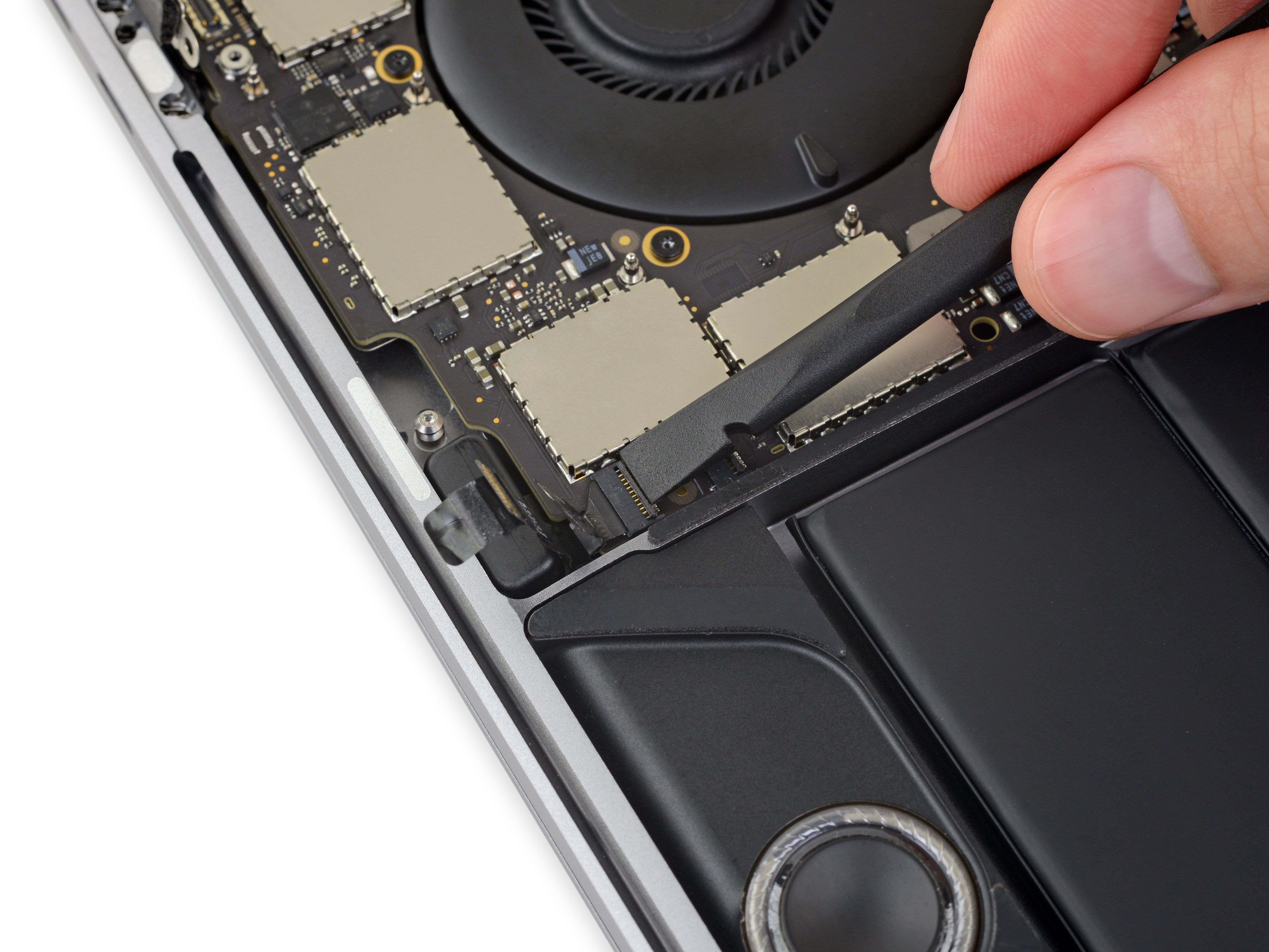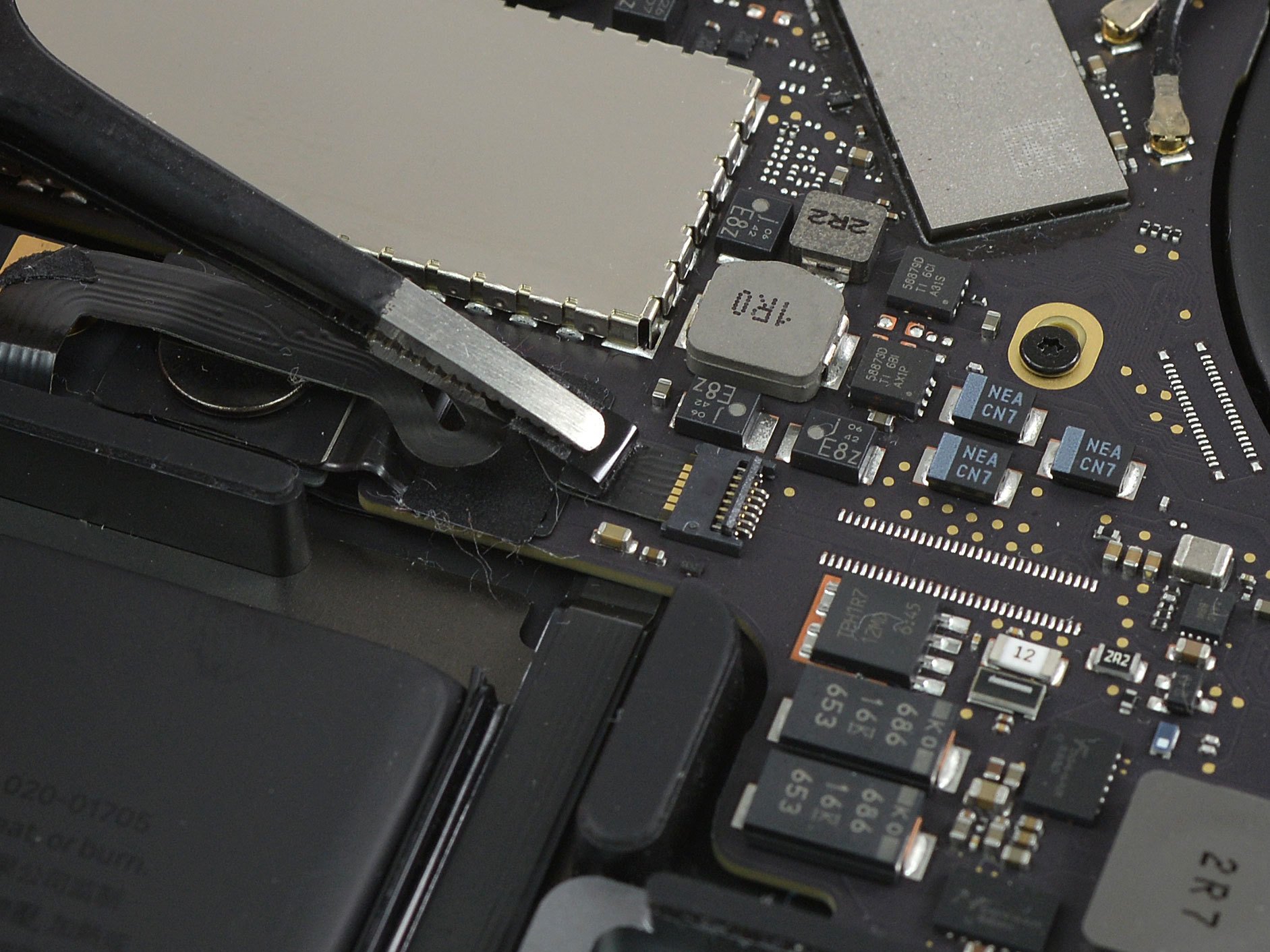 - Use a spudger to disconnect the left-side Thunderbolt port connector by prying it straight up from the logic board.