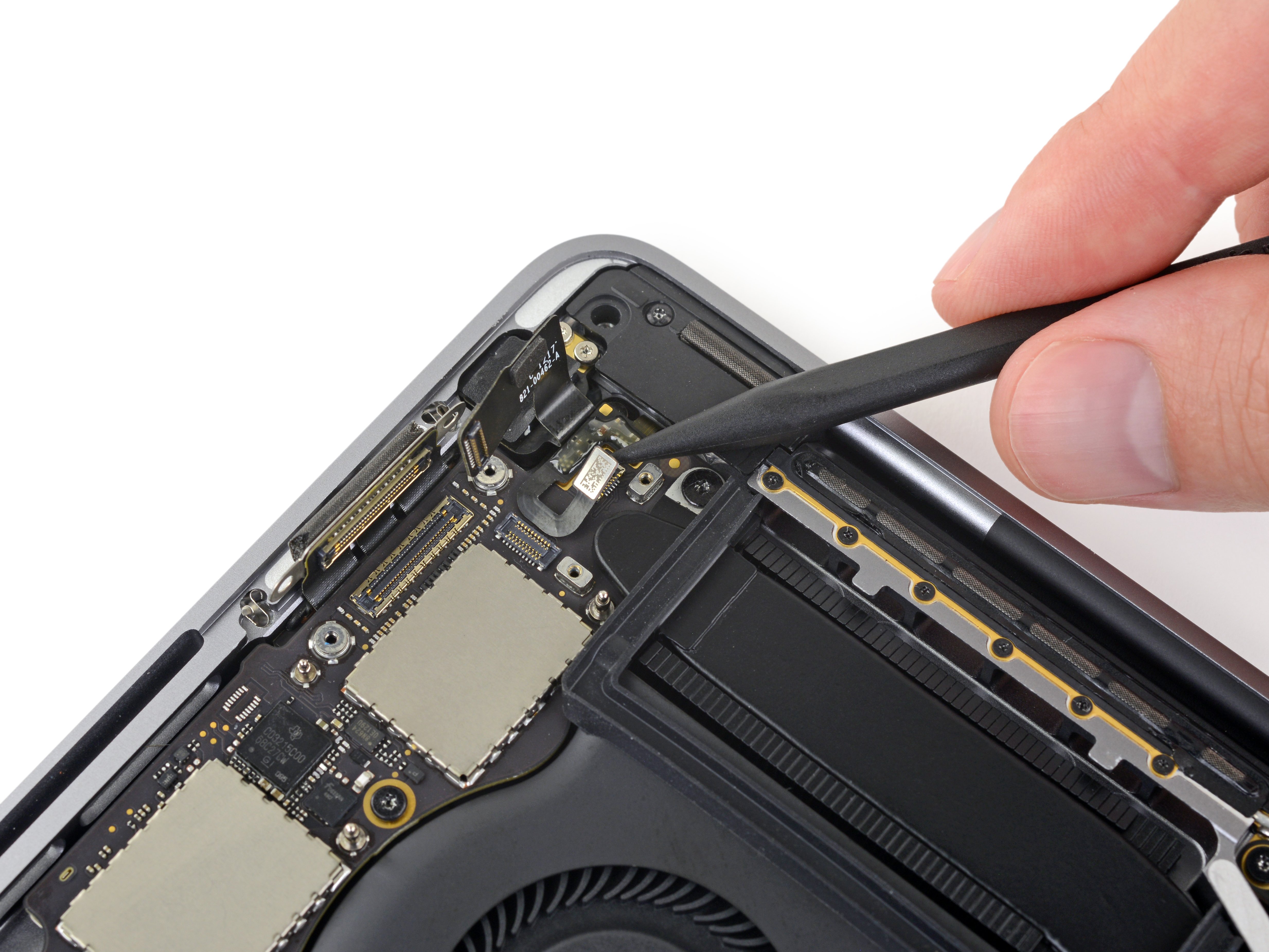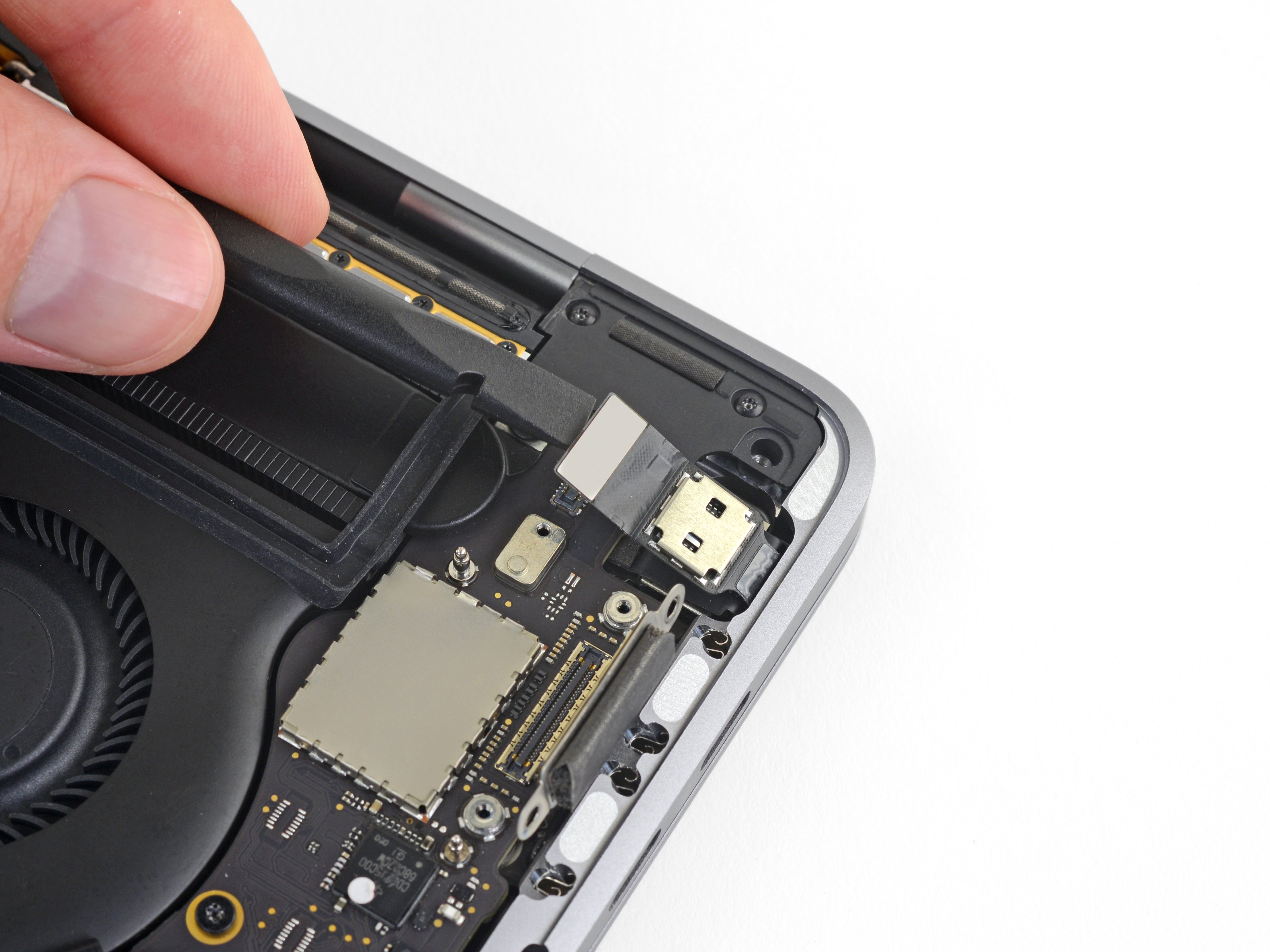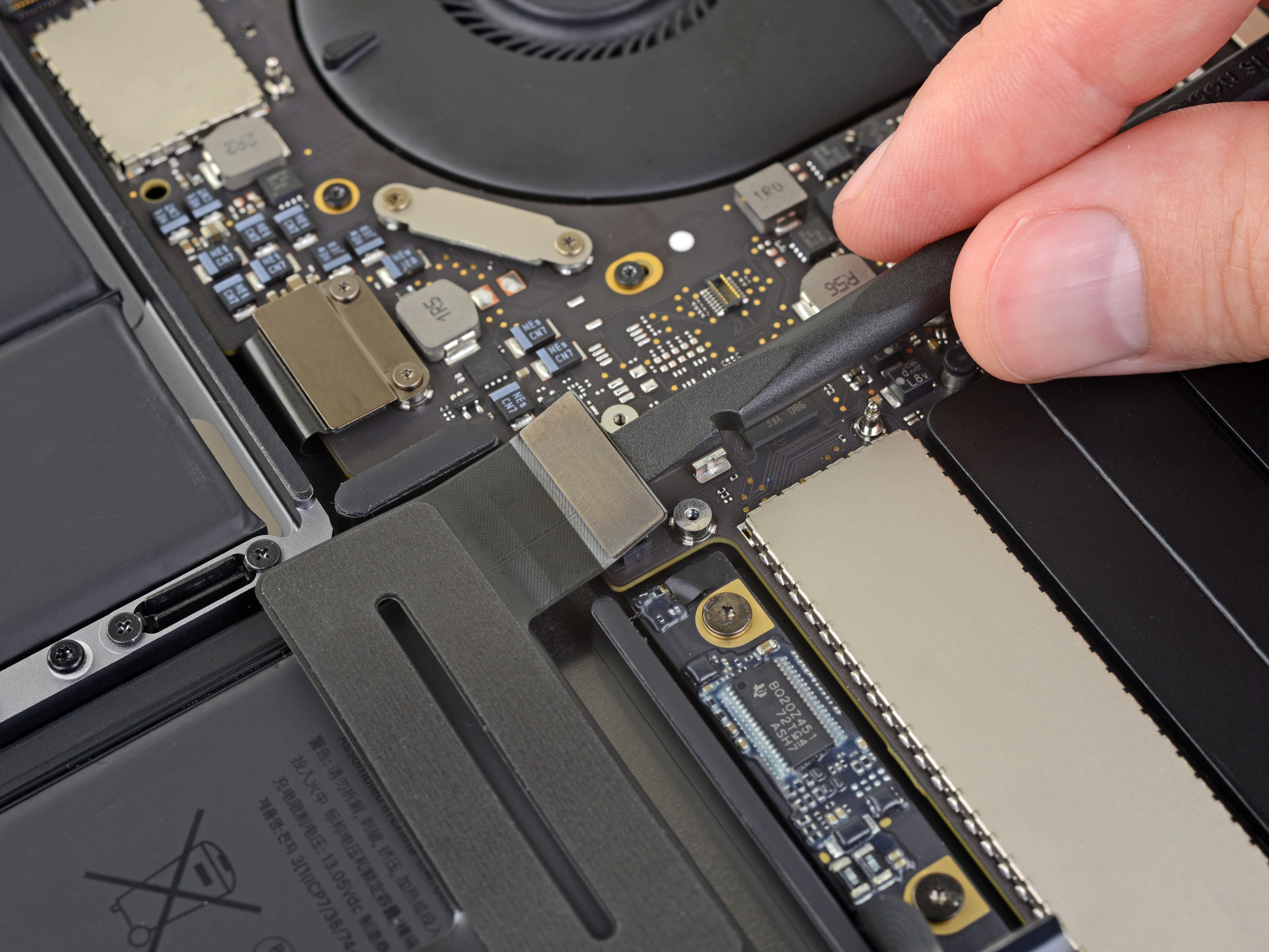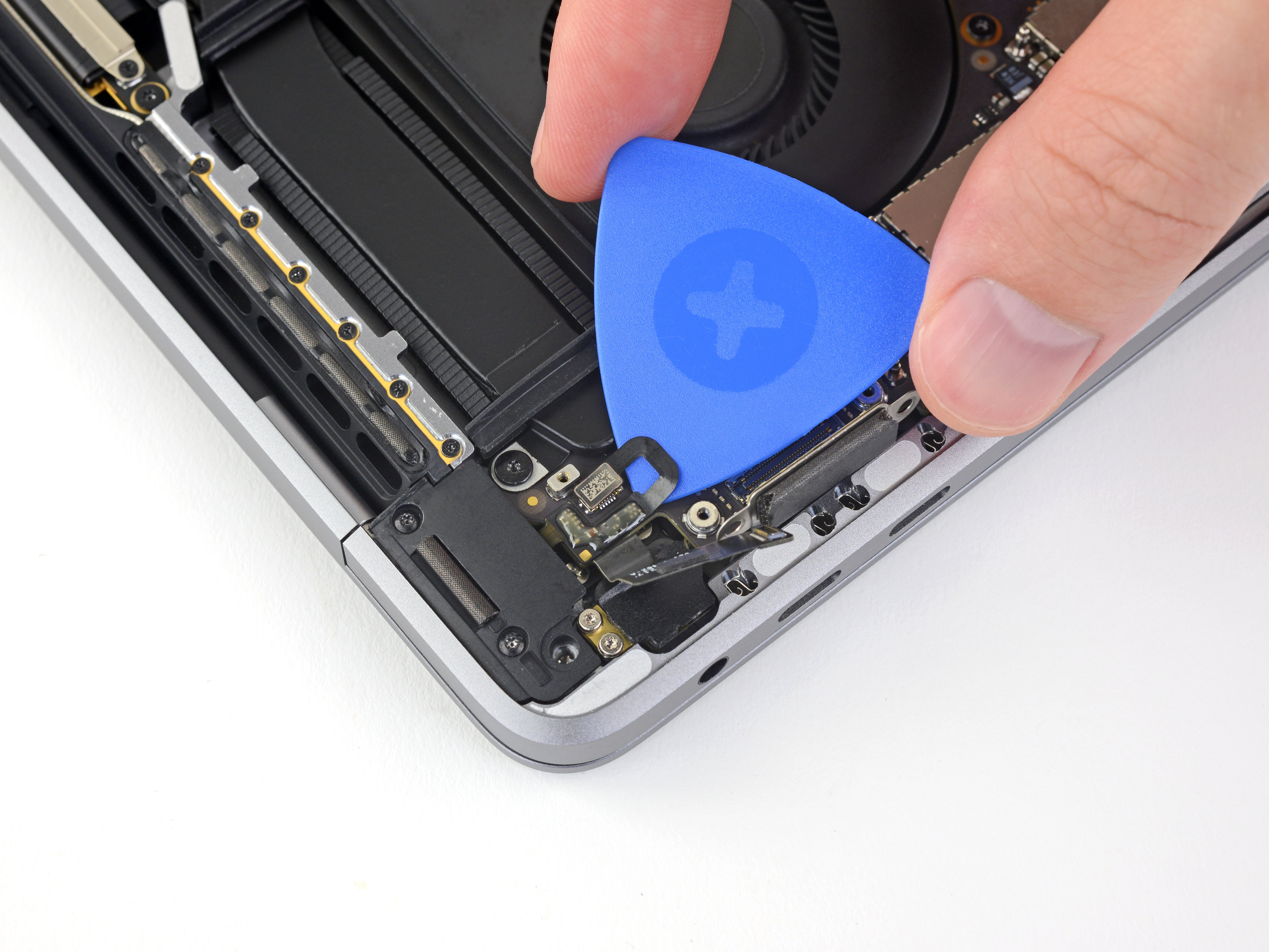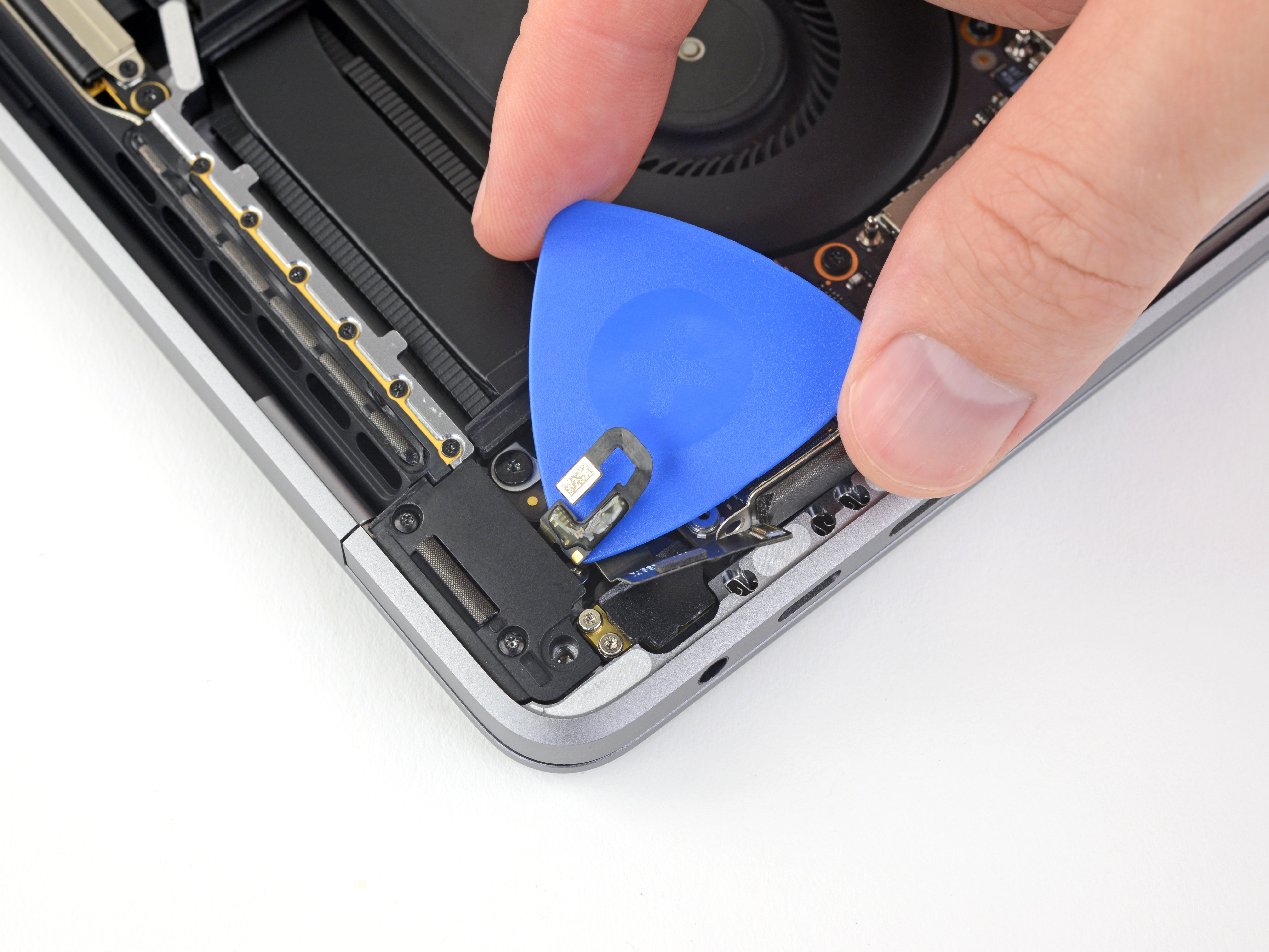 - Use a spudger to disconnect the left-side Thunderbolt port connector by prying it straight up from the logic board.
