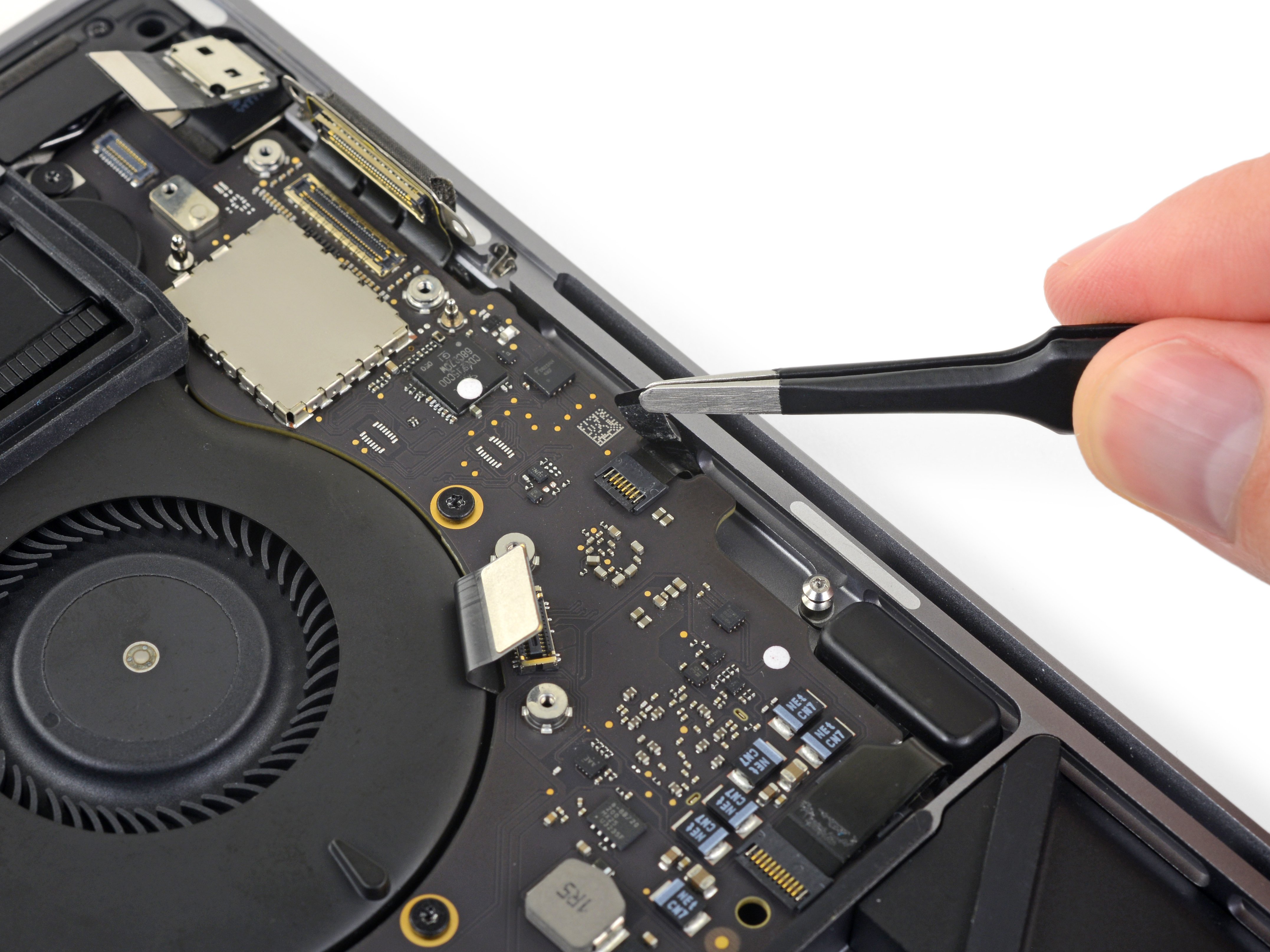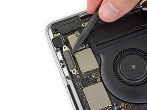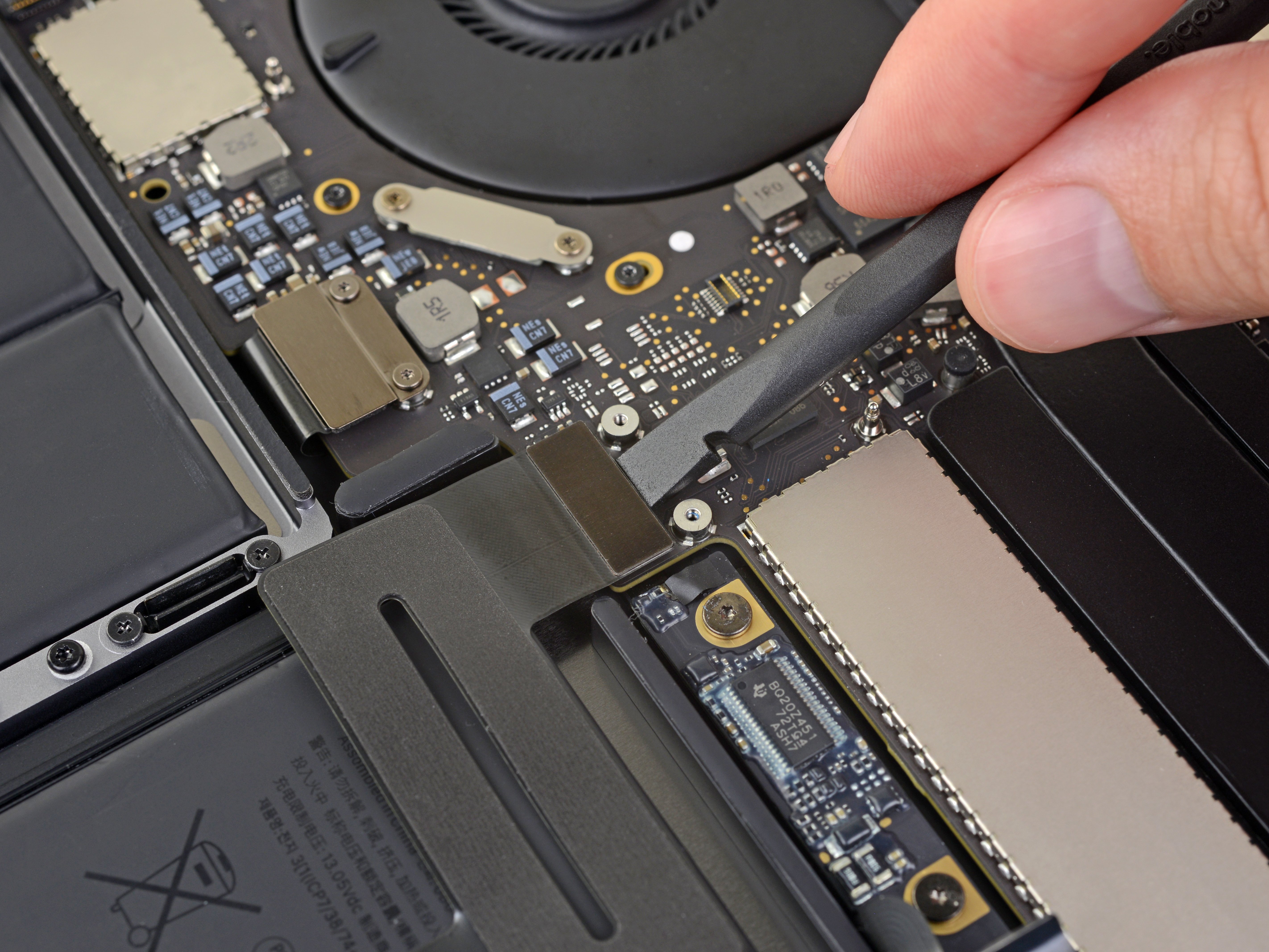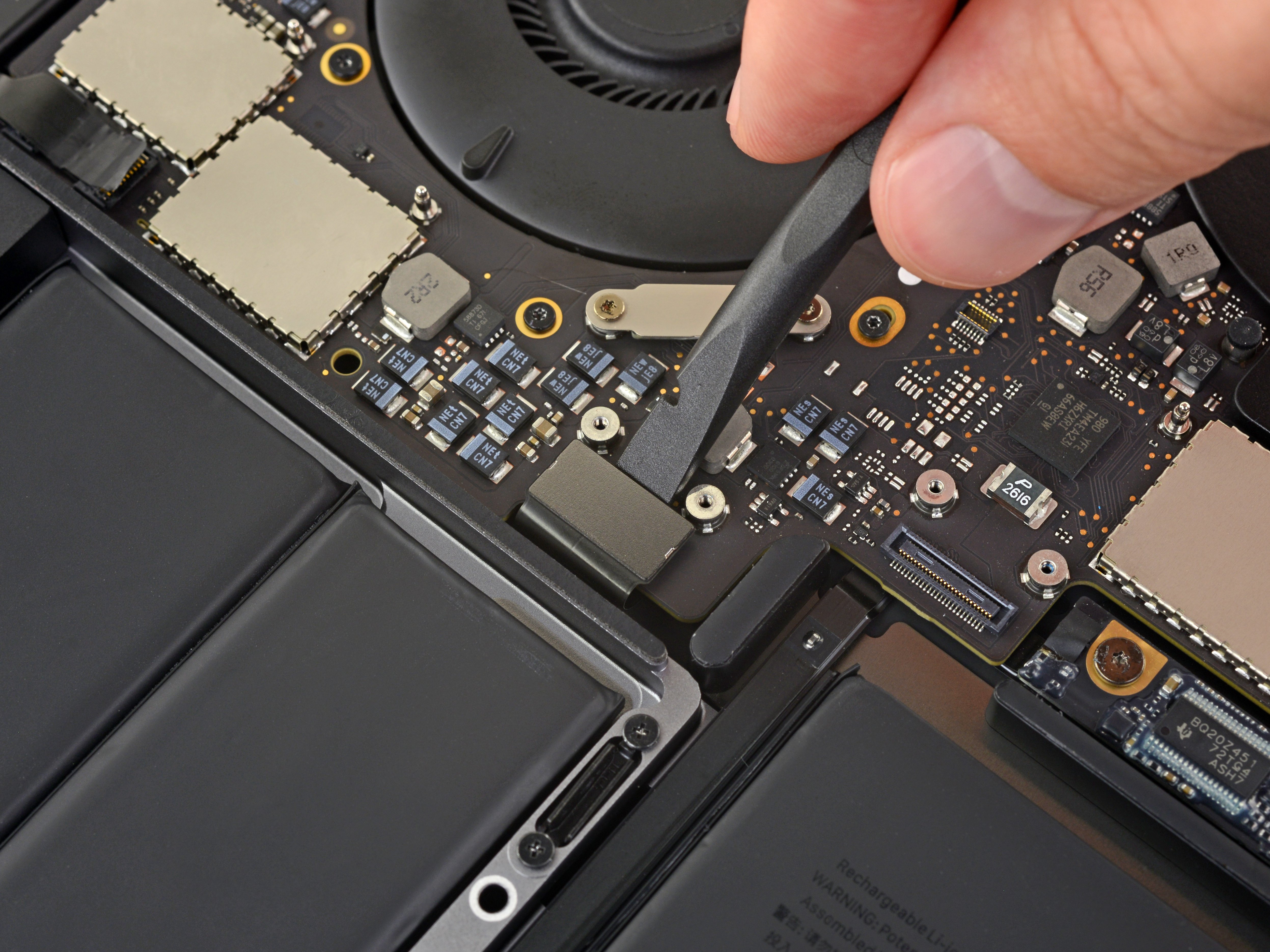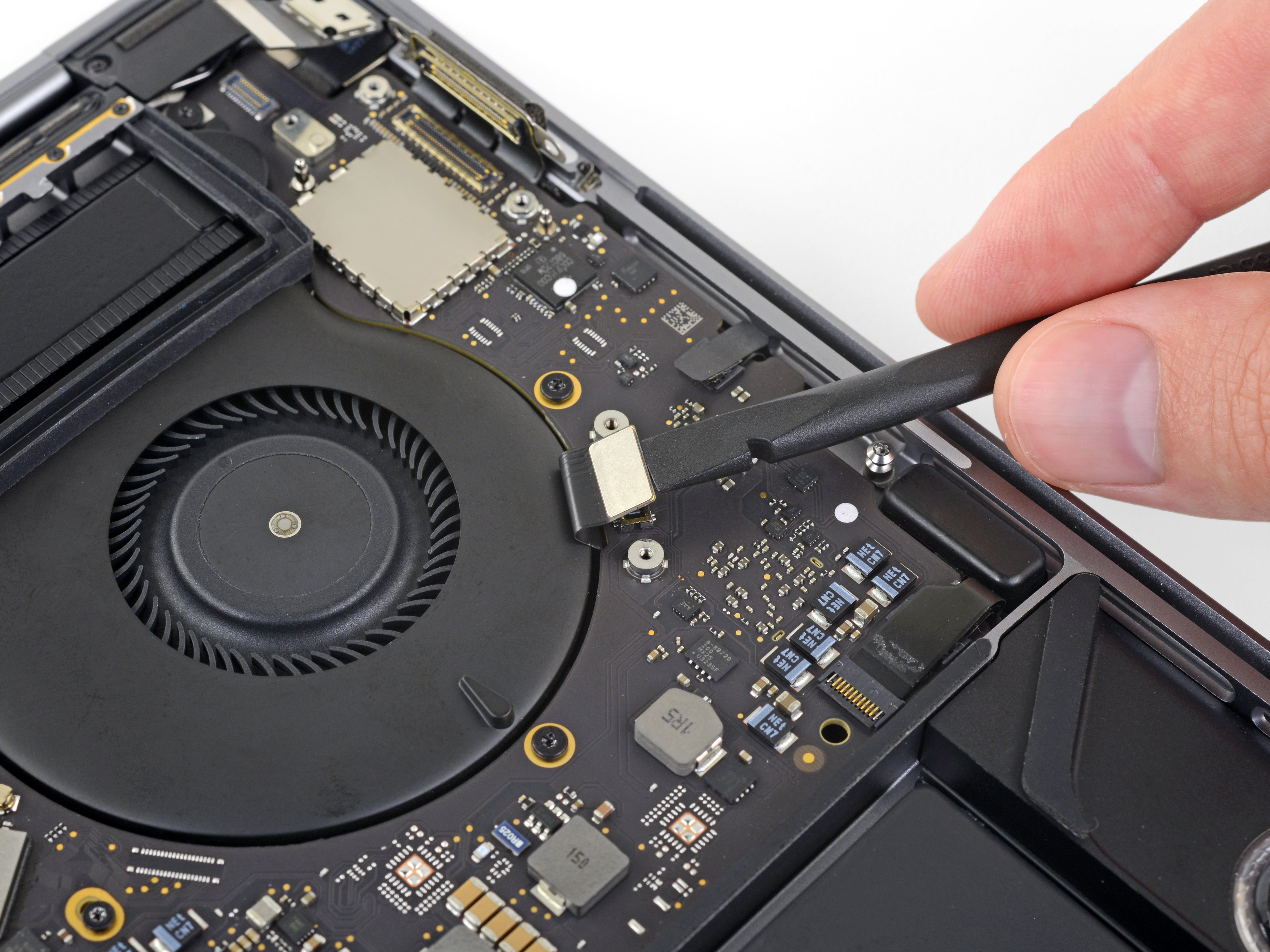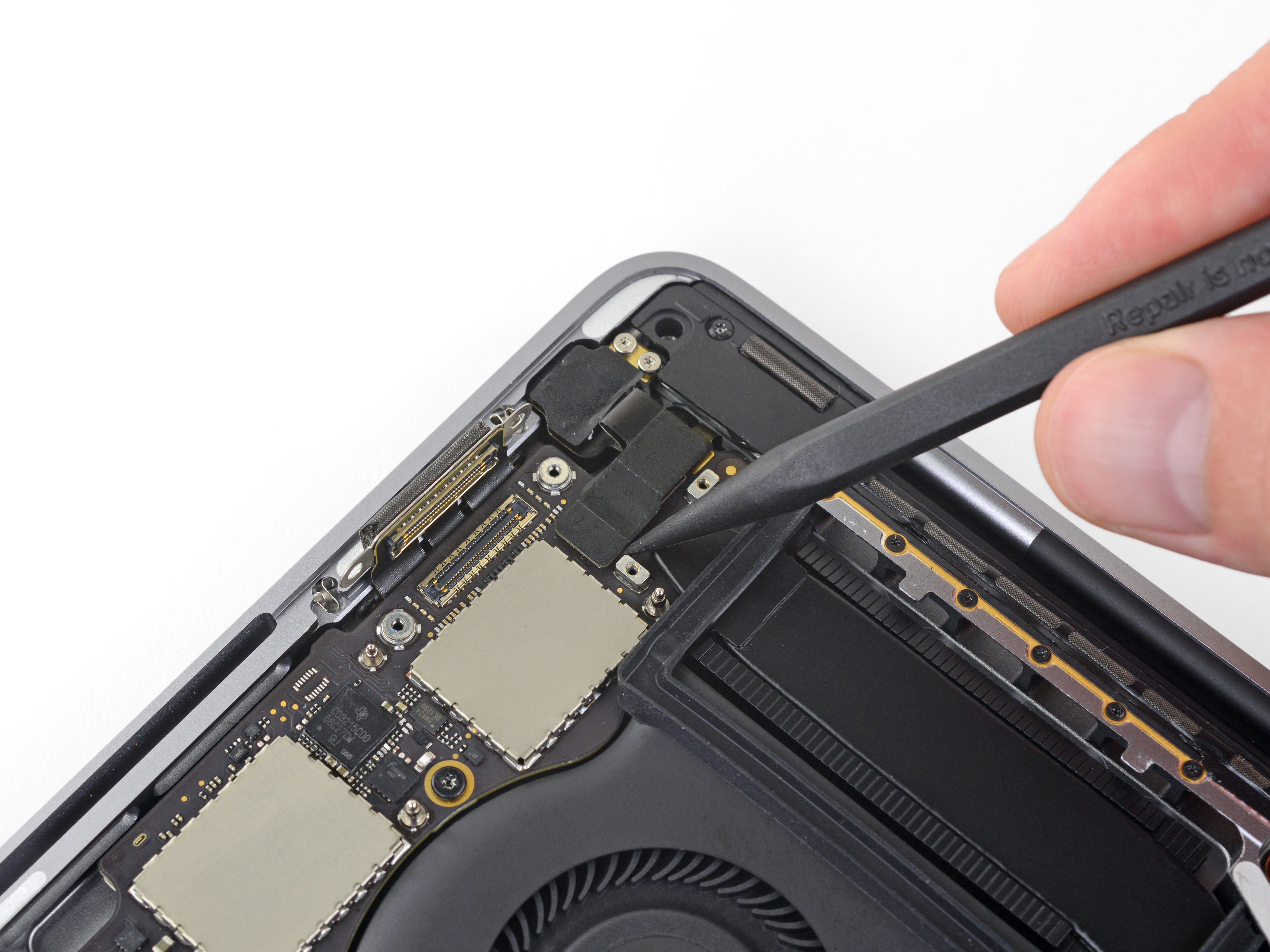 - Use a spudger to disconnect the left-side Thunderbolt port connector by prying it straight up from the logic board.