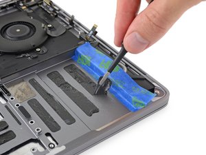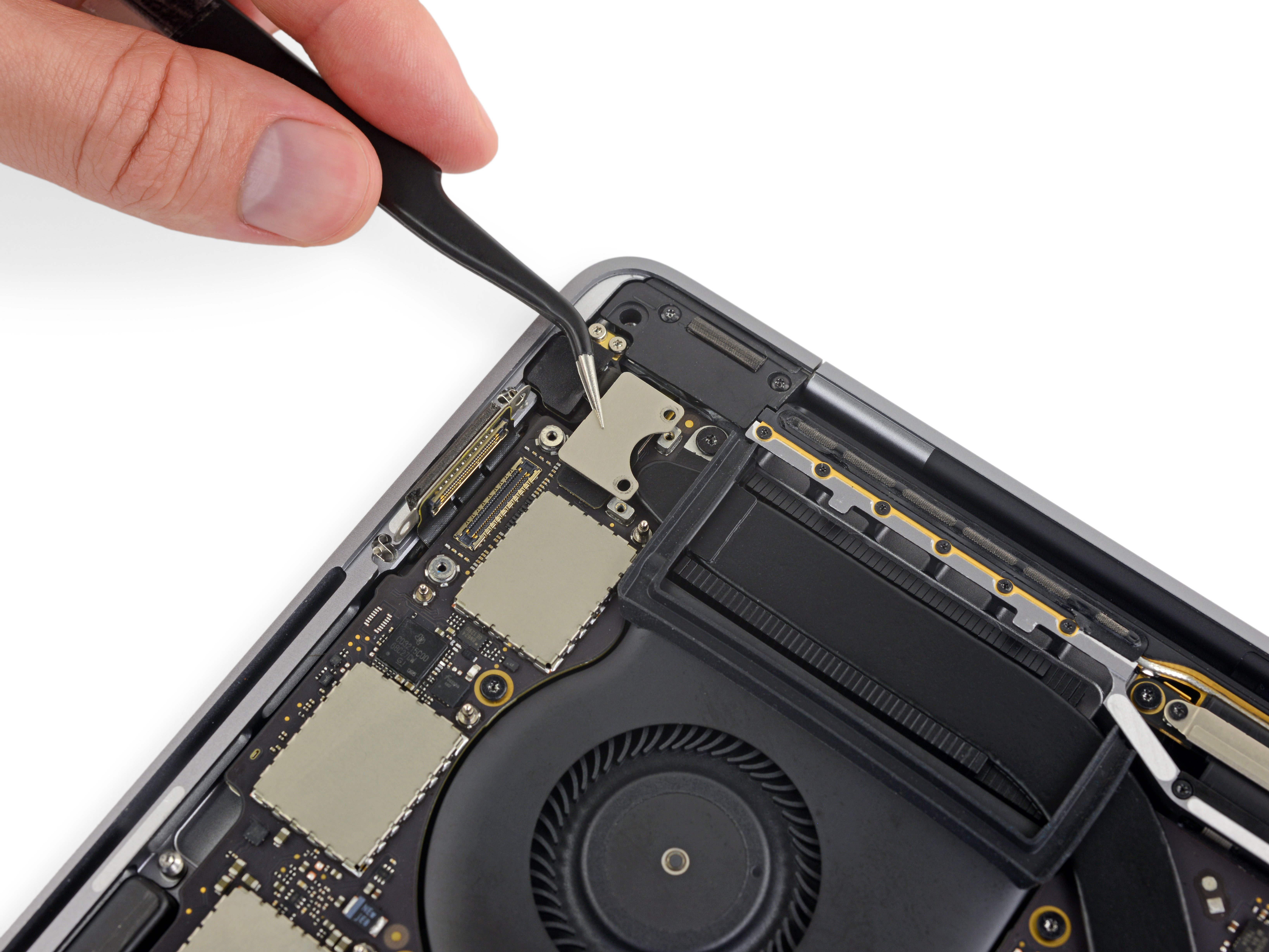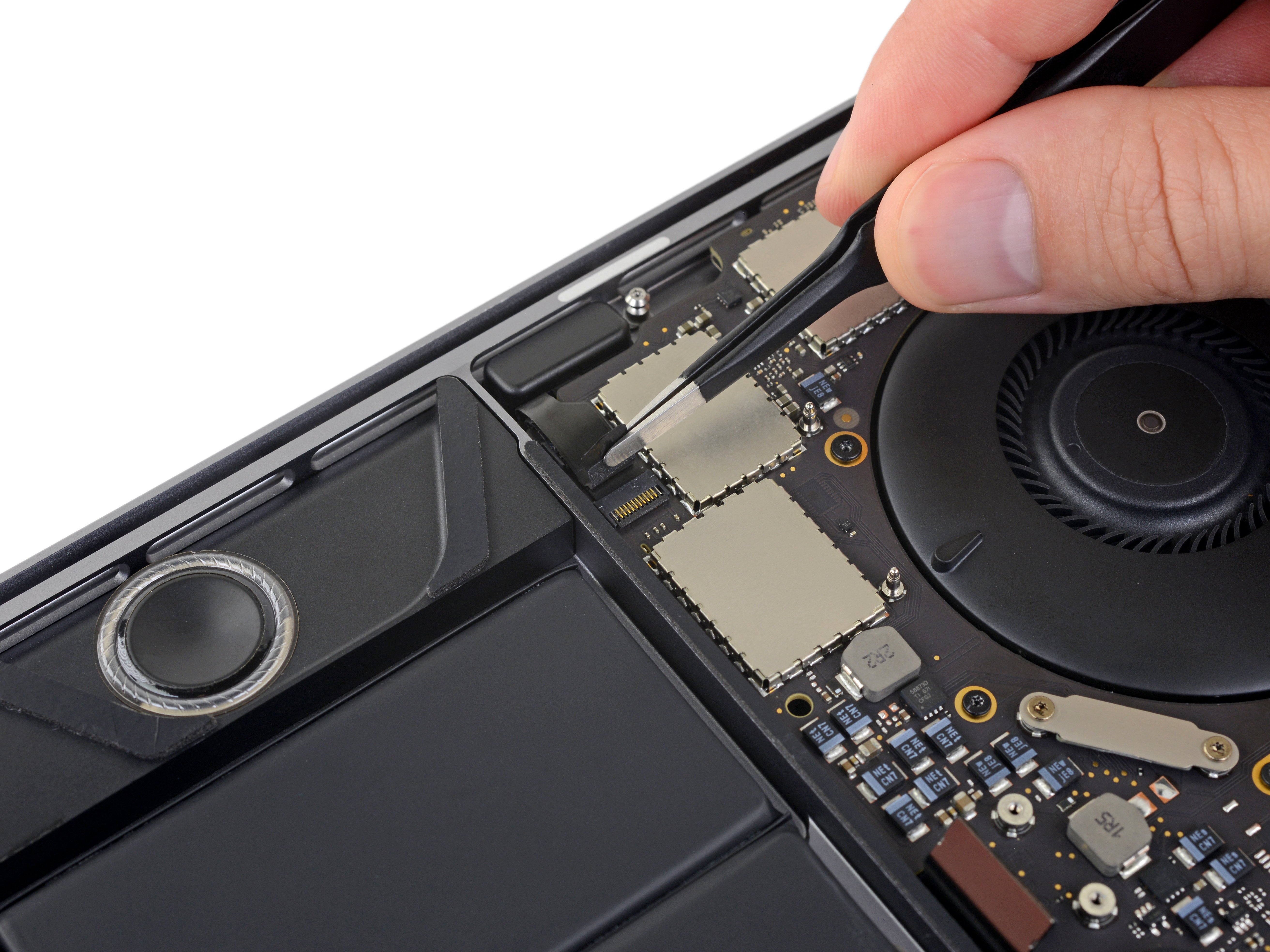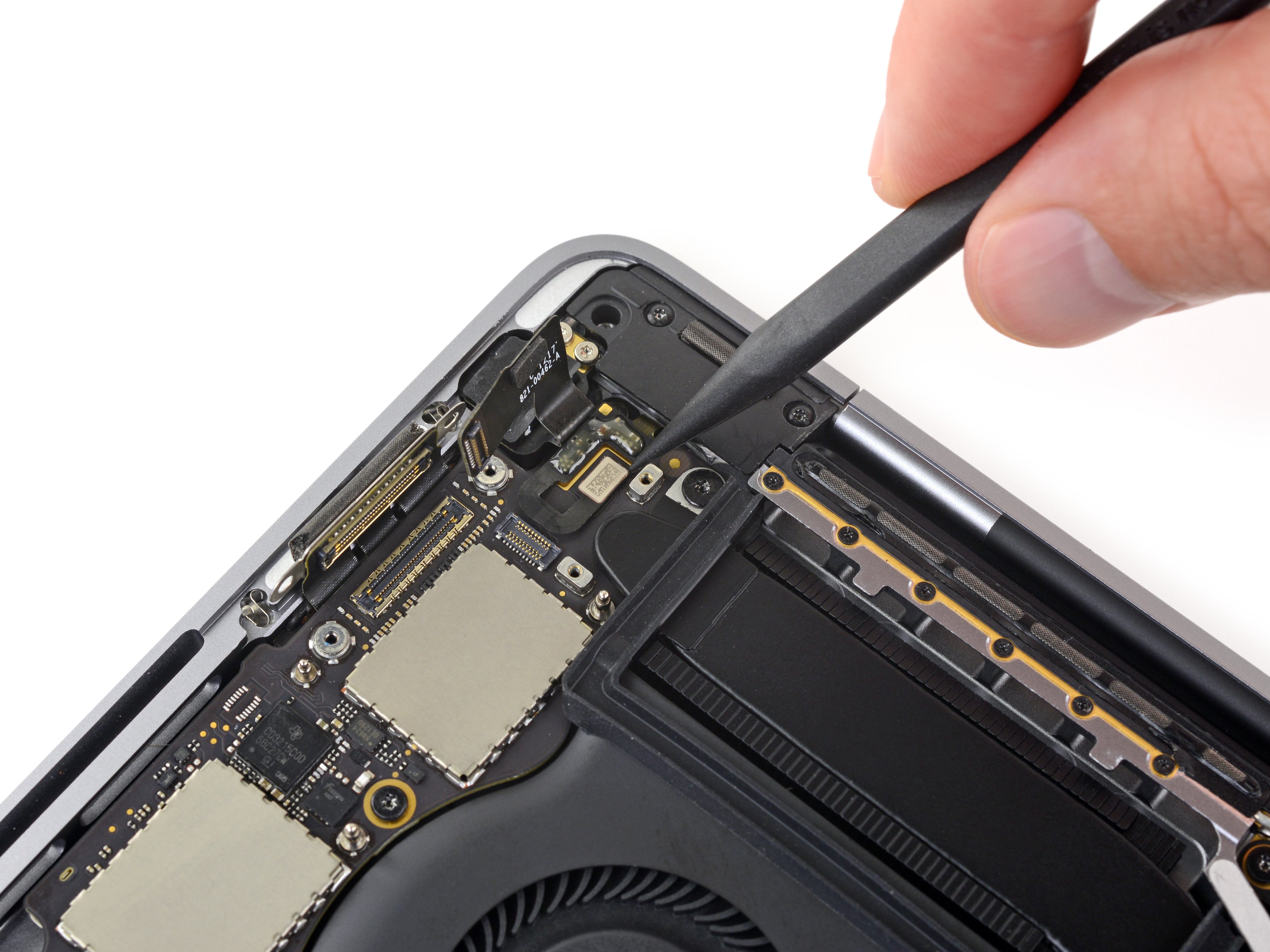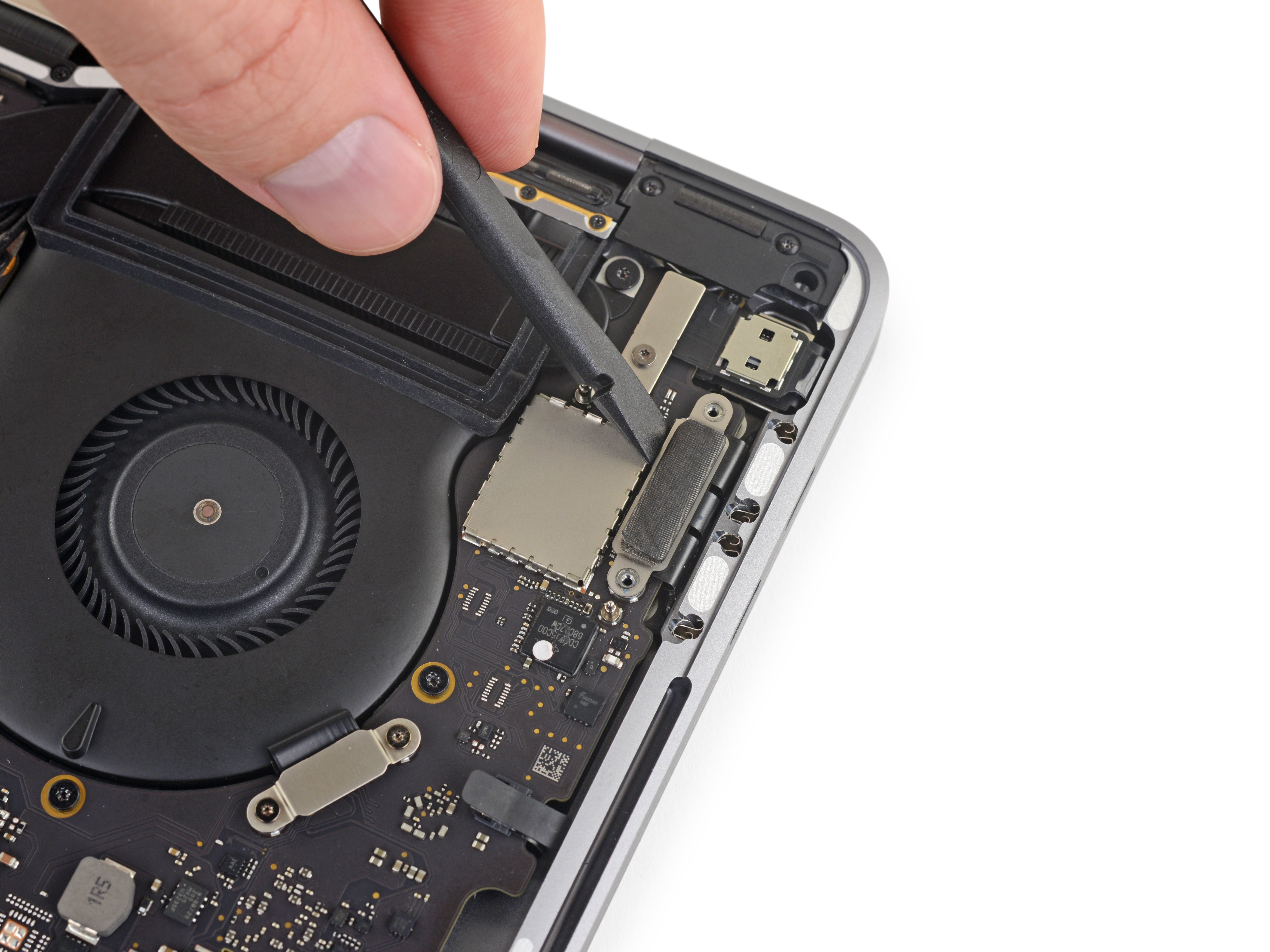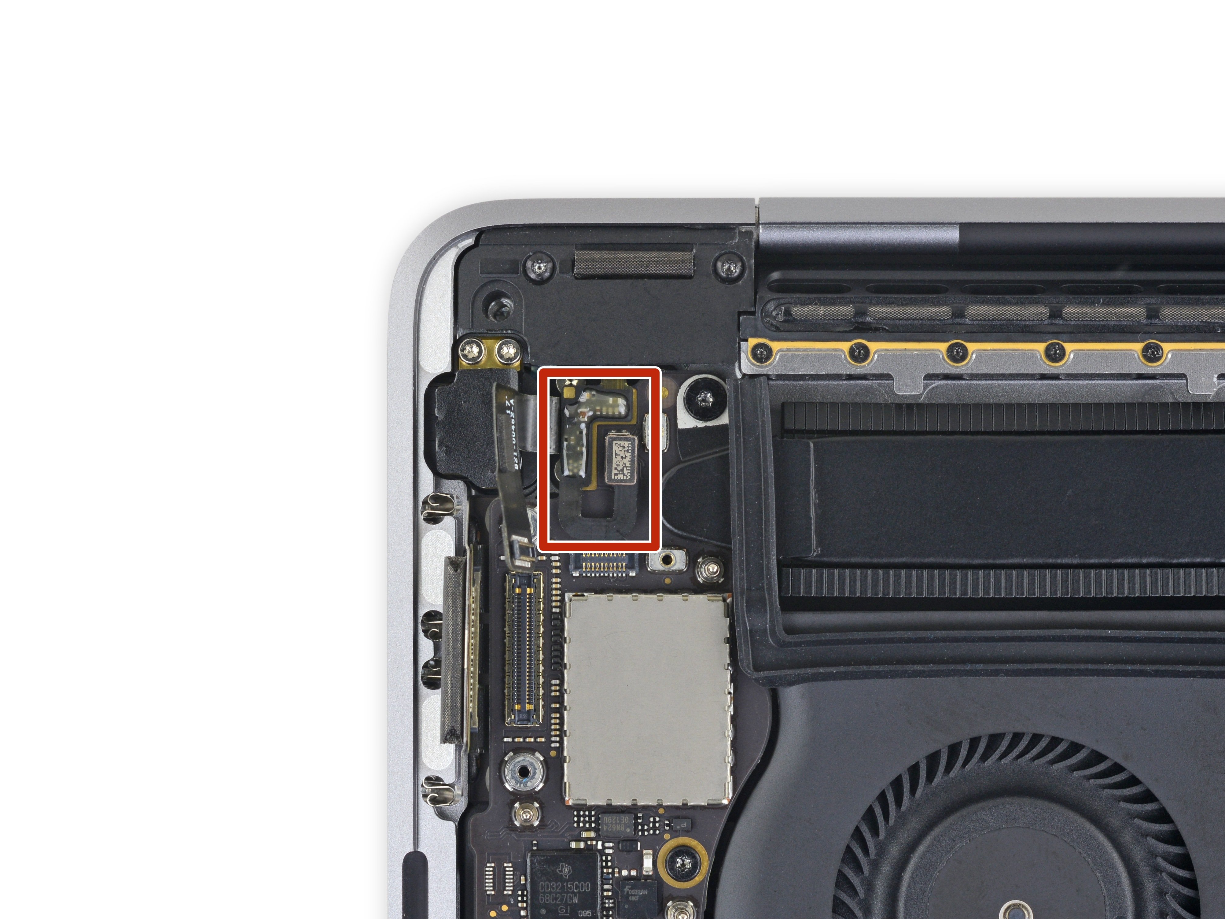 - Use a spudger to disconnect the left-side Thunderbolt port connector by prying it straight up from the logic board.