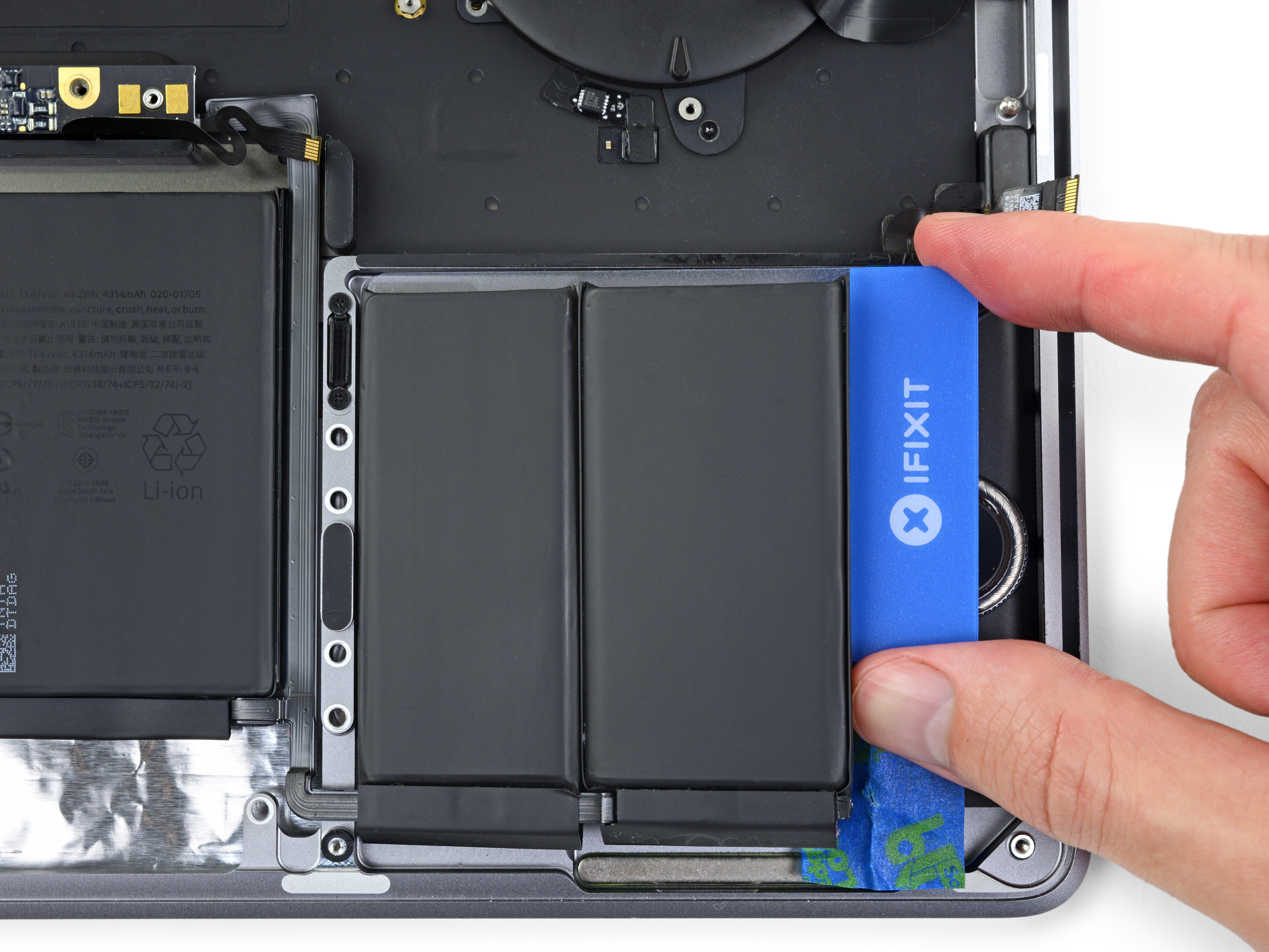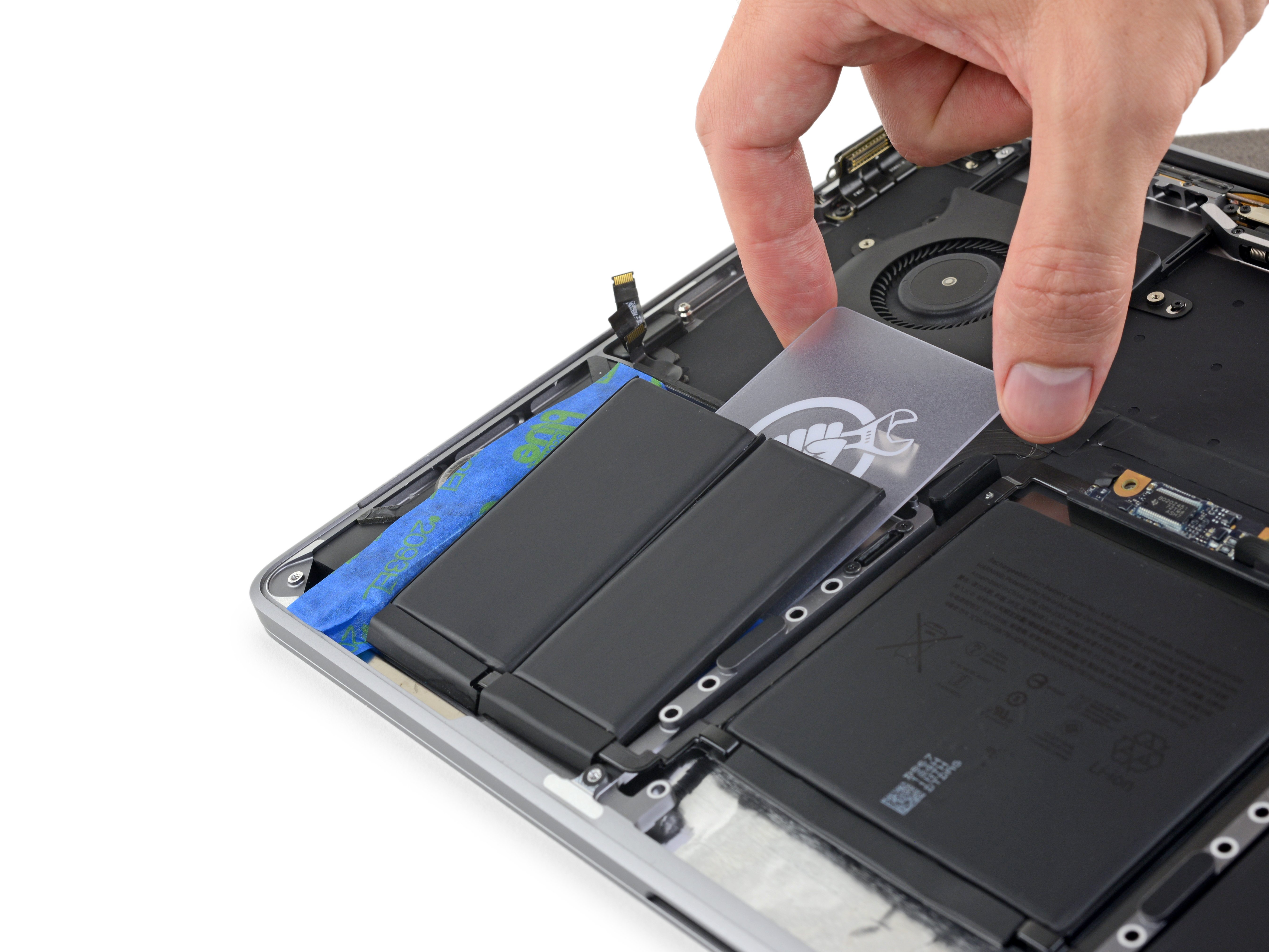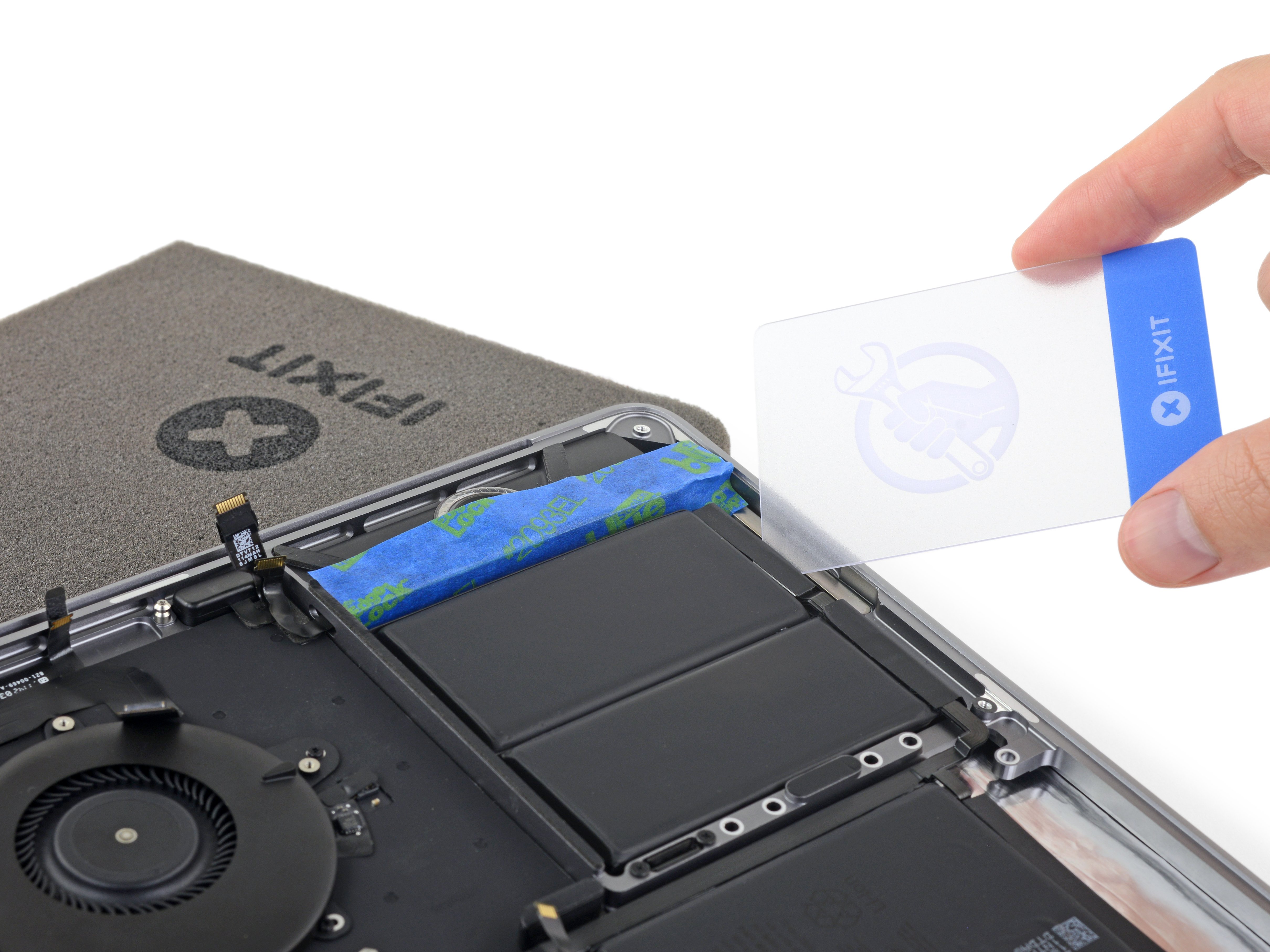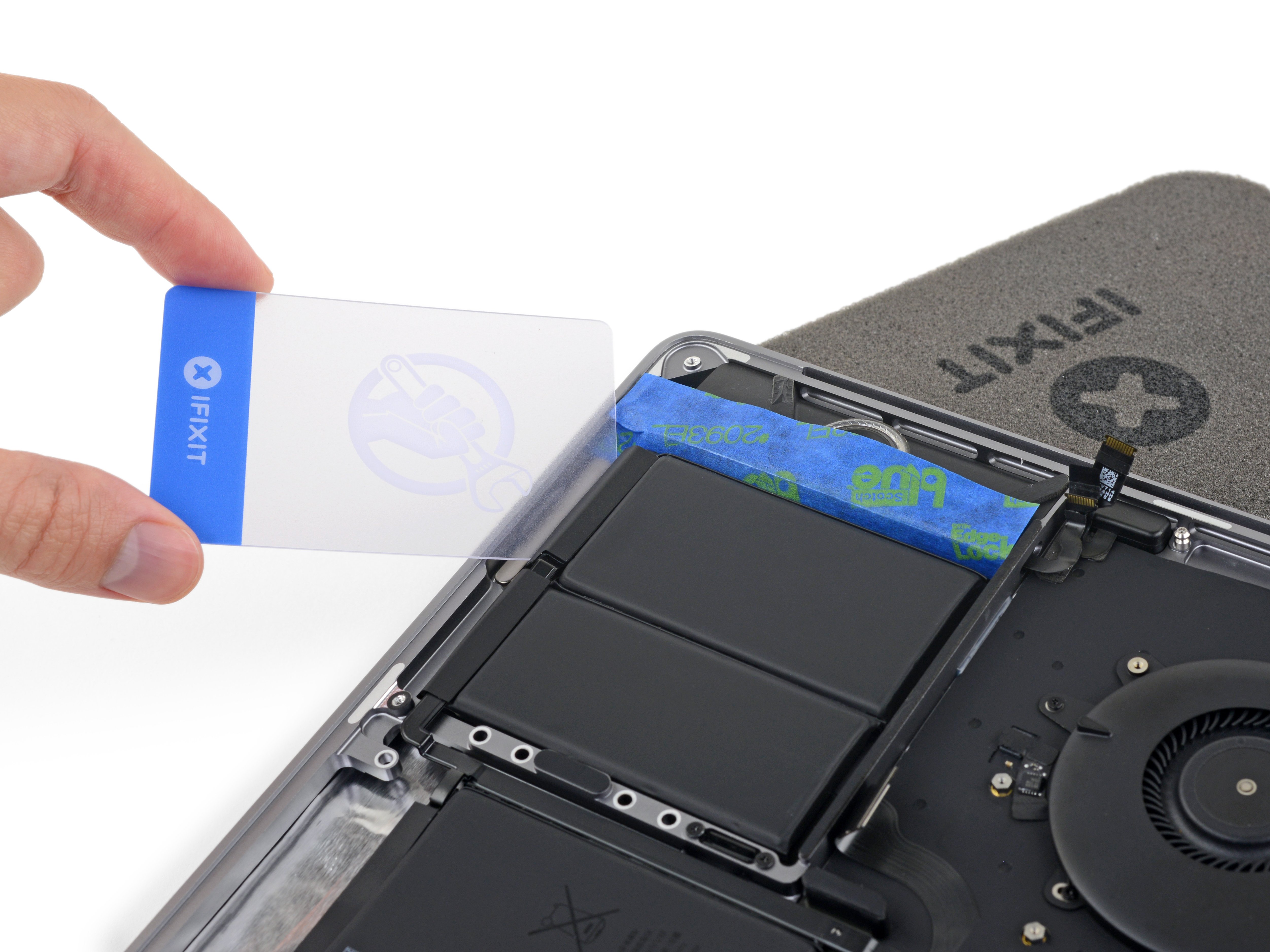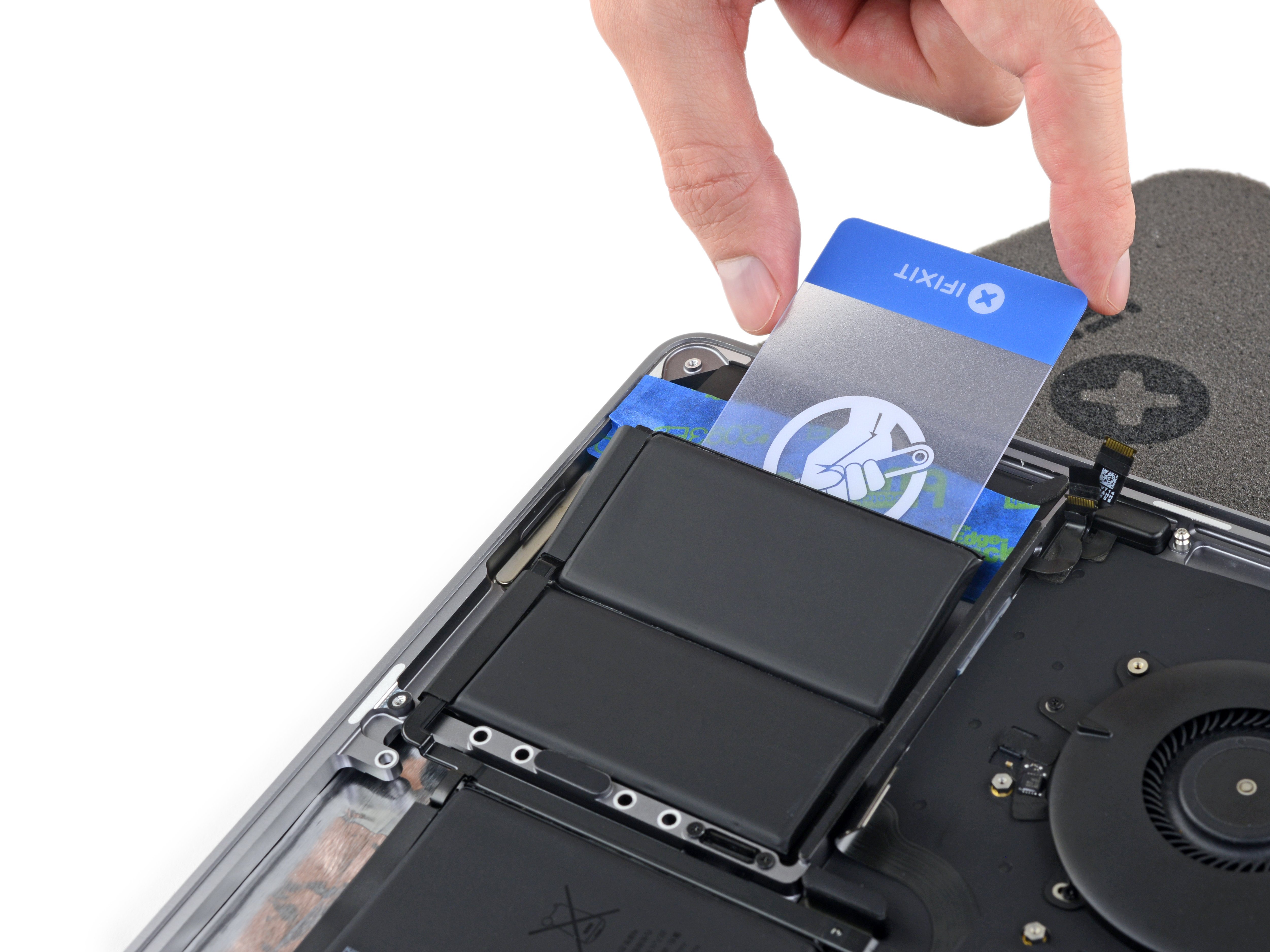 - Leave your plastic card in place temporarily to prevent the left-side battery cells from re-adhering.