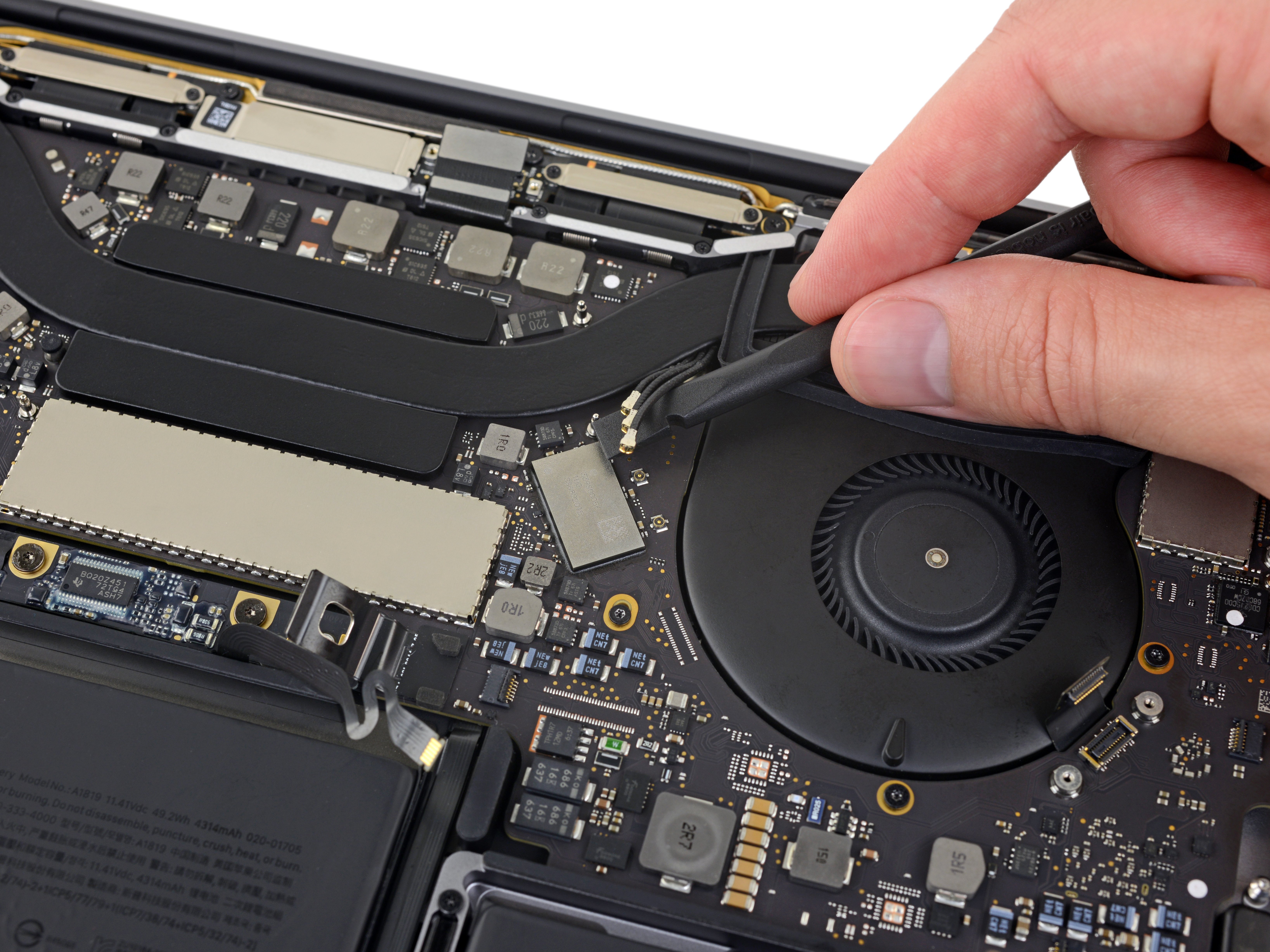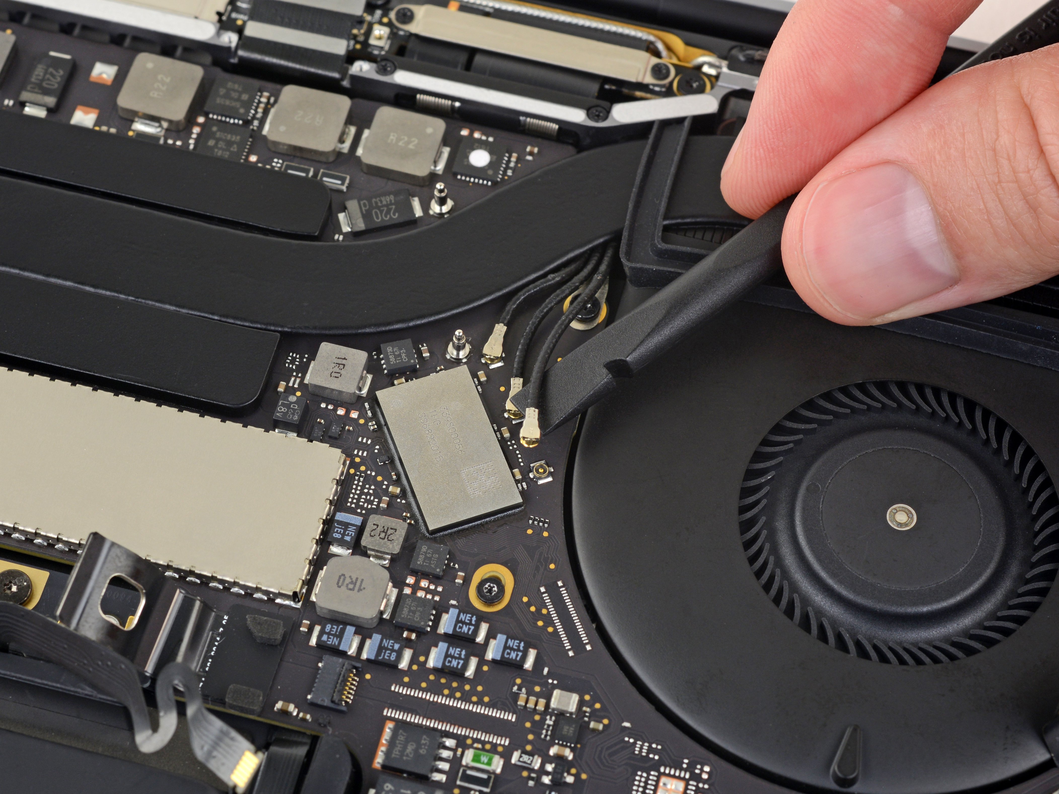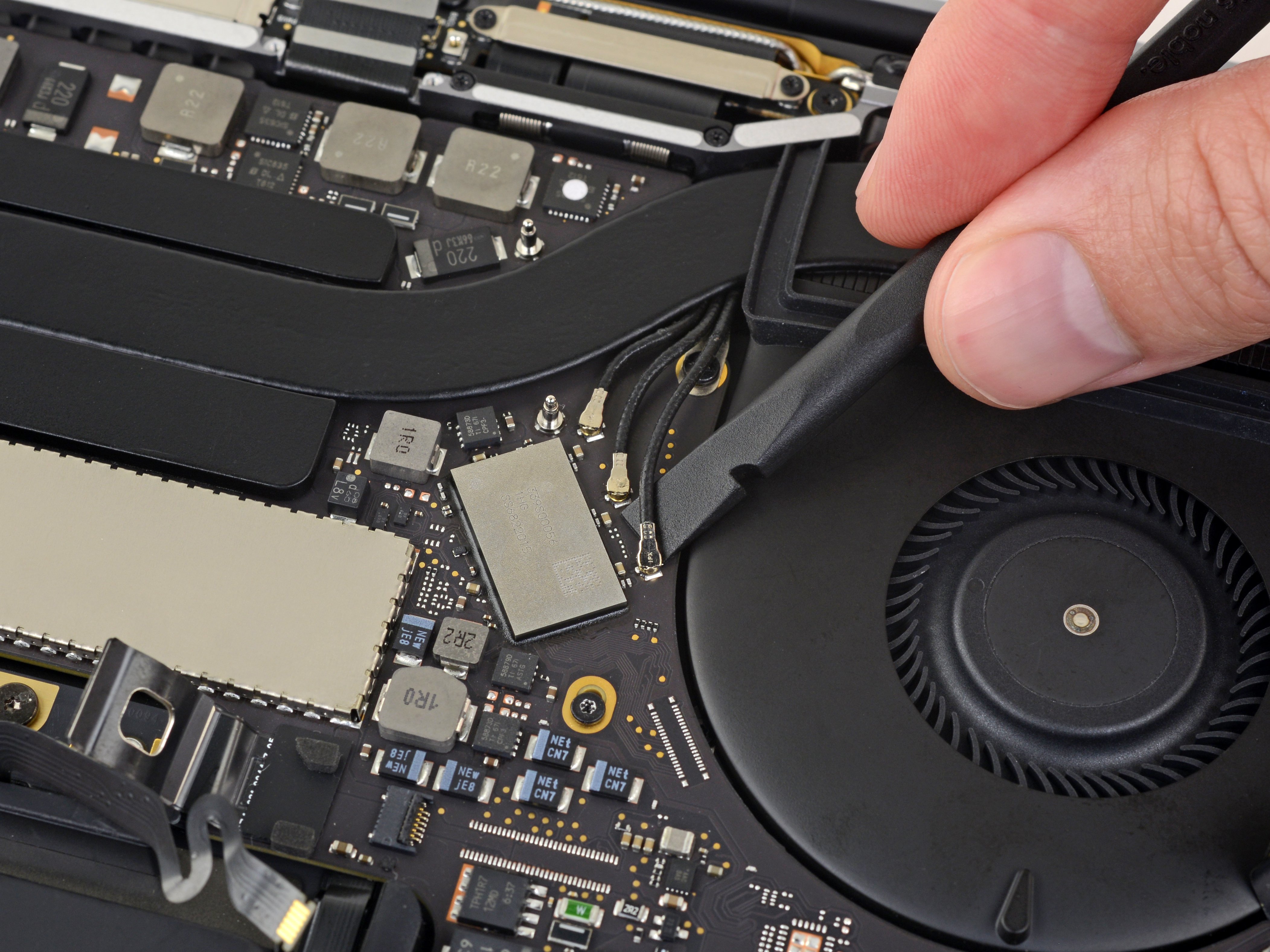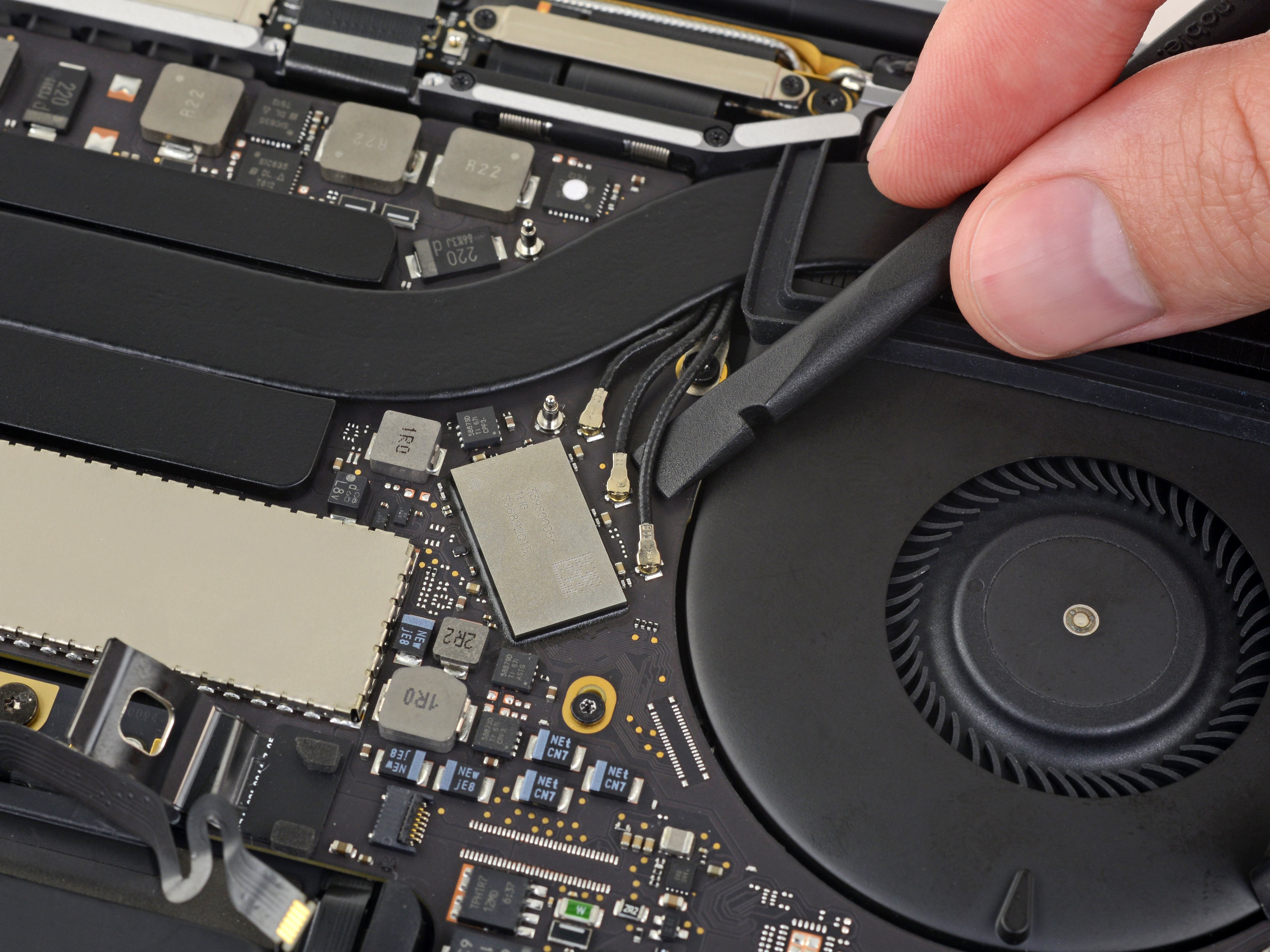 - Feed the antenna cable bundle through the gap between the logic board and heat sink, and make sure it lines up correctly as you lower the board into place.