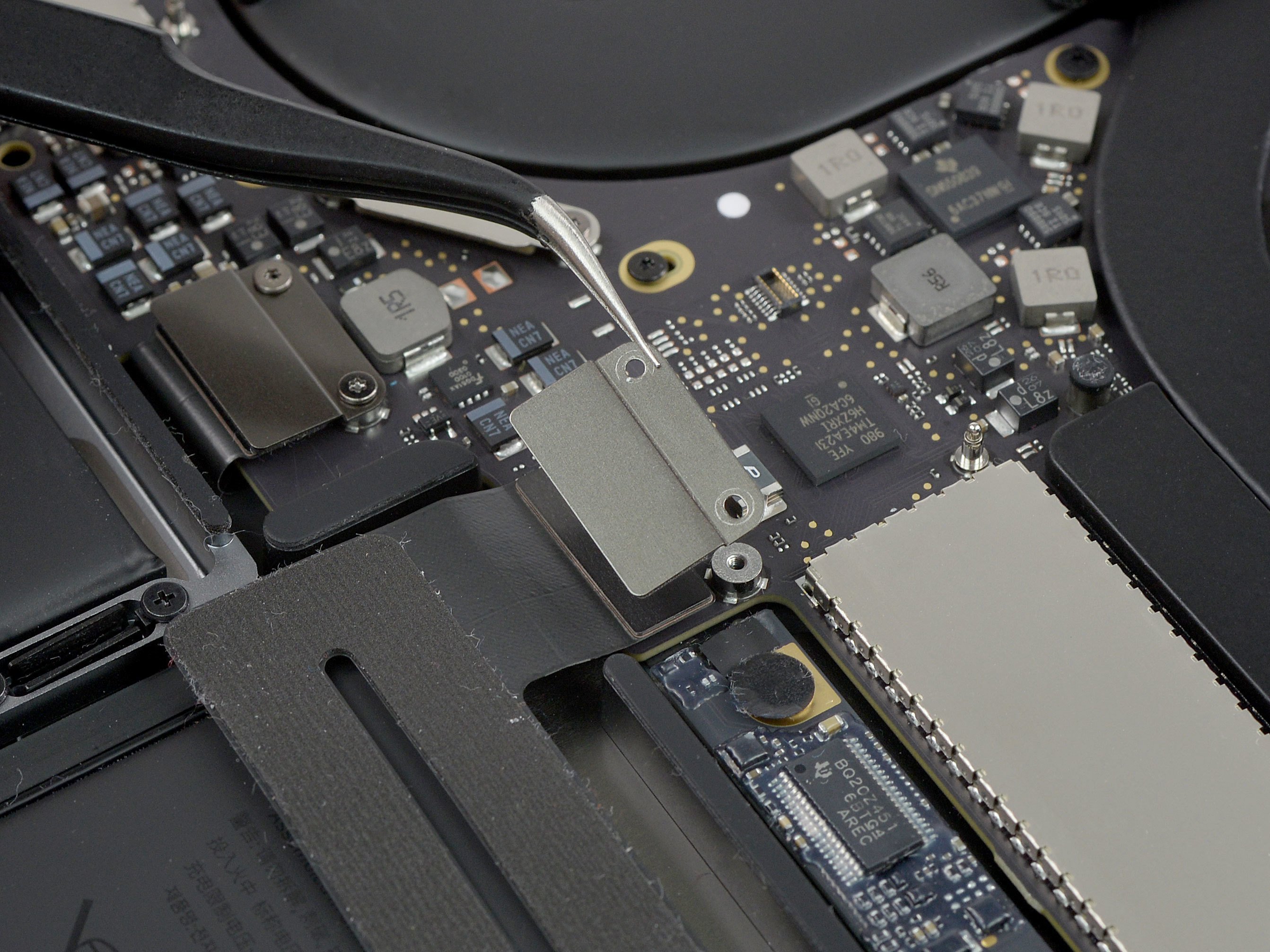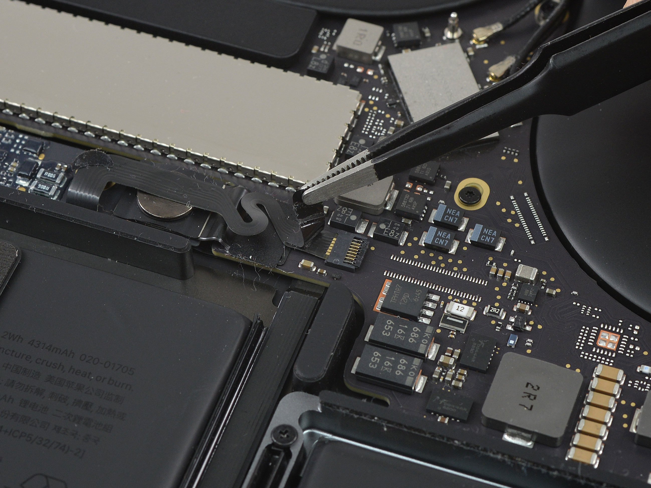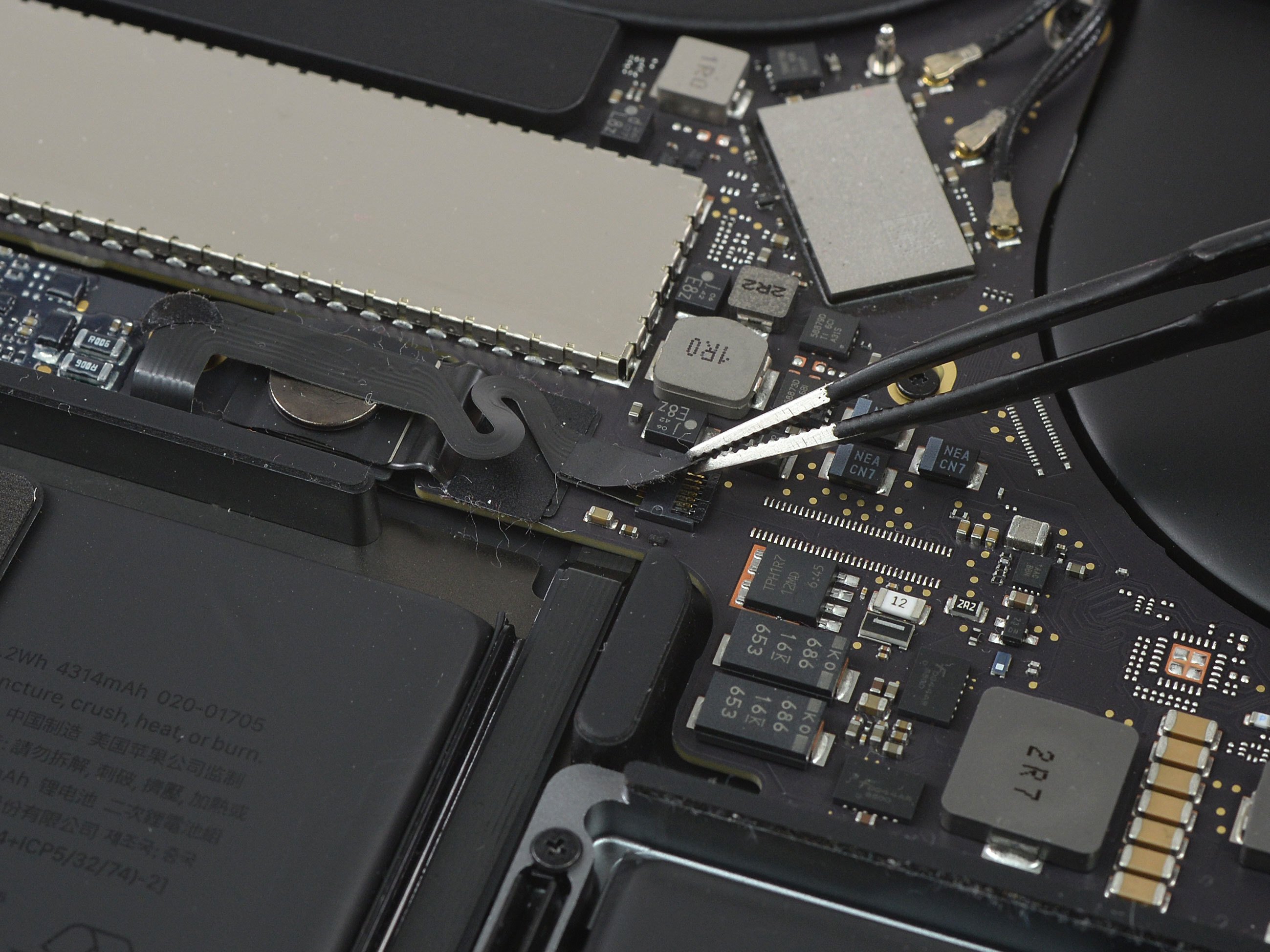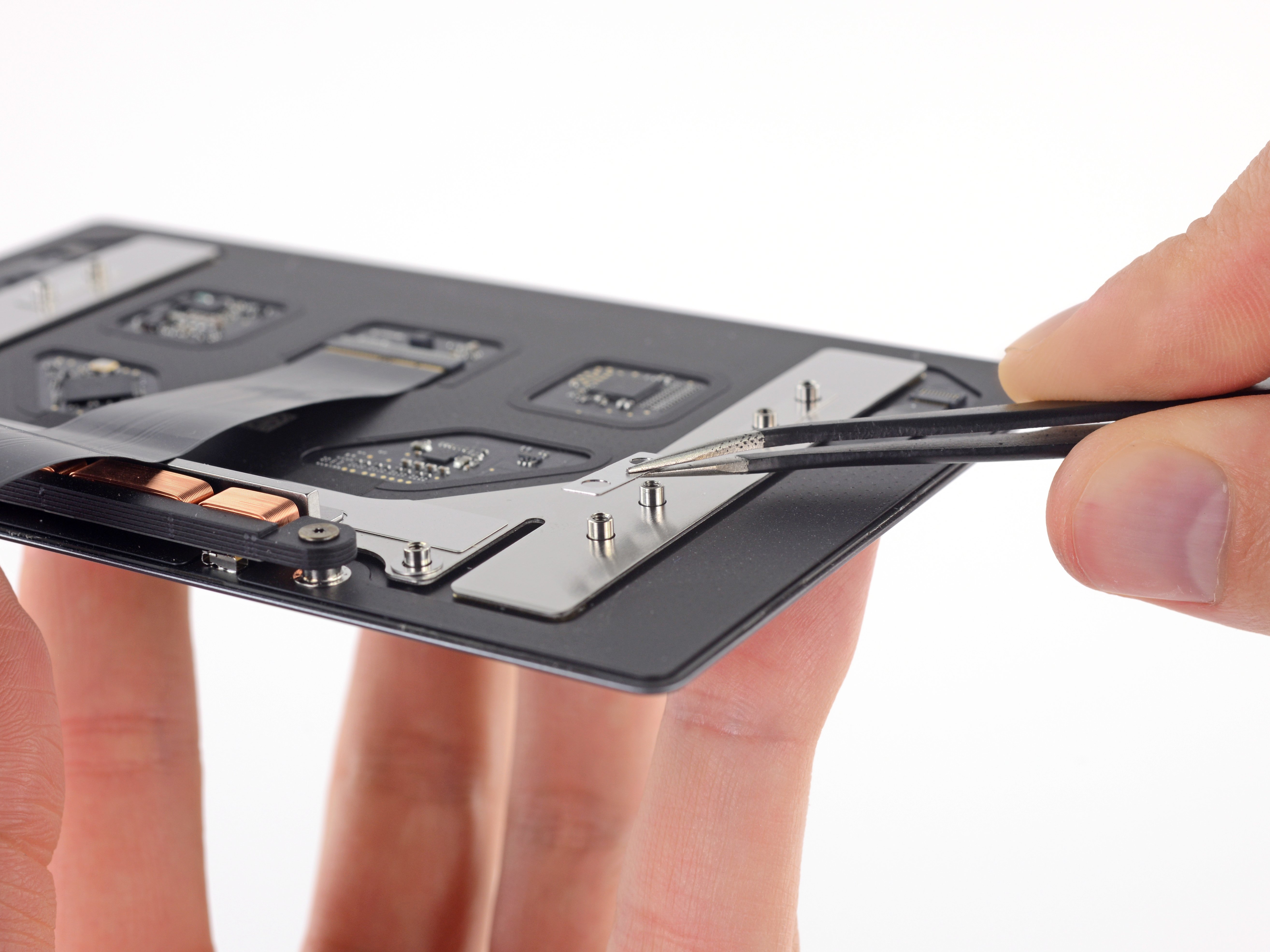 - Remove the trackpad cable connector bracket with a pair of tweezers.