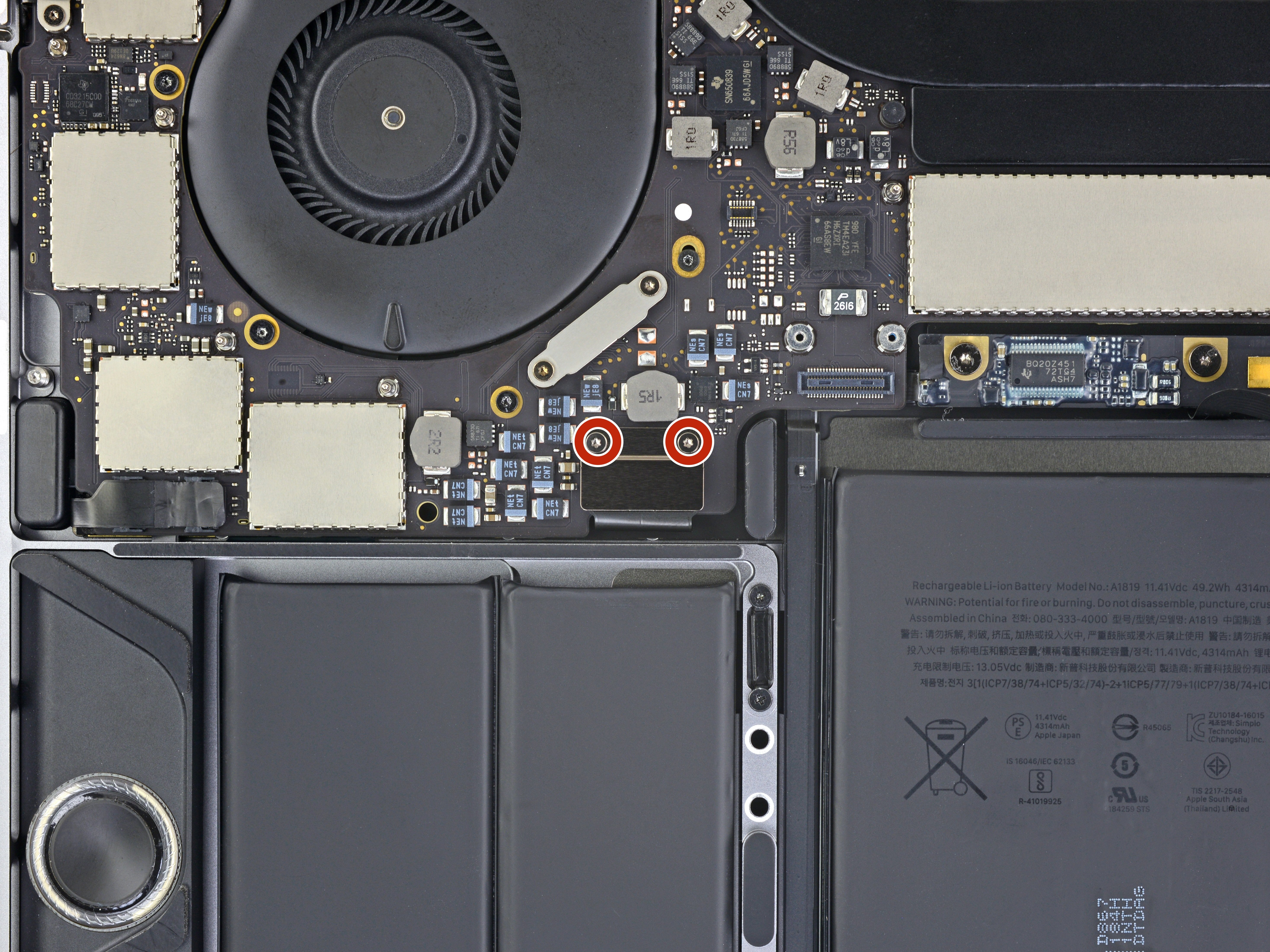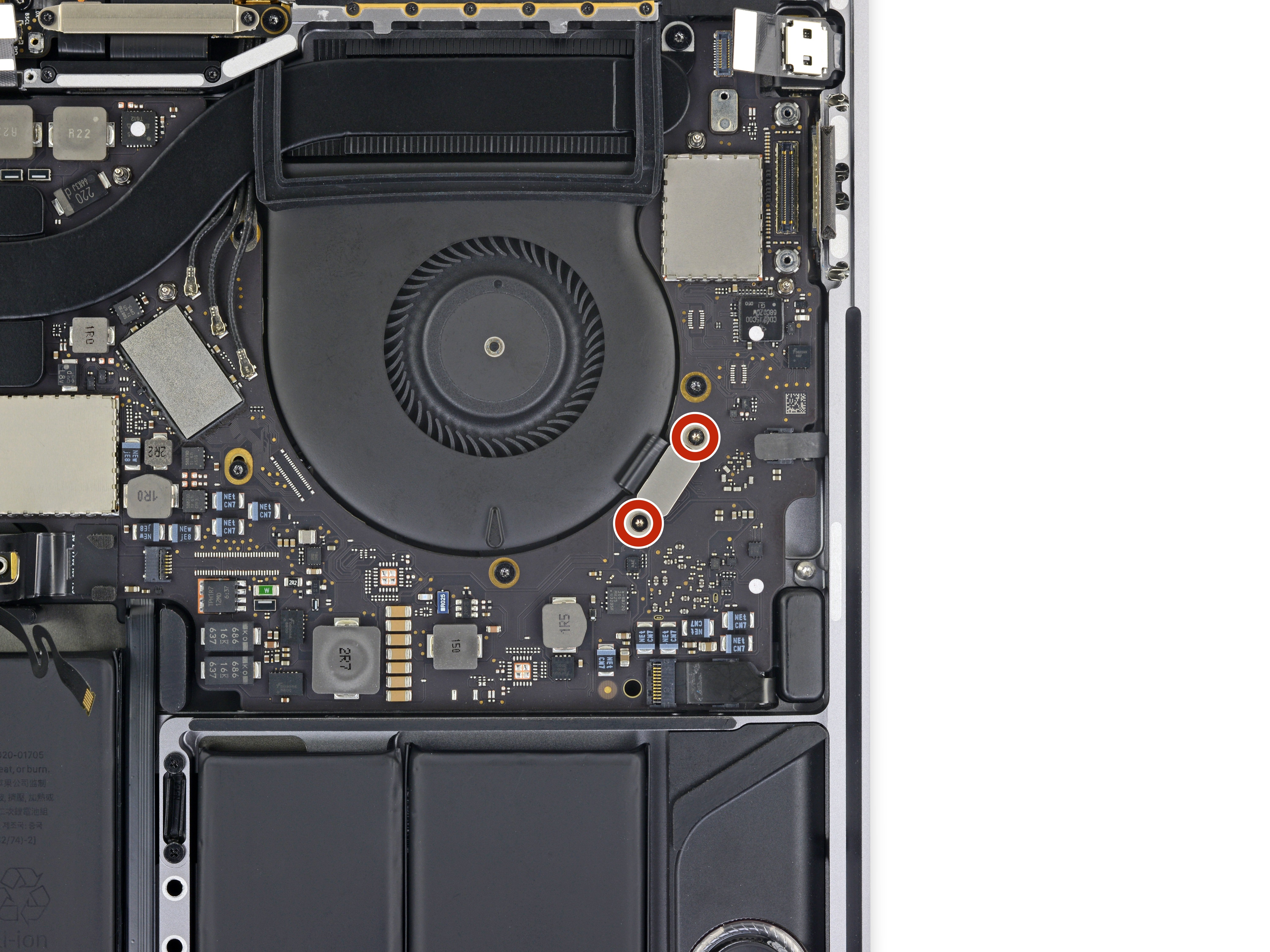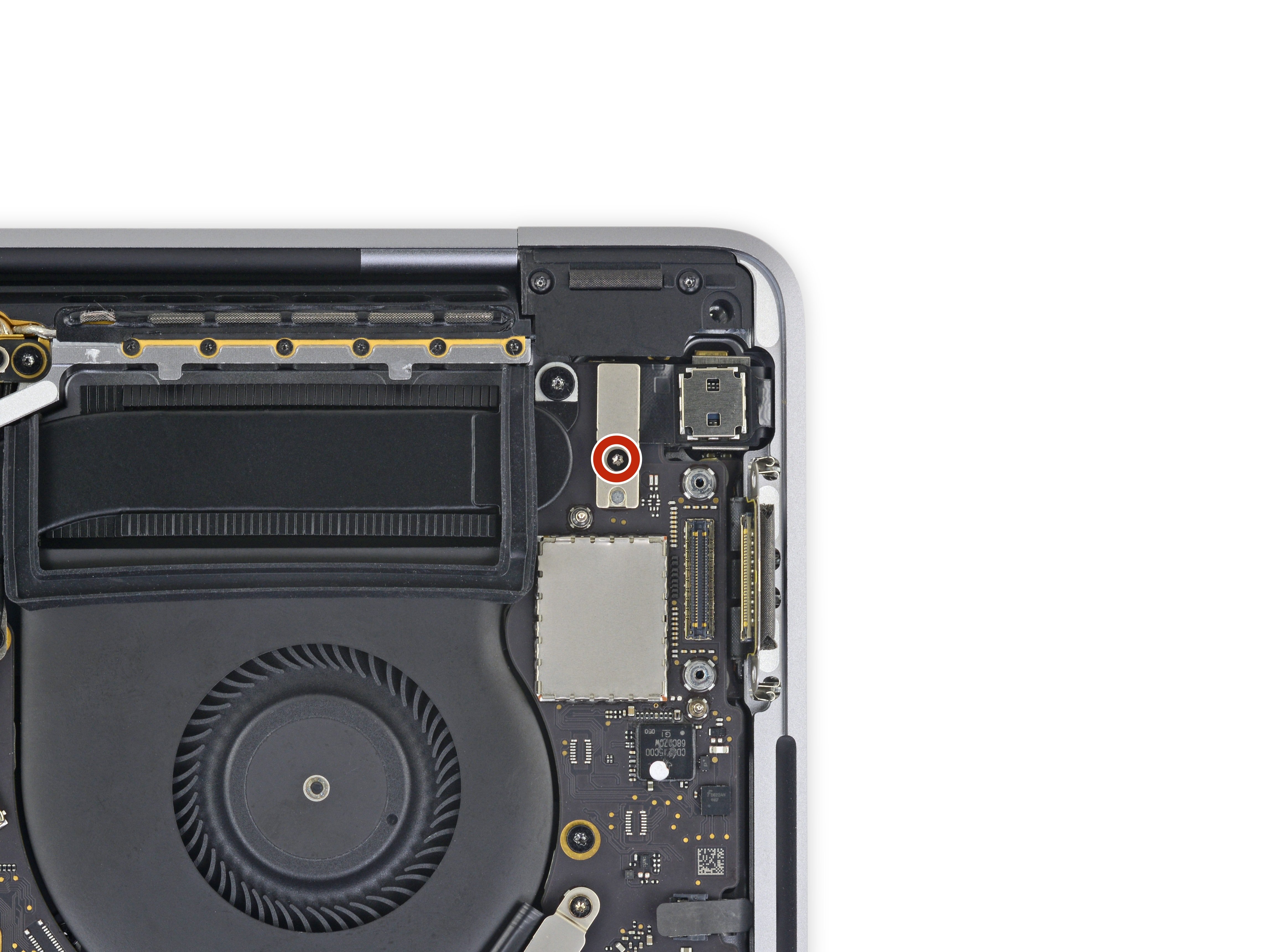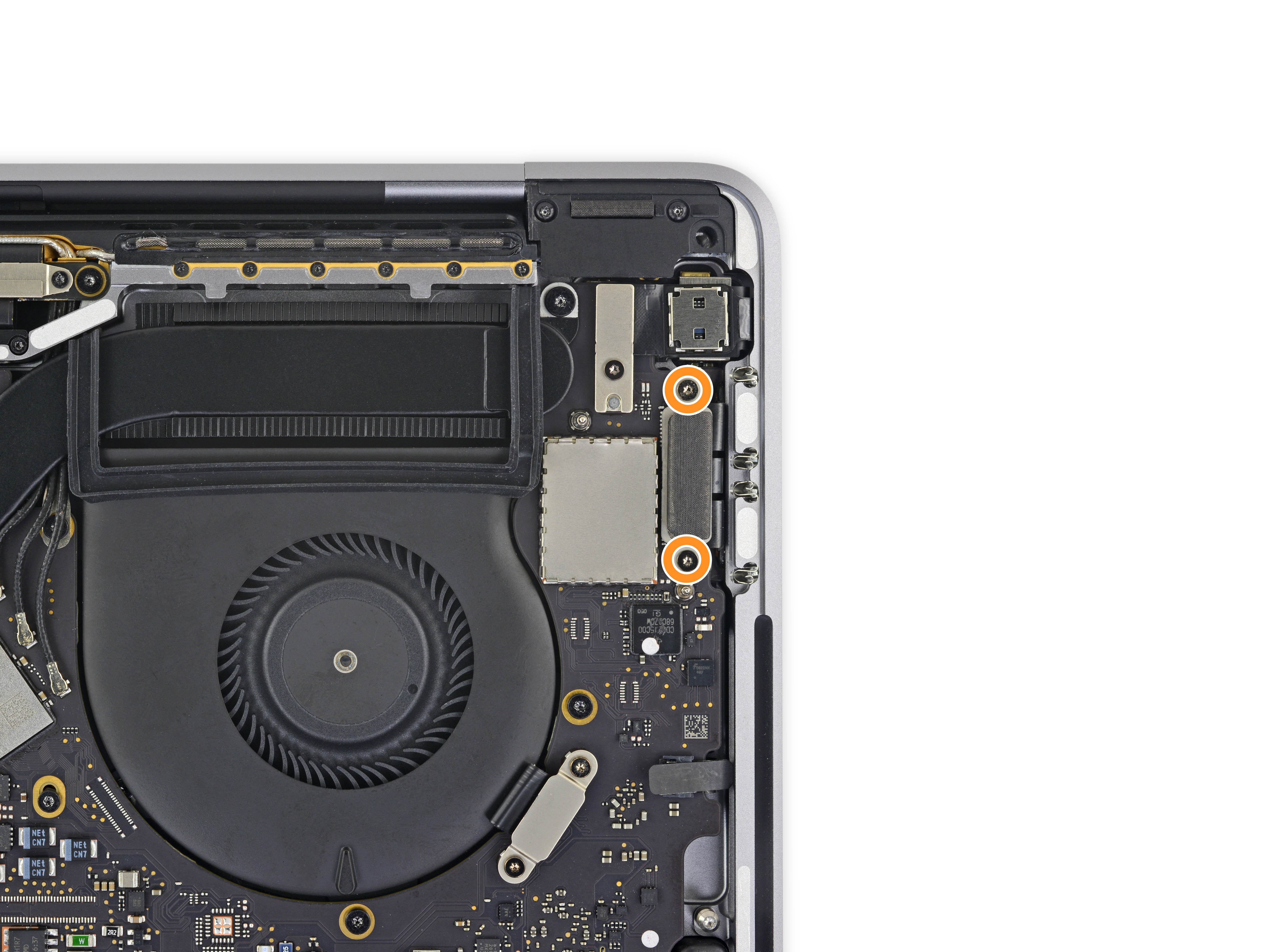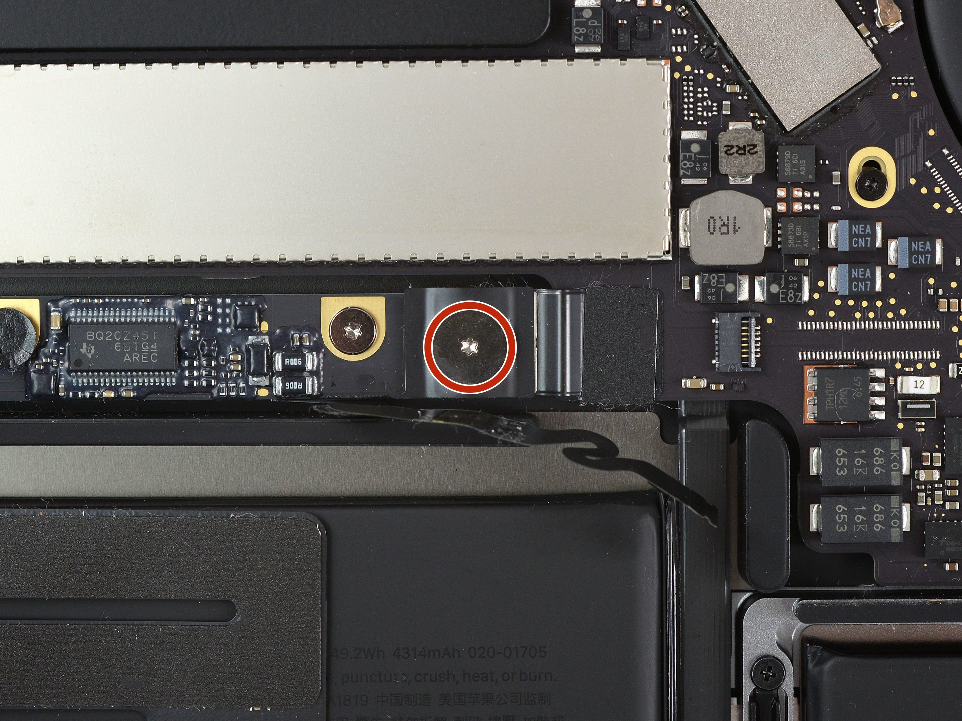 - Remove two more 1.4 mm screws from the Thunderbolt port connector bracket on the right.