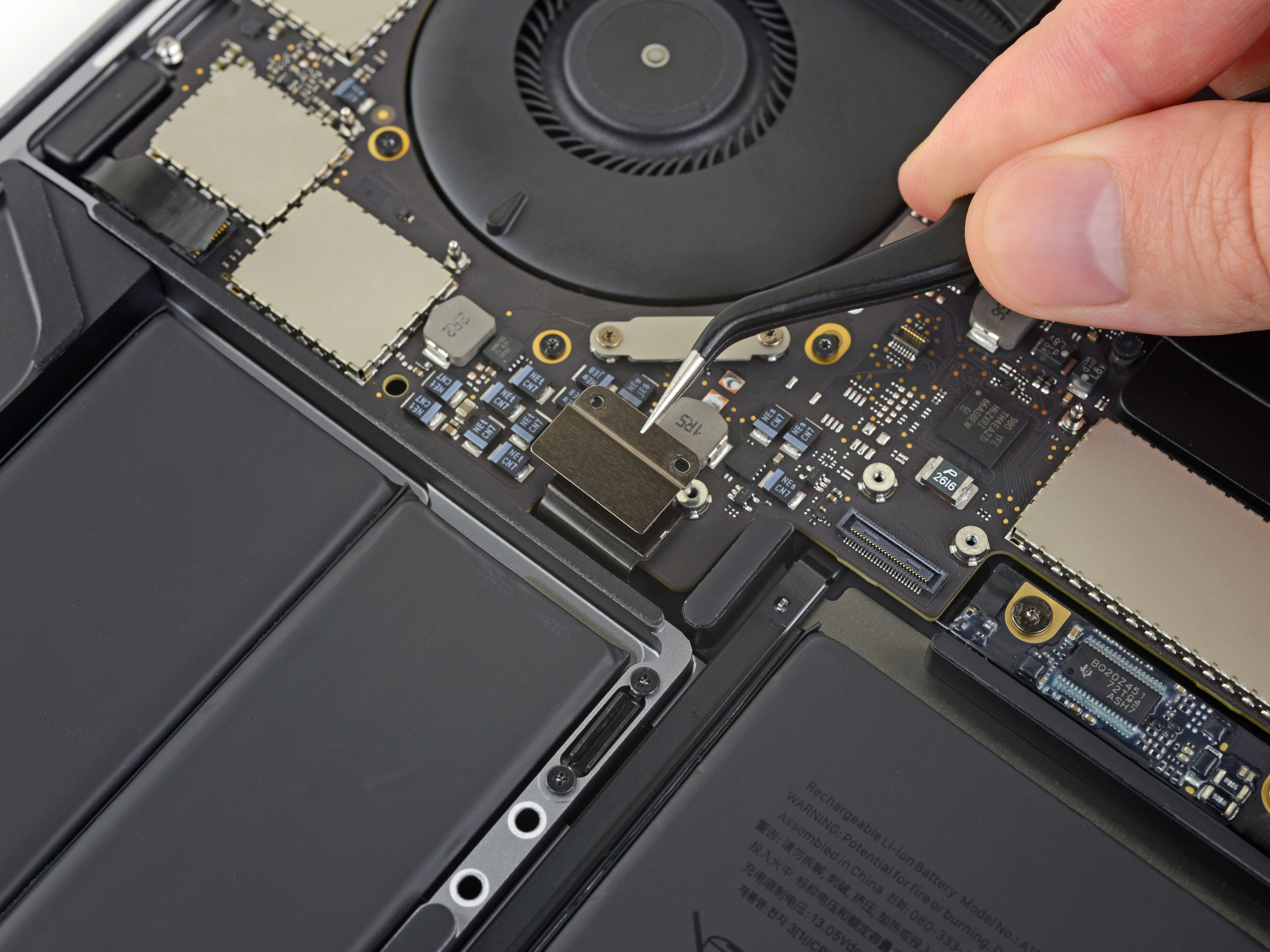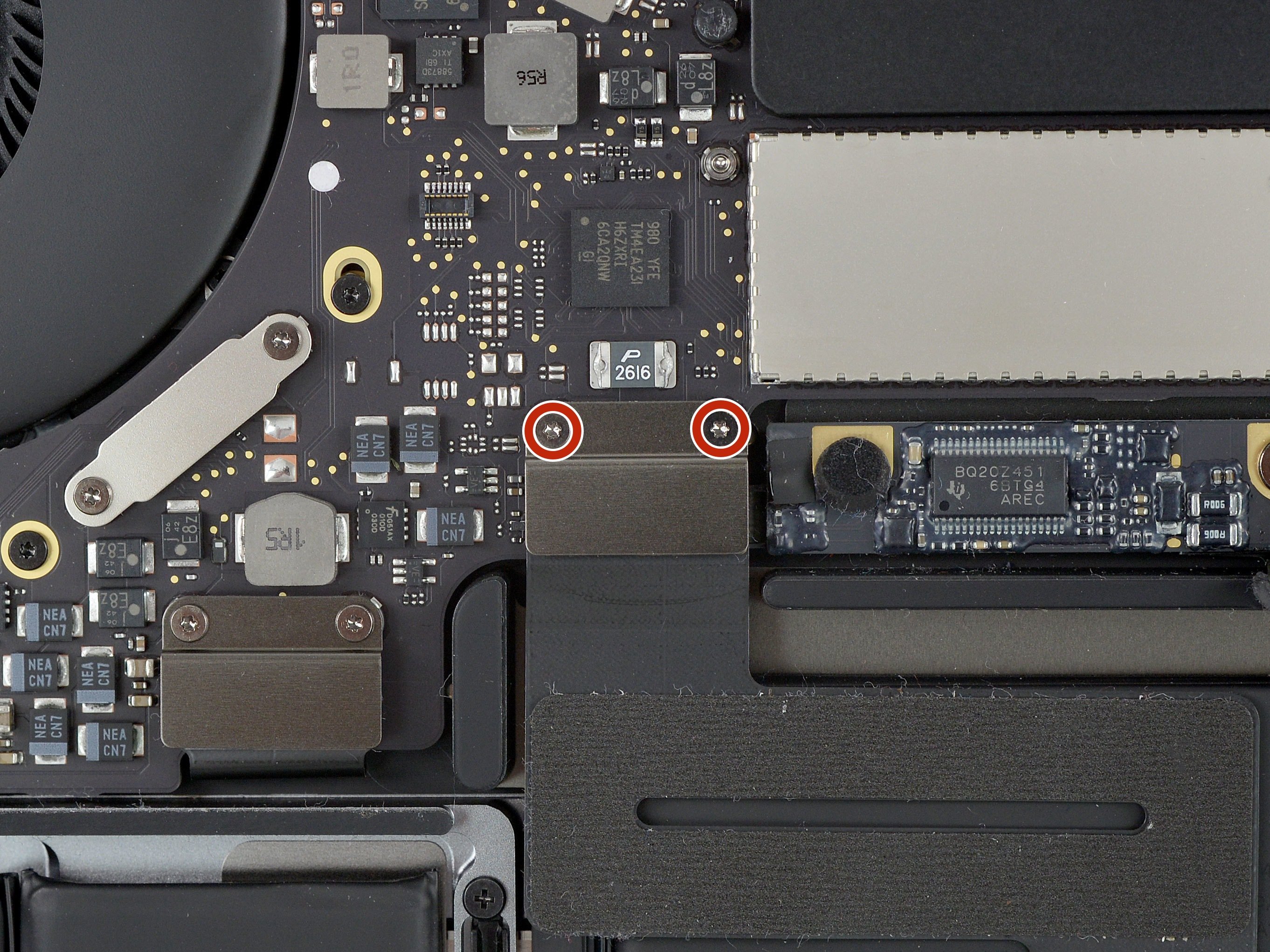 - Remove the two 1.7 mm T3 Torx screws securing the aluminum cover on top of the display cable flex connector.
