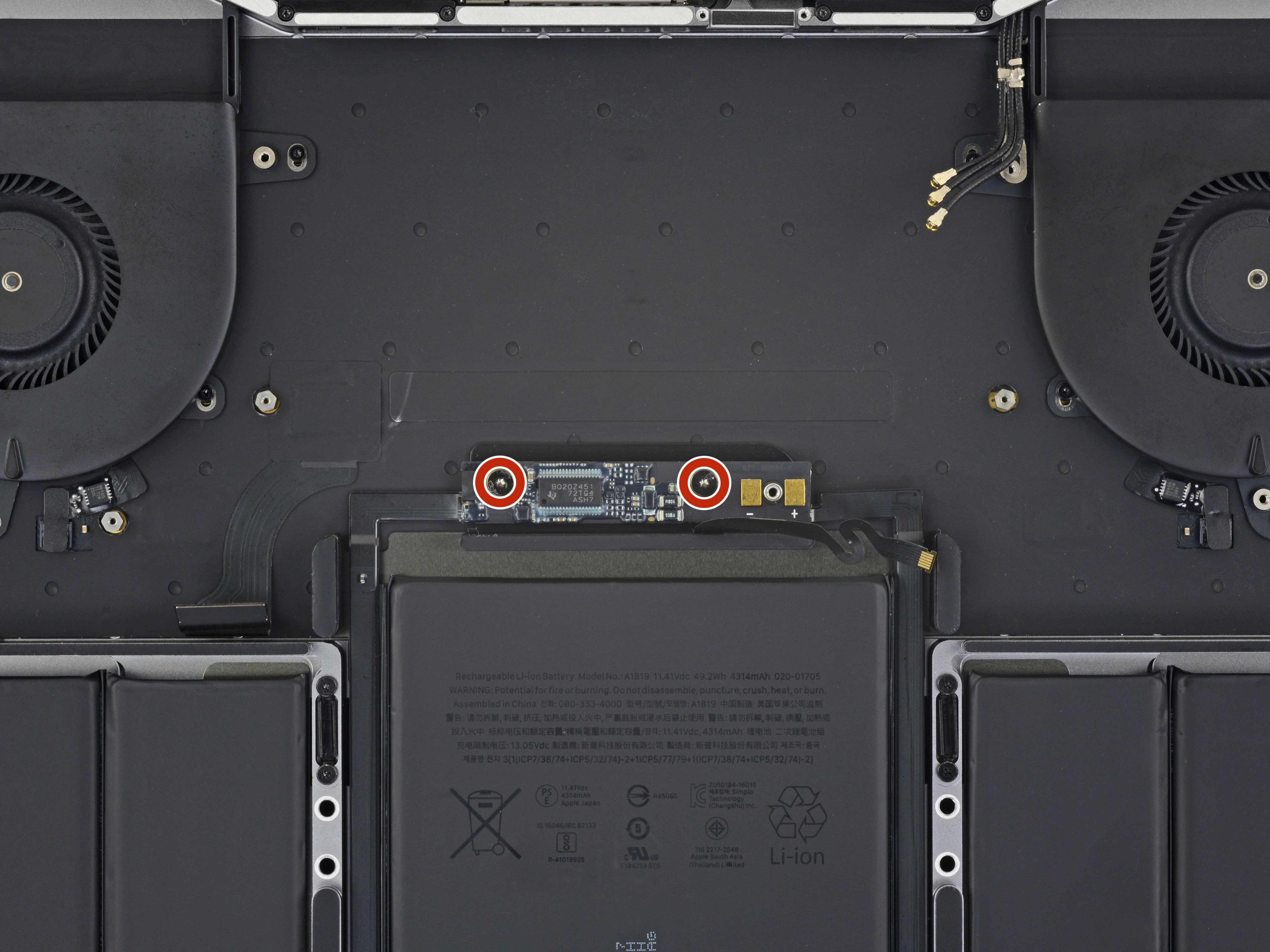 - Use a T5 Torx driver to remove the two 3.2 mm screws from the battery board.