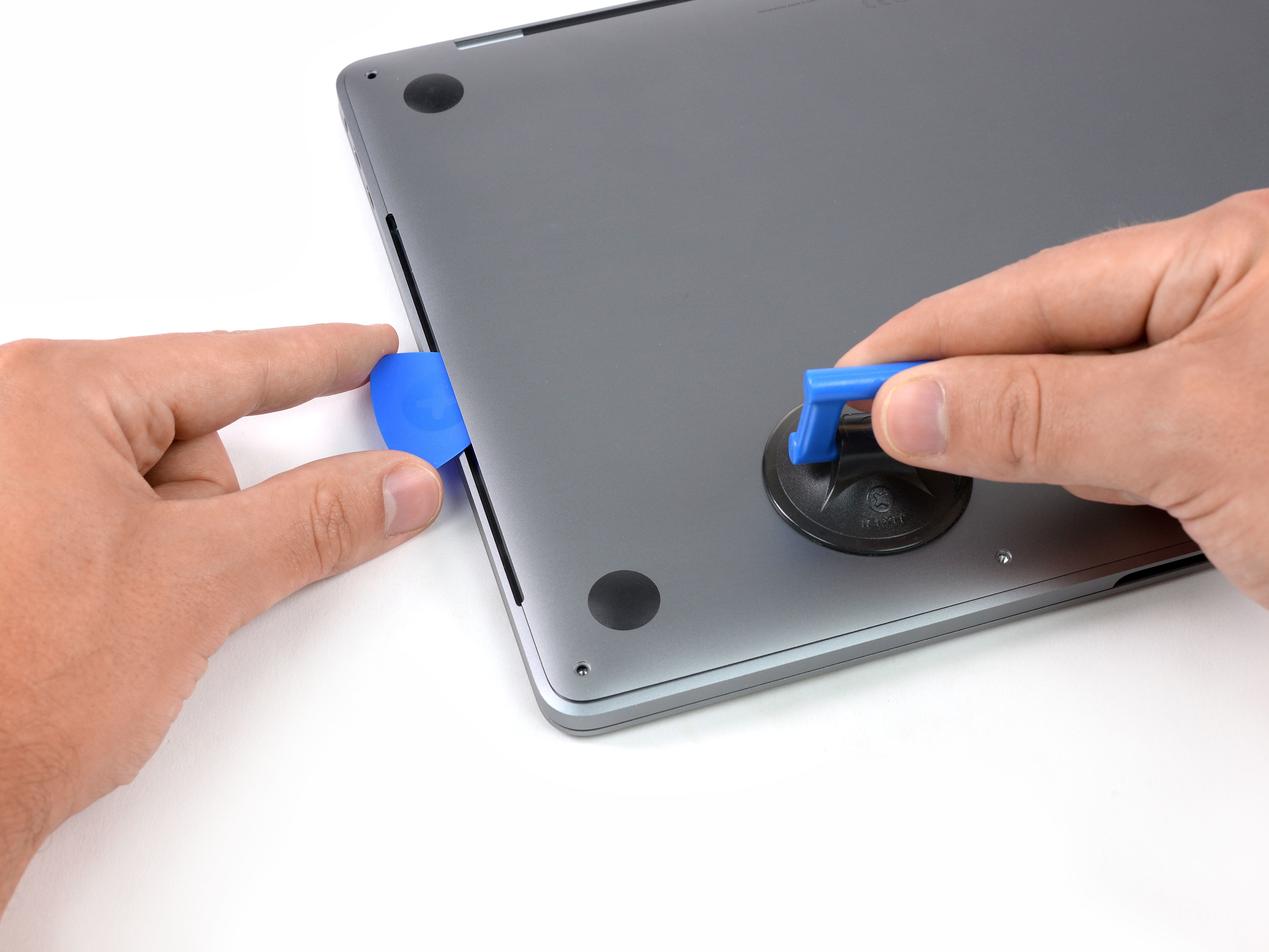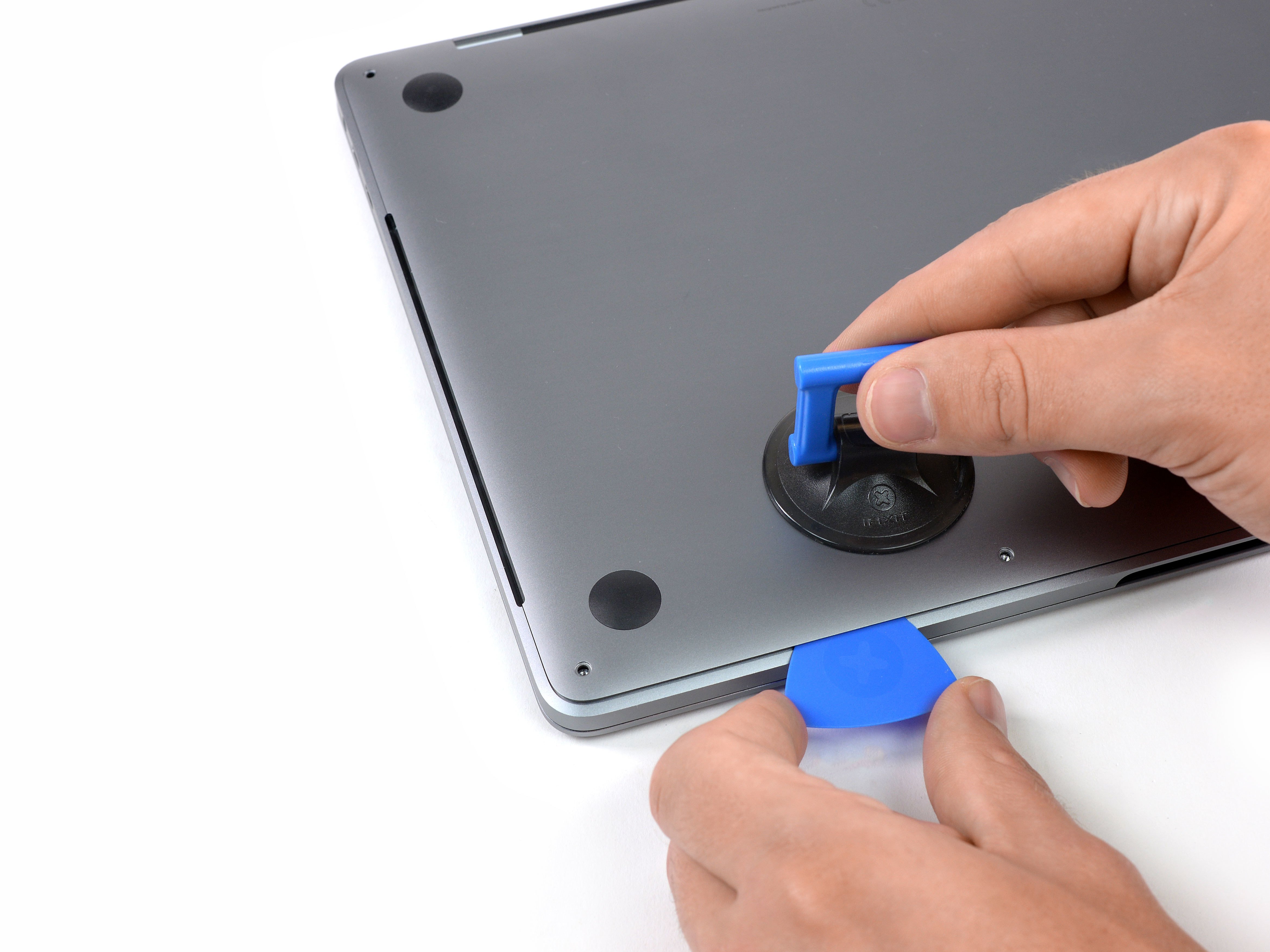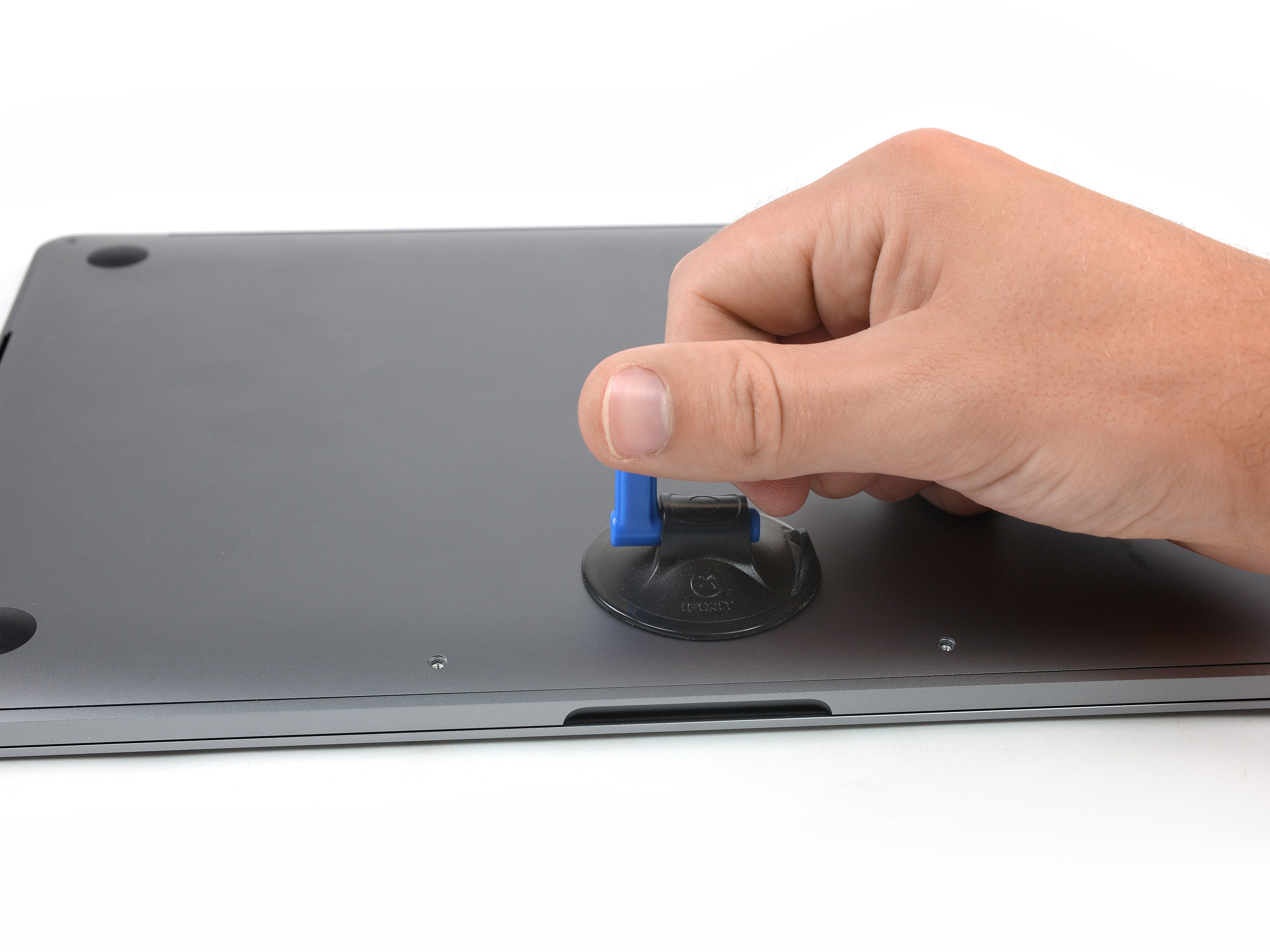 - Apply a suction handle to the lower case near the front-center area of the MacBook Pro.