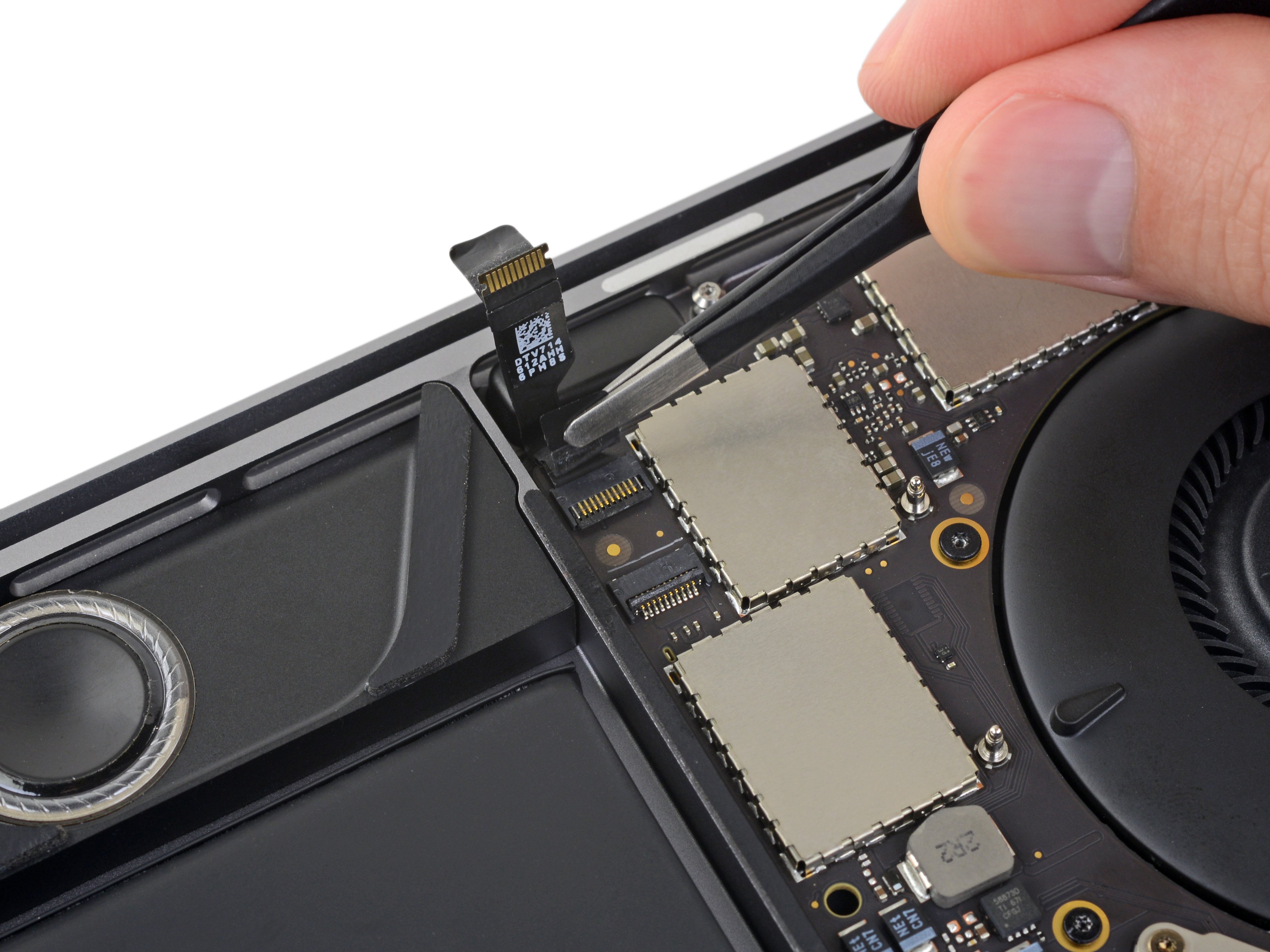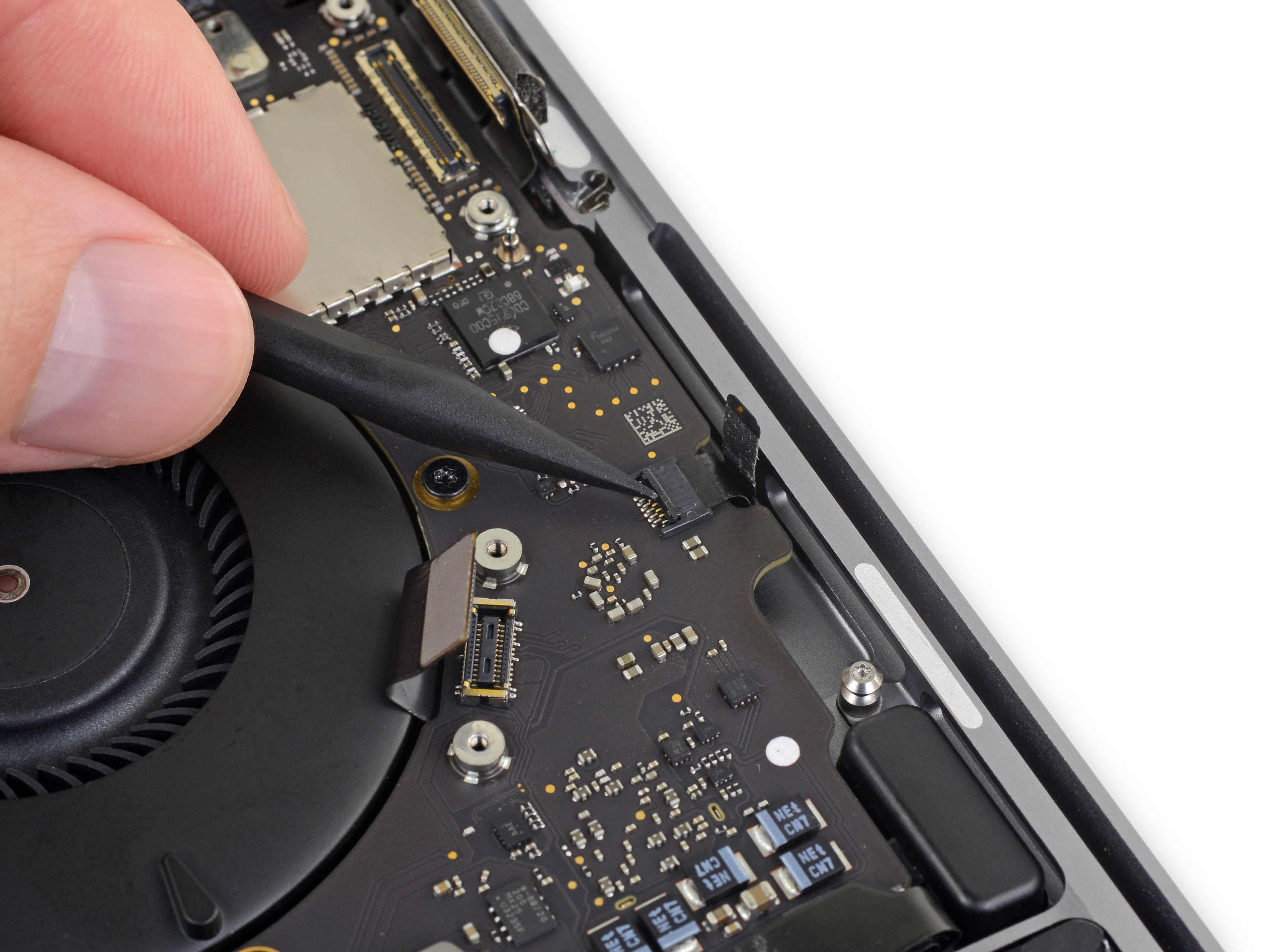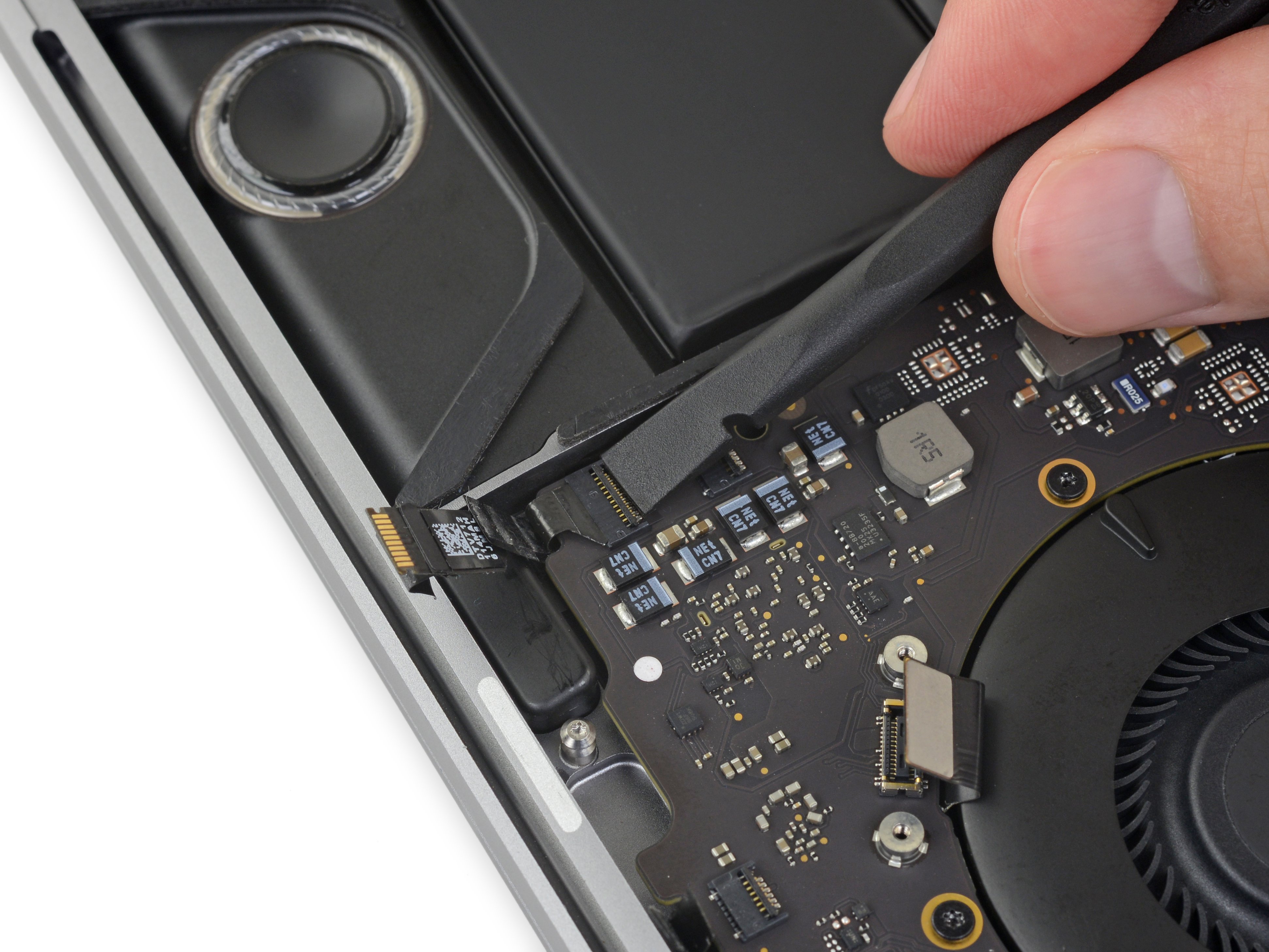 - Use a spudger to disconnect the trackpad ribbon cable by gently prying its connector straight up from the logic board.