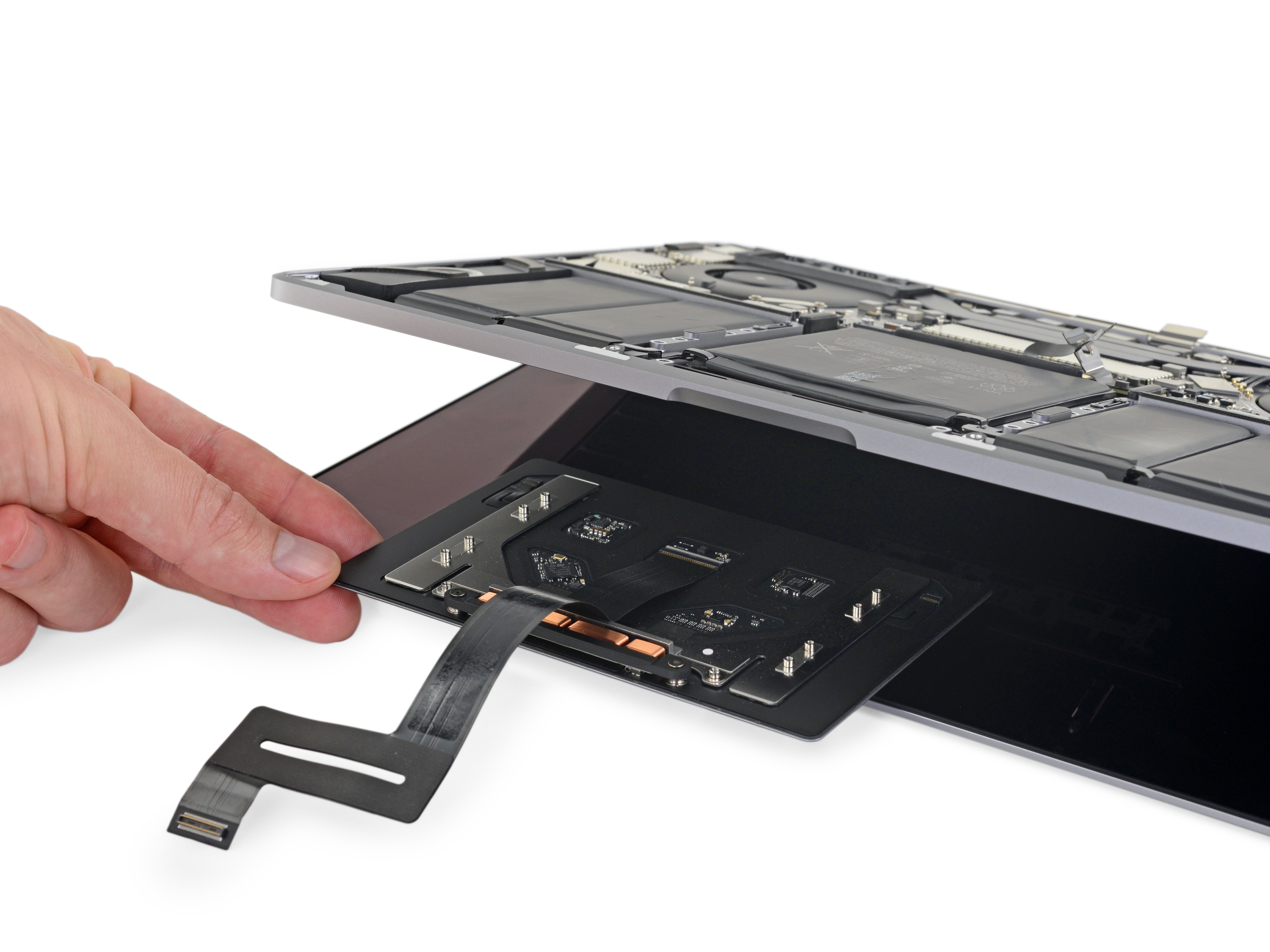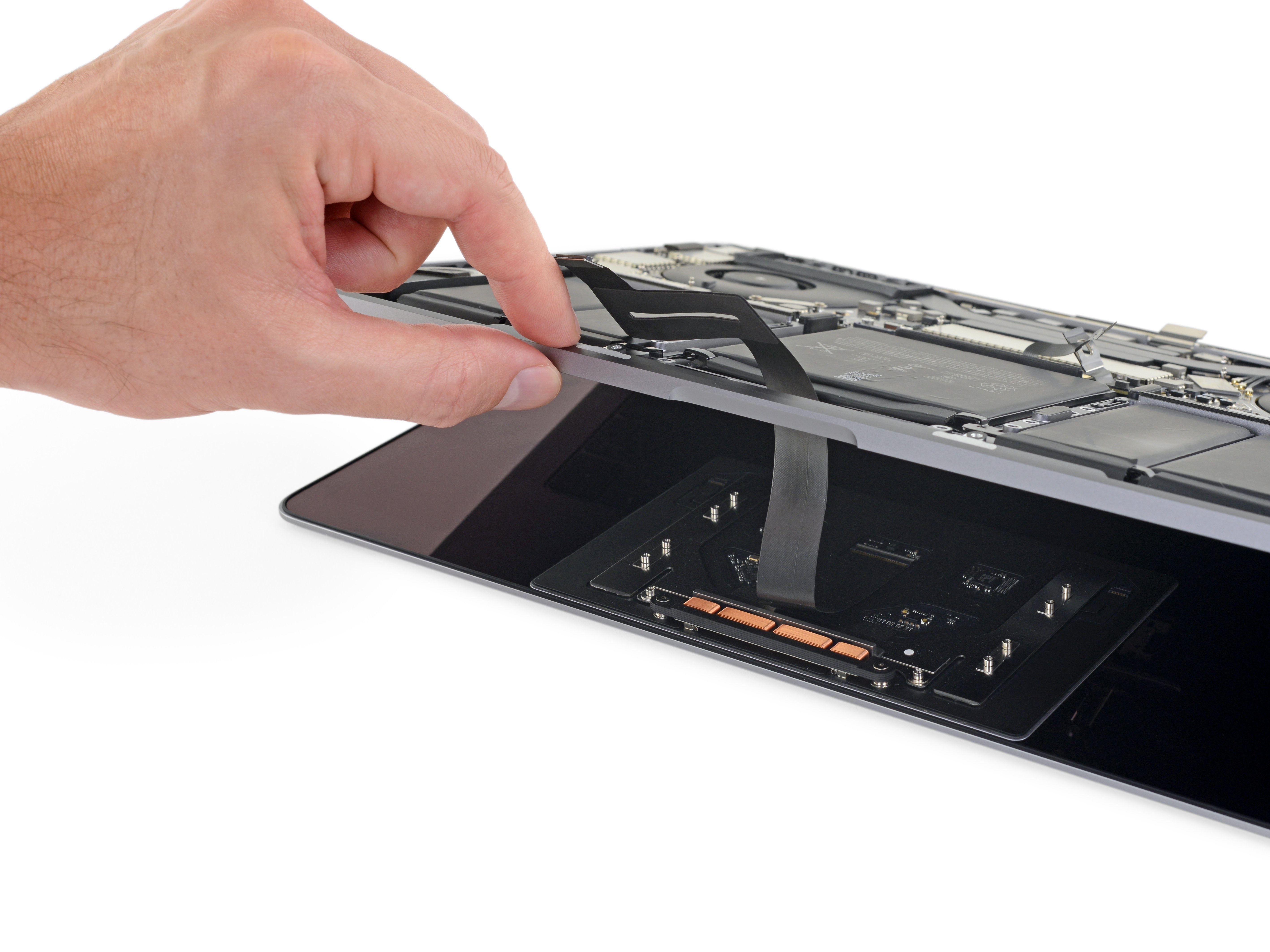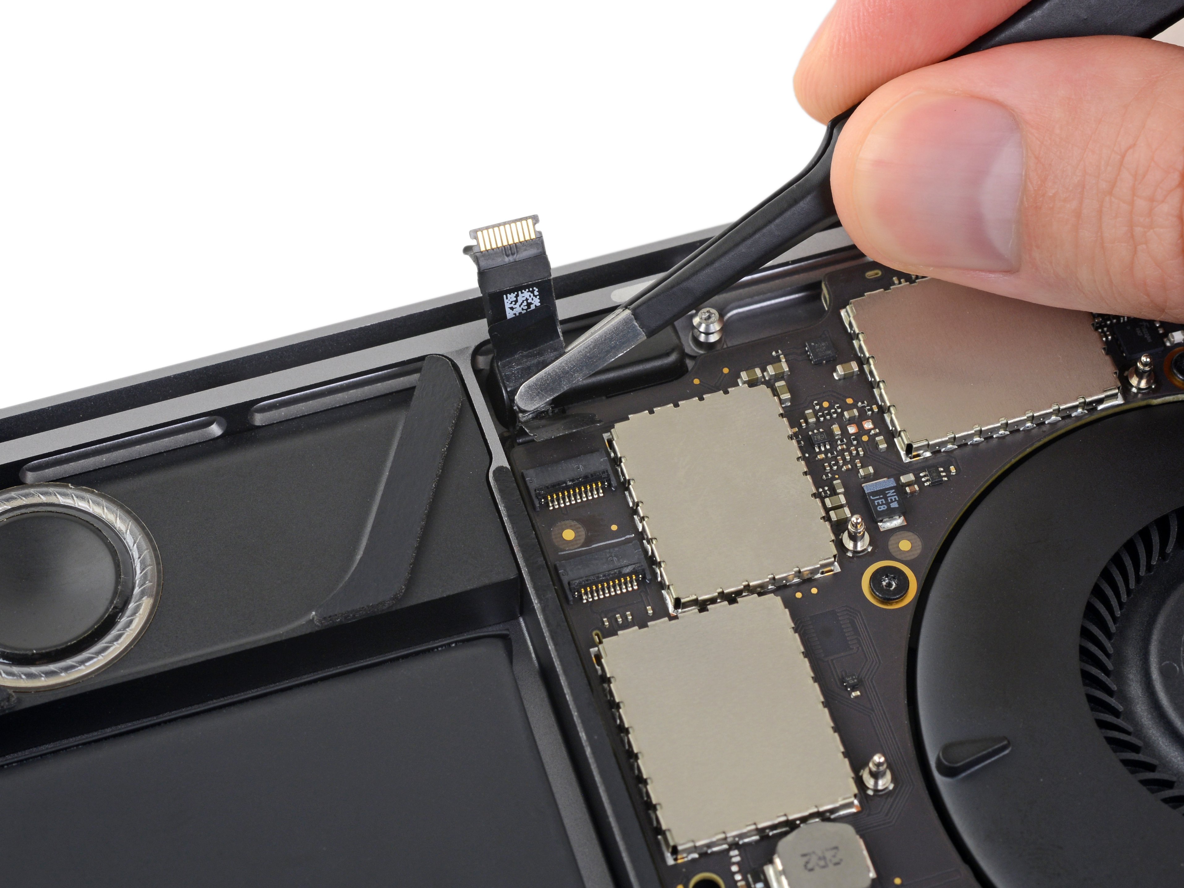 - Use a spudger to disconnect the trackpad ribbon cable by gently prying its connector straight up from the logic board.