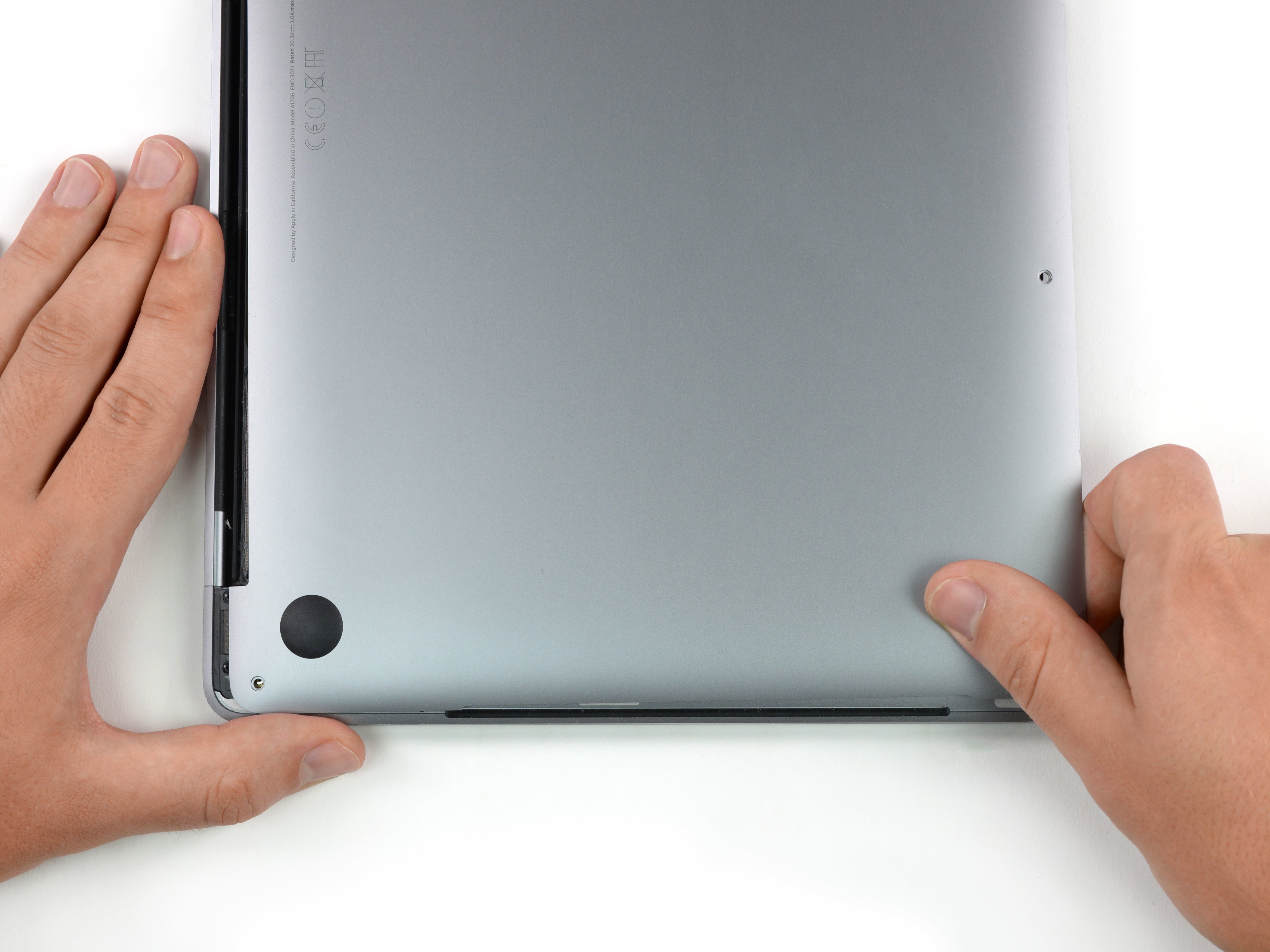 - Pull the lower case firmly towards the front of the MacBook (away from the hinge area) to separate the last of the clips securing the lower case.