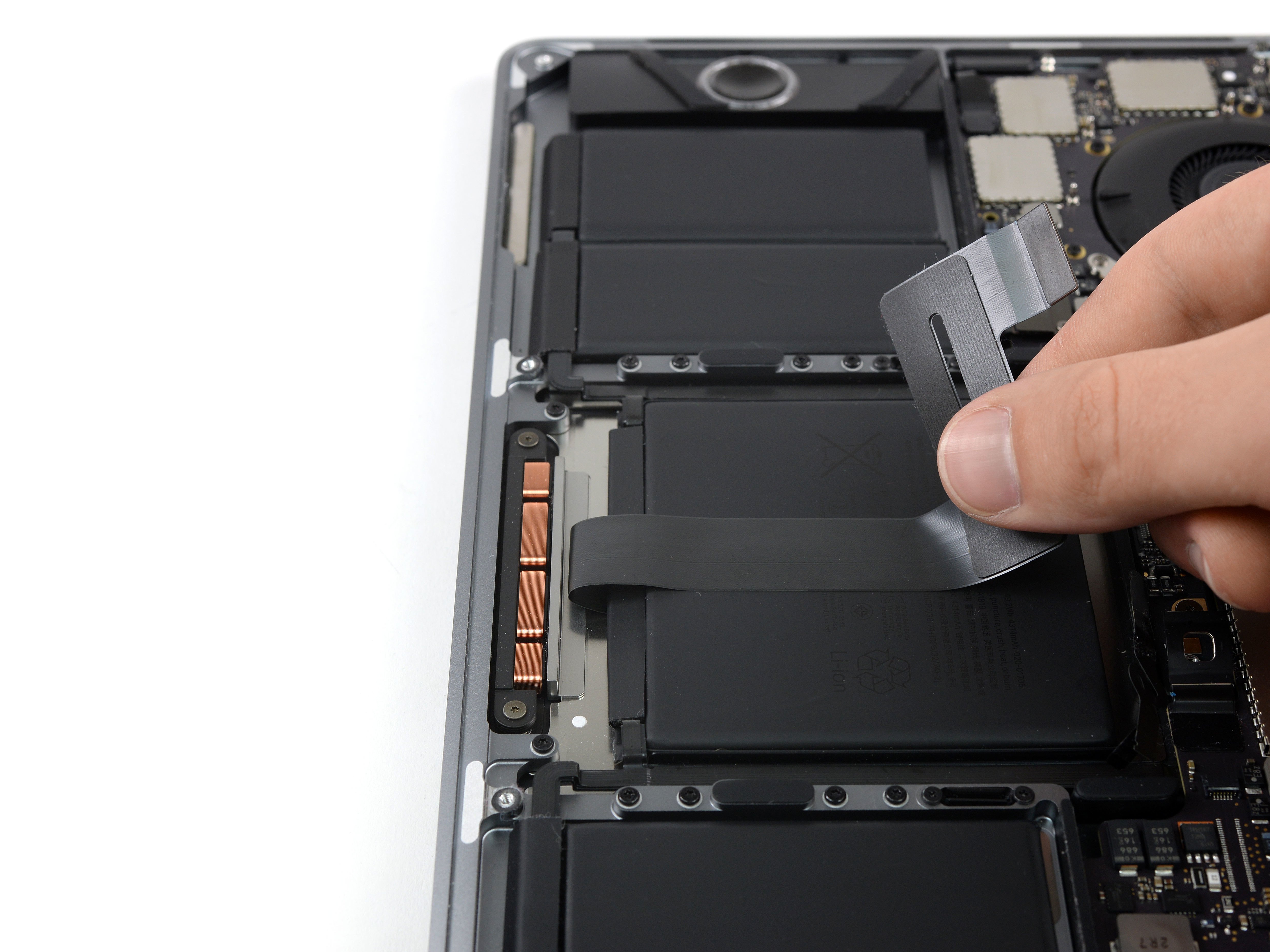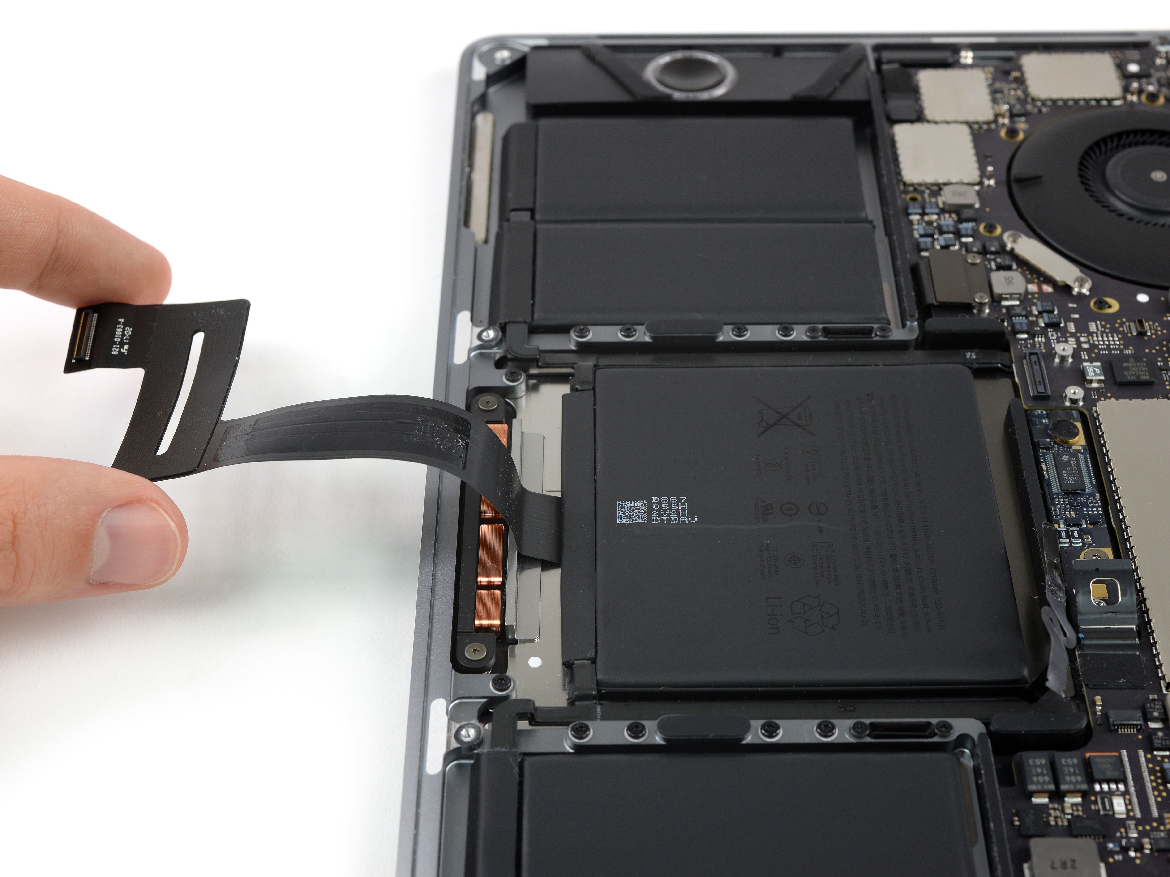 - Carefully peel the trackpad ribbon cable up off the battery, and push it out of the way.