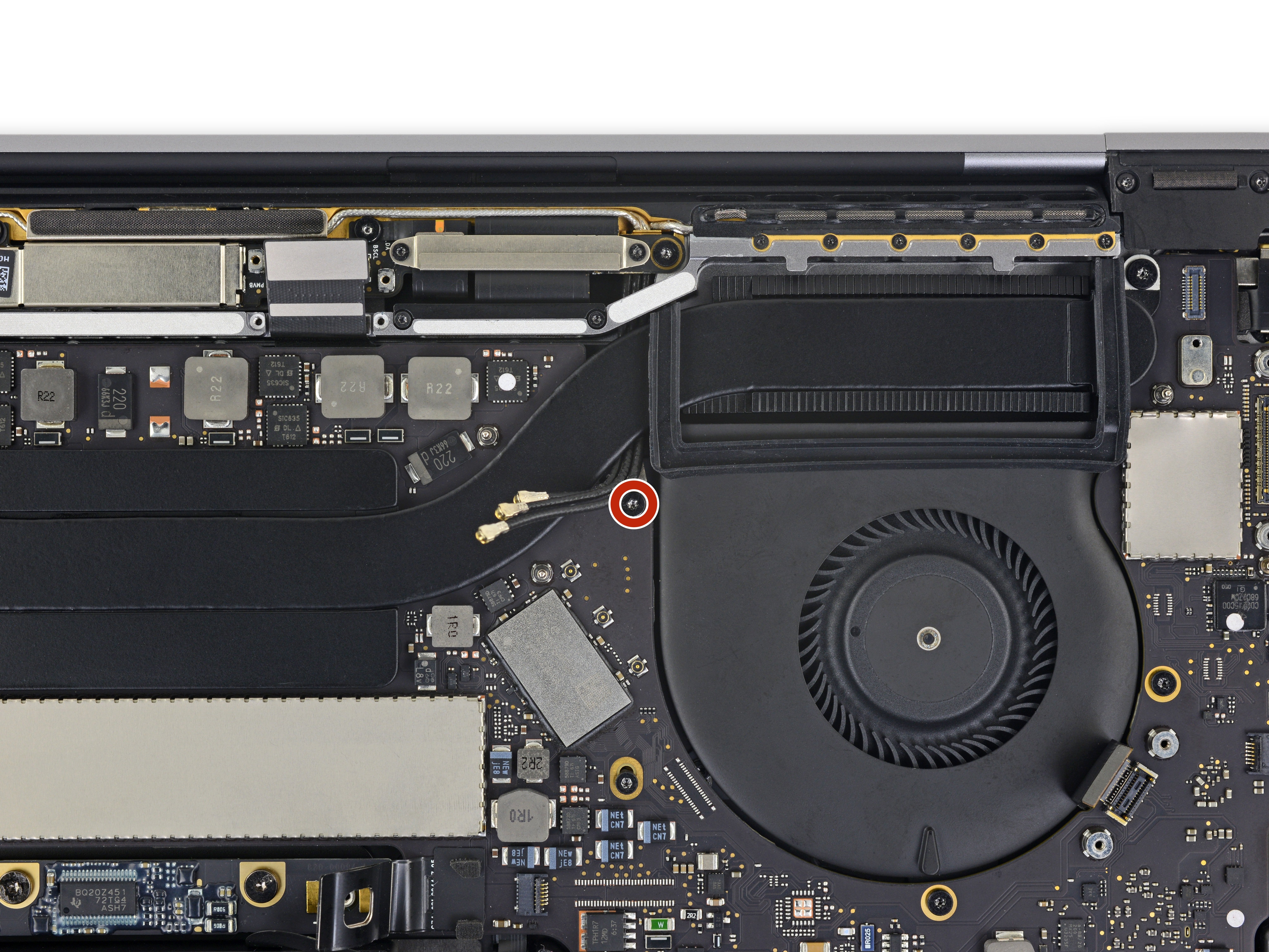 - Use a T5 Torx driver to remove the 2.9 mm screw securing the antenna cable bundle.