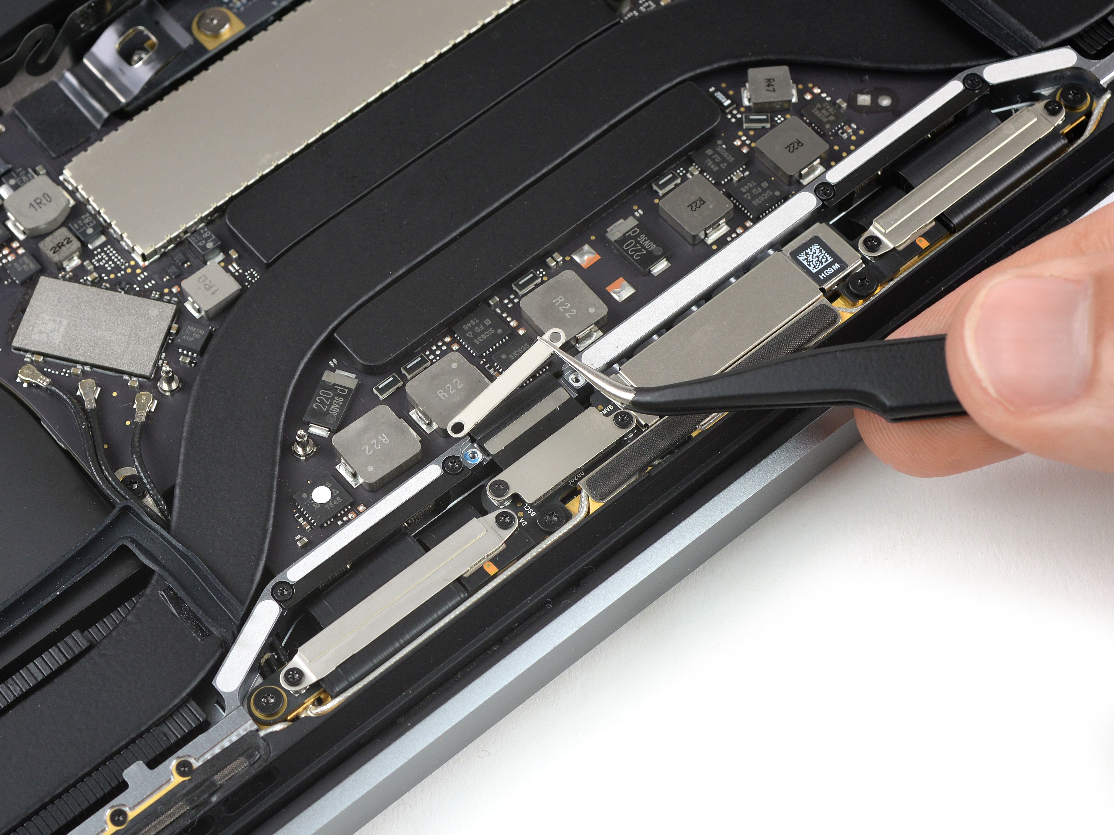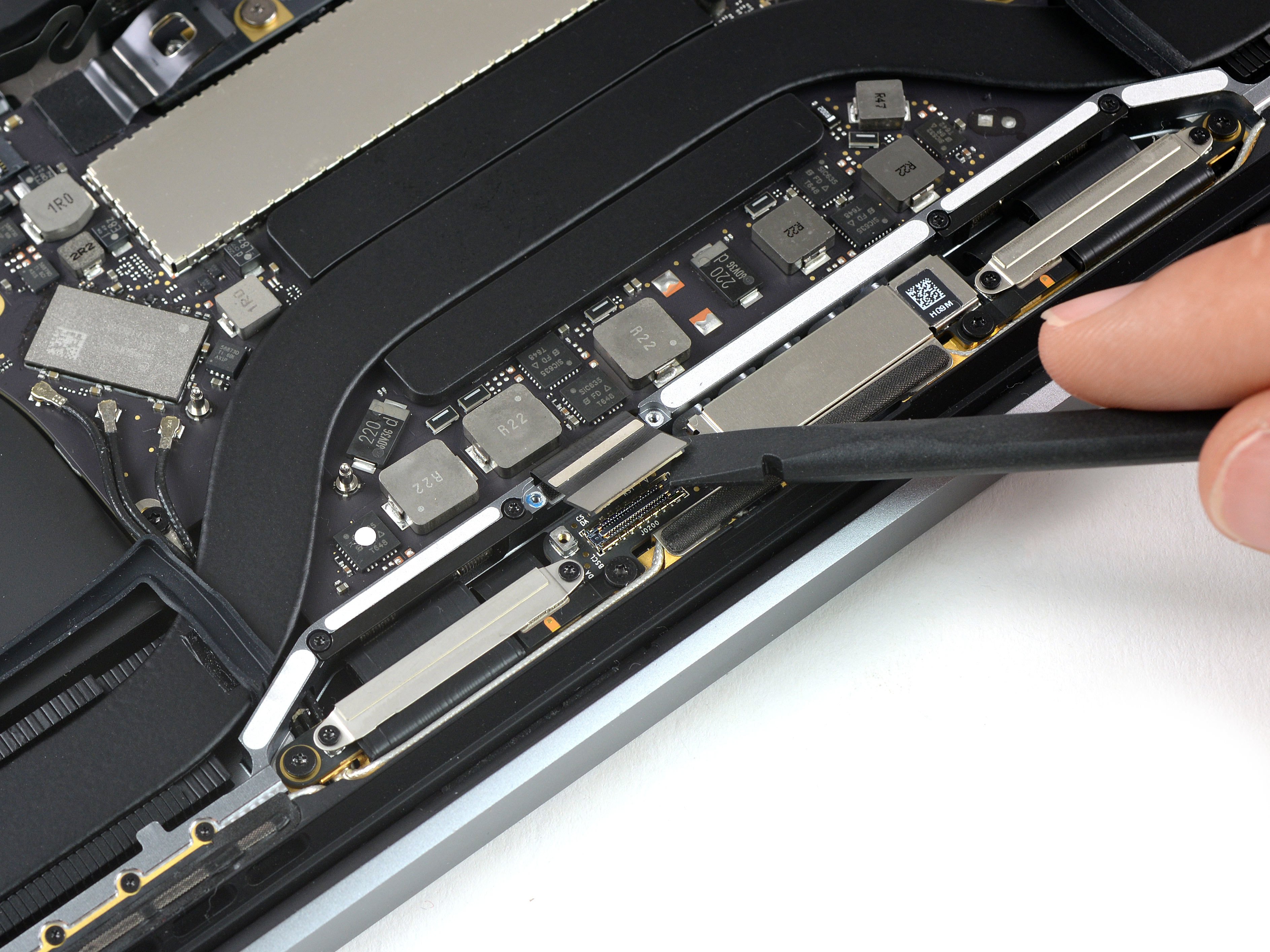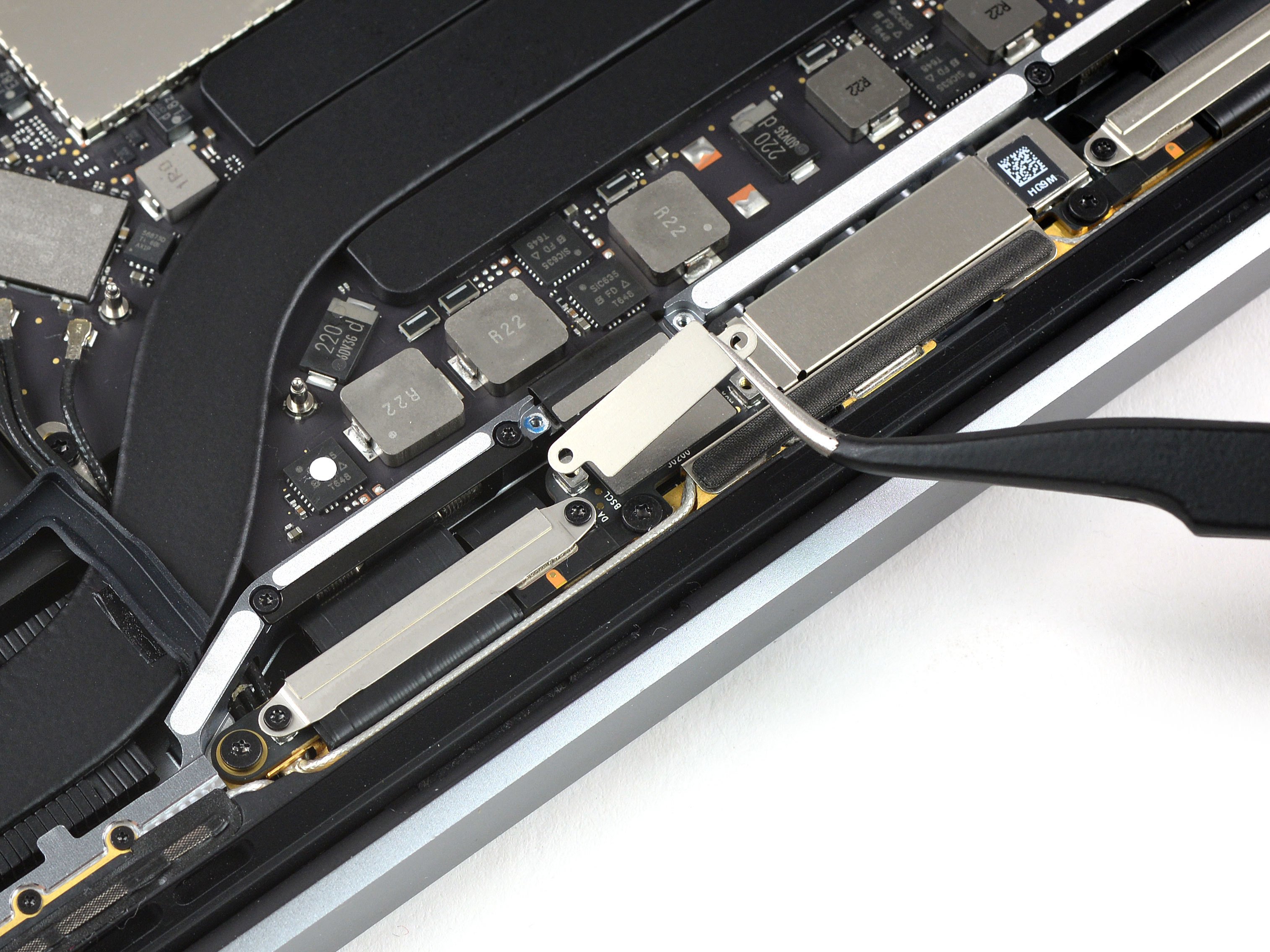 - Remove the two 2.9 mm T3 Torx screws securing the aluminum cover on top of the main display cable.