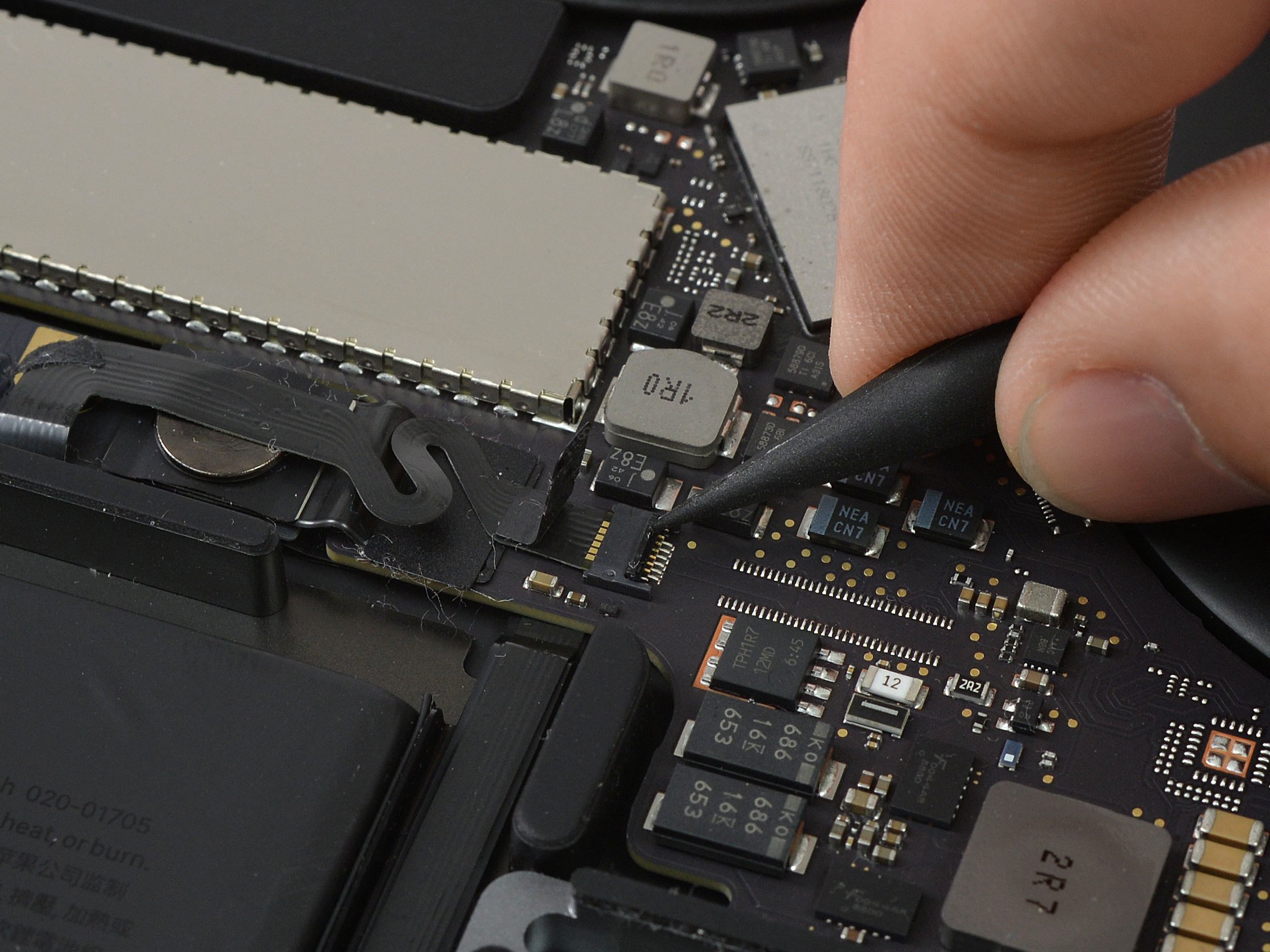 - Use a spudger to disconnect the keyboard connector by prying it straight up from the logic board.