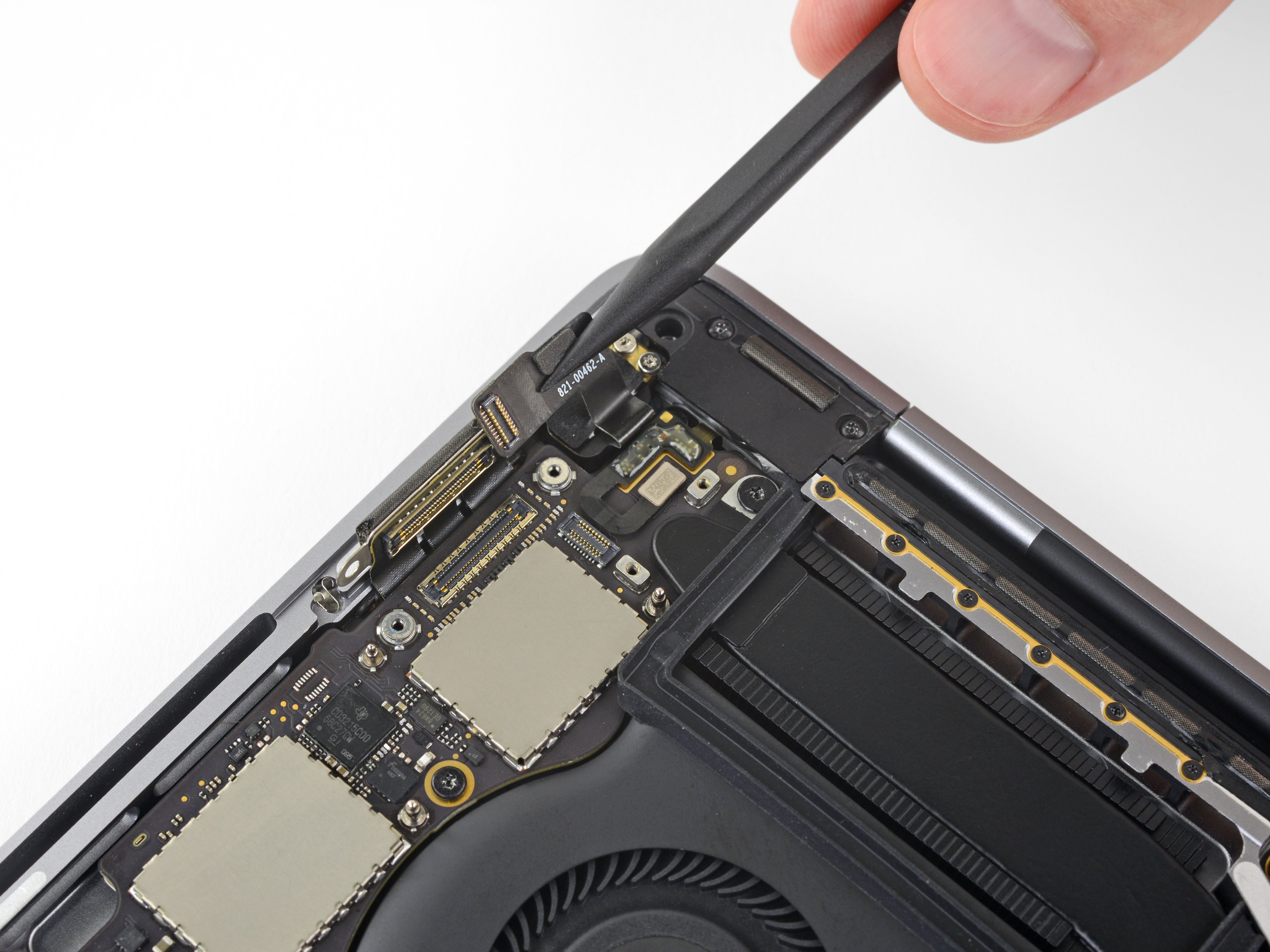 - Use a spudger to disconnect the 3.5 mm audio jack flex cable by prying it straight up from the logic board.