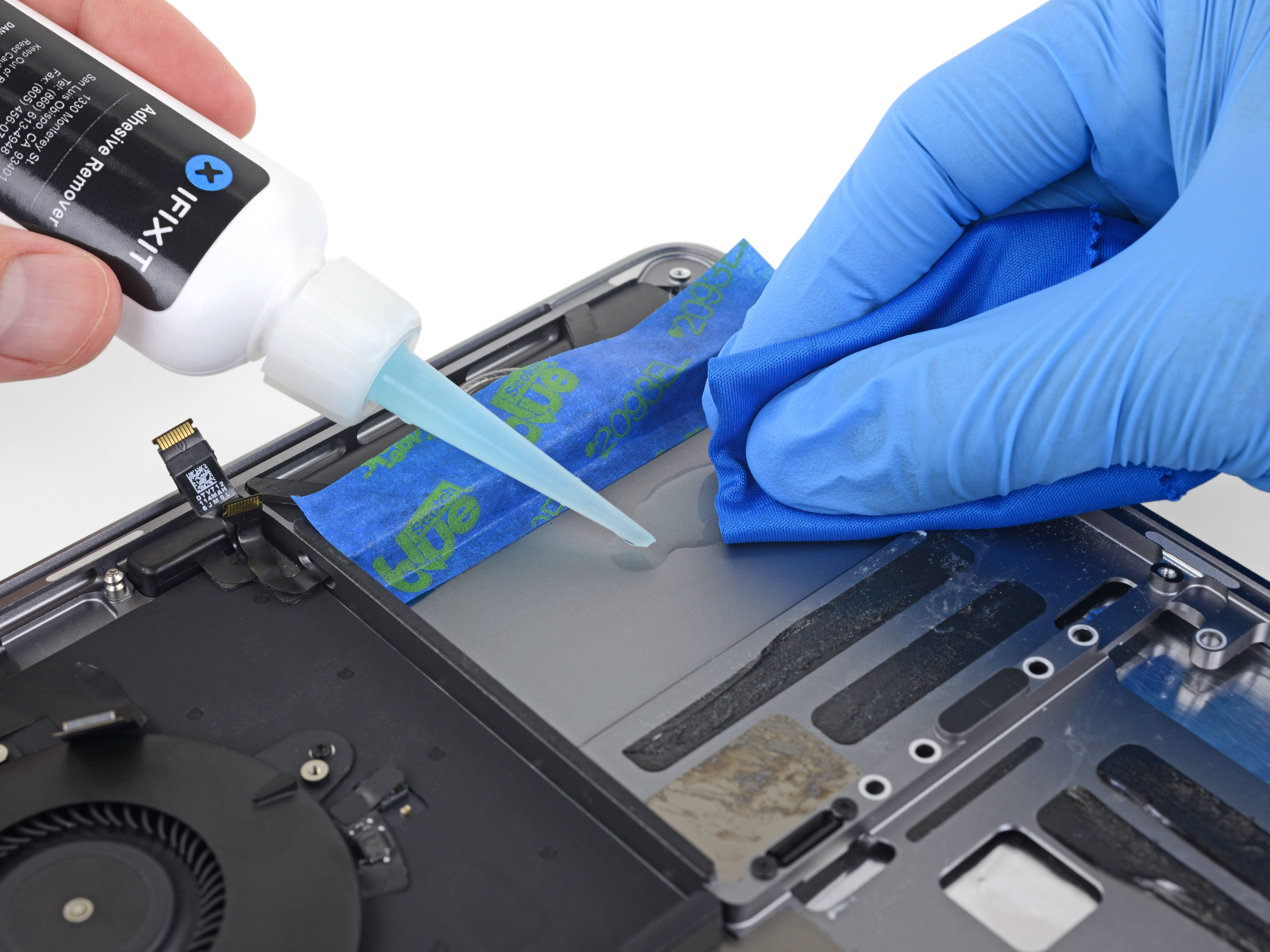 - Additionally, use some tape and/or foil to seal off the area under the trackpad. Optionally, you may also layer an absorbent towel directly underneath the trackpad area to soak up any excess adhesive remover.
