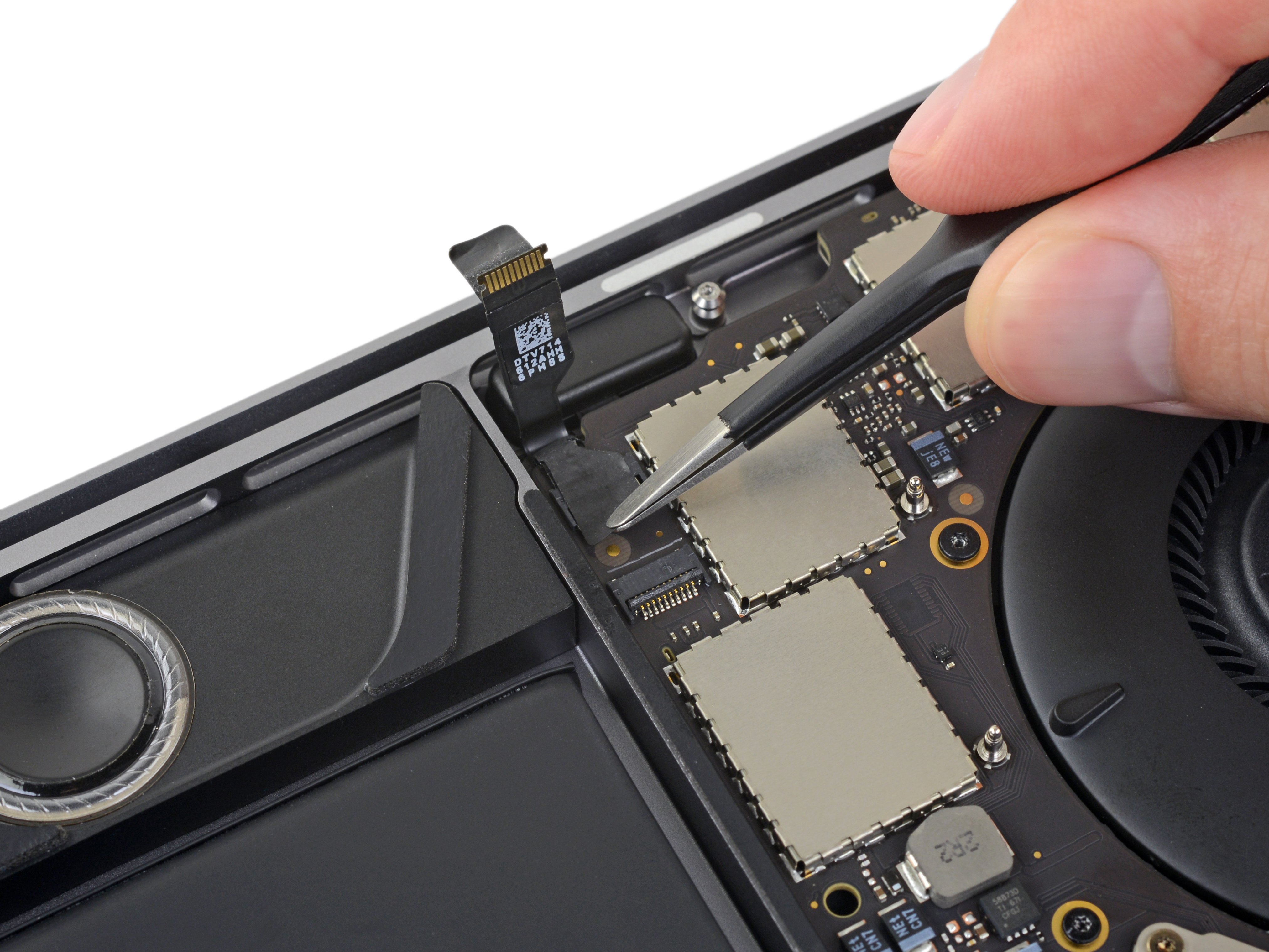 - Use a spudger to disconnect the Touch Bar display connector by prying it straight up from the logic board.