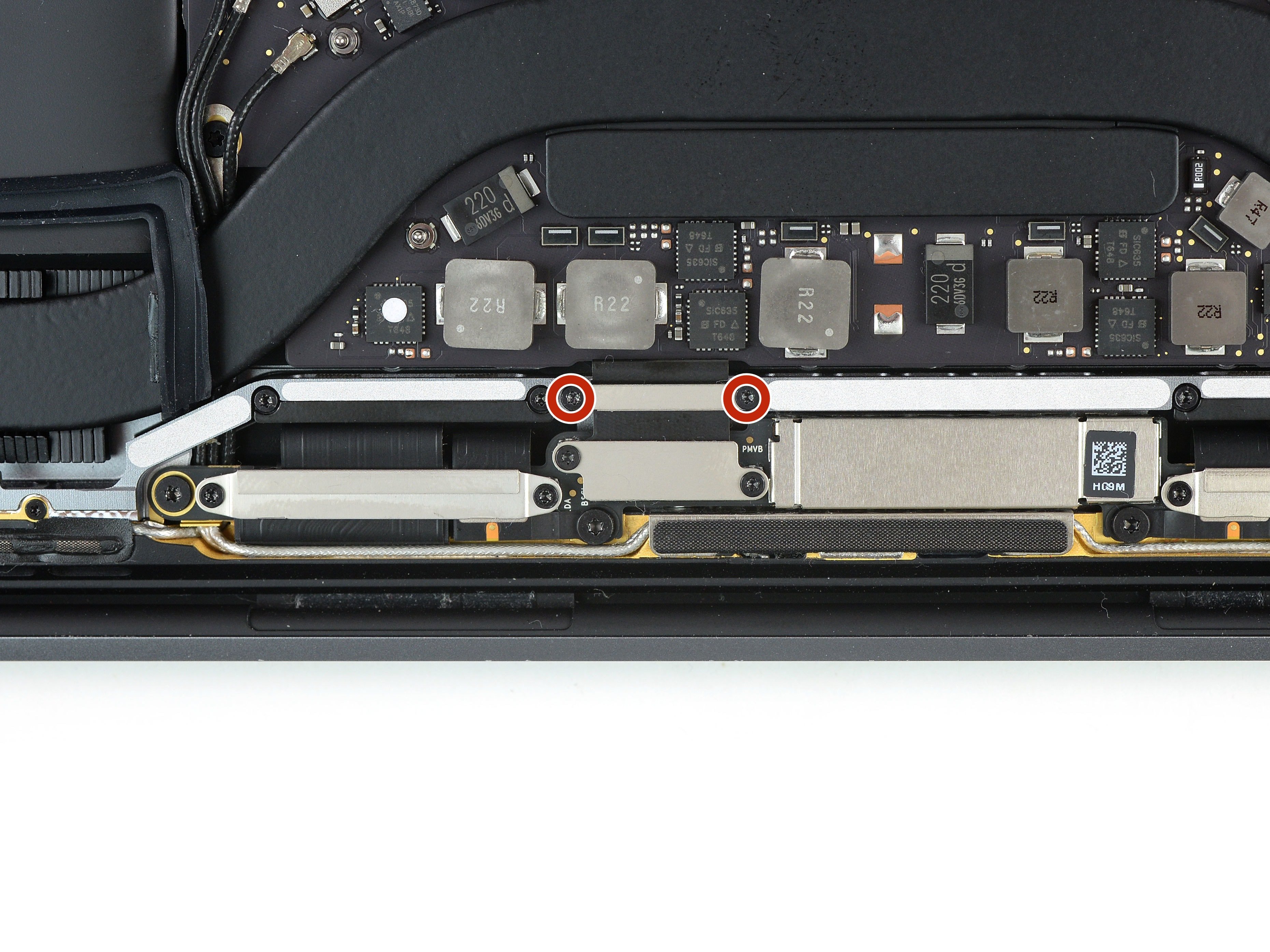 - Use a T3 Torx driver to remove the two 1.9 mm screws from the keyboard connector bracket.