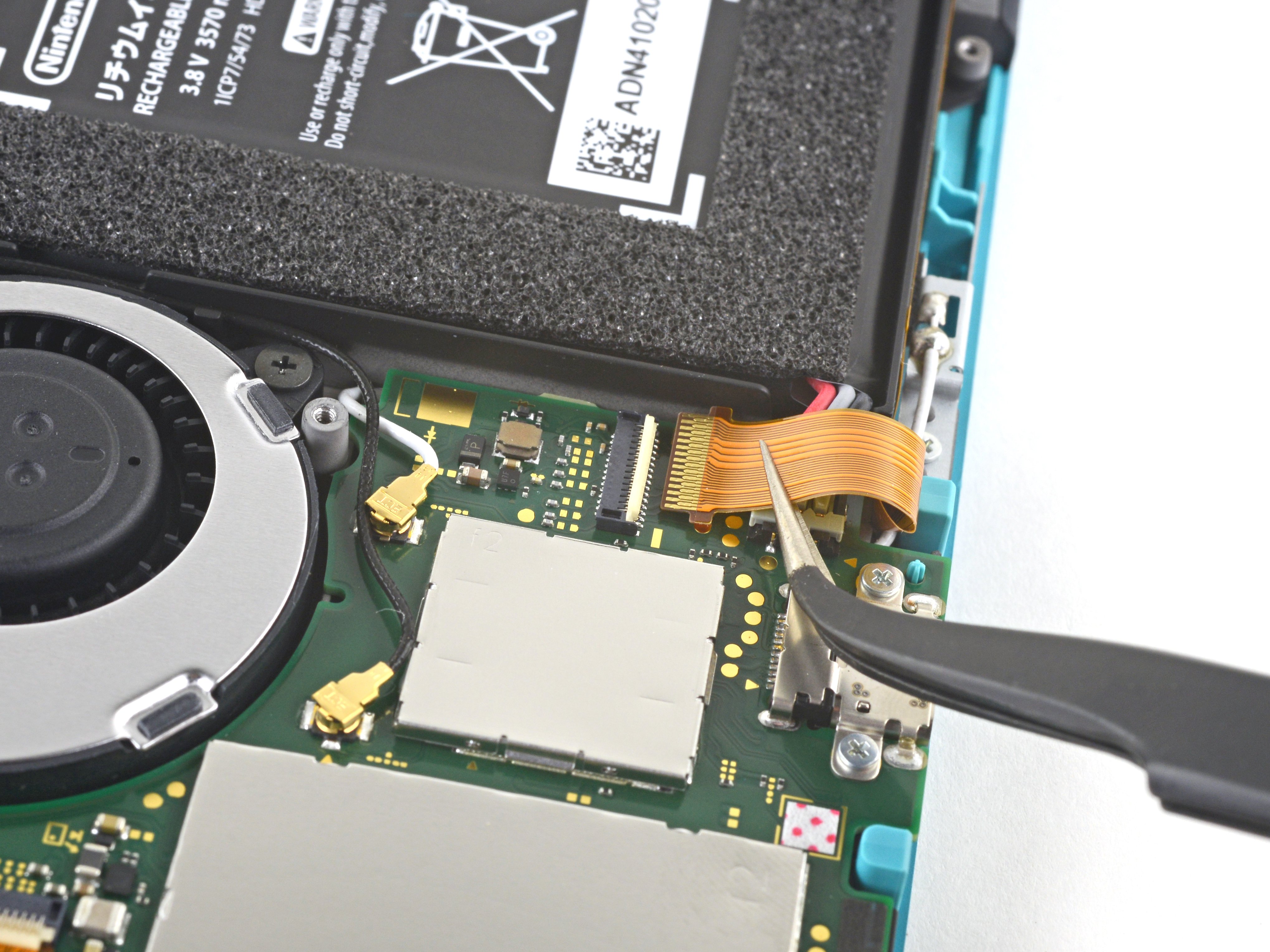 - Use a pair of tweezers or your fingers to carefully lift the game card reader and maneuver it to the left to slide the cable out of its connector.